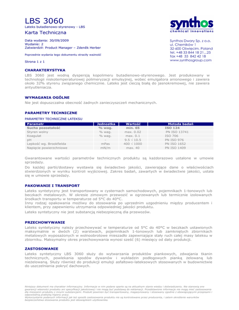 LBS 3060 Lateks butadienowo-styrenowy - LBS Karta Techniczna Data wydania: 30/09/2009 Wydanie: 2 Zatwierdził: Product Manager – Zdeněk Herber Poprzednie wydania tego dokumentu straciły ważność Strona 1 z 1 CHARAKTERYSTYKA LBS 3060 jest wodną dyspersją kopolimeru butadienowo-styrenowego. Jest produkowany w technologii niskotemperaturowej polimeryzacji emulsyjnej, wobec emulgatora anionowego i zawiera około 32% styrenu związanego chemicznie. Lateks jest cieczą białą do jasnokremowej, nie zawiera antyutleniacza. WYMAGANIA OGÓLNE Nie jest dopuszczalna obecność żadnych zanieczyszczeń mechanicznych. PARAMETRY TECHNICZNE PARAMETRY TECHNICZNE LATEKSU Parametr Sucha pozostałość Styren wolny Koagulat pH Lepkość wg. Brookfielda Napięcie powierzchniowe Jednostka % wag. % wag. % wag. mPas mN/m Wartość min. 65 max. 0.02 max. 0.1 9.5 ÷ 10.5 400 ÷ 1000 max. 40 Metoda badań ISO 124 PN ISO 13741 ISO 706 PN ISO 976 PN ISO 1652 PN ISO 1409 Gwarantowane wartości parametrów technicznych produktu są każdorazowo ustalone w umowie sprzedaży. Do każdej partii/dostawy wystawia się świadectwo jakości, zawierające dane o właściwościach stwierdzonych w wyniku kontroli wyjściowej. Zakres badań, zawartych w świadectwie jakości, ustala się w umowie sprzedaży. PAKOWANIE I TRANSPORT Lateks syntetyczny jest transportowany w cysternach samochodowych, pojemnikach 1-tonowych lub beczkach metalowych. W okresie zimowym przewozić w ogrzewanych lub termicznie izolowanych środkach transportu w temperaturze od 5°C do 40°C. Inny rodzaj opakowania możliwy do stosowania po uprzednim uzgodnieniu między producentem i klientem, przy zapewnieniu utrzymania odpowiedniej jakości produktu. Lateks syntetyczny nie jest substancją niebezpieczną dla przewozów. PRZECHOWYWANIE Lateks syntetyczny należy przechowywać w temperaturze od 5°C do 40°C w beczkach ustawionych maksymalnie w dwóch (2) warstwach, pojemnikach 1-tonowych lub zamkniętych zbiornikach metalowych wyposażonych w wolnoobrotowe mieszadło zapewniające stały ruch całej masy lateksu w zbiorniku. Maksymalny okres przechowywania wynosi sześć (6) miesięcy od daty produkcji. ZASTOSOWANIE Lateks syntetyczny LBS 3060 służy do wytwarzania produktów piankowych, zdwajania tkanin technicznych, powlekania spodów dywanów i wykładzin podłogowych pianką żelowaną lub nieżelowaną. Służy również do produkcji emulsji asfaltowo-lateksowych stosowanych w budownictwie do uszczelniania pokryć dachowych. Niniejszy dokument ma charakter informacyjny. Informacje w nim podane oparte są na aktualnym stanie wiedzy i doświadczeniu. Nie stanowią one gwarancji własności produktu ani specyfikacji jakościowej i nie mogą być podstawą do reklamacji. Przedstawione informacje nie mogą mieć zastosowania dla mieszanin produktu z innymi substancjami. Produkt powinien być transportowany, magazynowany i stosowany zgodnie z obowiązującymi przepisami i odpowiednią praktyką higieny pracy. Wykorzystanie podanych informacji jak też sposób zastosowania produktu nie są kontrolowane przez producenta, i zatem określenie warunków bezpieczeństwa stosowania produktu jest obowiązkiem użytkownika.