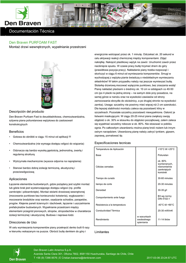 Documentación Técnica Den Braven PURFOAM FAST Montaż drzwi wewnętrznych, wypełnianie przestrzeni Beneficios energicznie wstrząsać przez ok. 1 minutę. Odczekać ok. 20 sekund w celu aktywacji reakcji chemicznej między komponentami. Zdjąć nakrętkę. Nakręcić plastikowy wężyk na zawór. Uruchomić zawór przez naciśnięcie spustu. W czasie pracy butlę trzymać dnem do góry (prawidłowa pozycja pracy). Nakładanie piany trzeba rozpocząć i skończyć w ciągu 6 minut od wymieszania komponentów. Smugi w wychodzącej z wężyka pianie świadczą o niedokładnym wymieszaniu składników! W takim przypadku należy raz jeszcze wymieszać butlę. Stolarkę drzwiową mocować wyłącznie punktowo, bez zraszania wodą! Pianę nakładać plackami o średnicy ok. 10 cm w odstępach co 40-50 cm (po 4 placki na jedną stronę – na samym dole przy posadzce, na samej górze w narożu oraz na wysokości zawiasów od strony zamocowania skrzydła do ościeżnicy, a po drugiej stronie na wysokości zamka). Uwaga: szczeliny nie powinny mieć więcej niż 2 cm szerokości. Dla lepszej stabilności montażu zaleca się pozostawić kliny w szczelinach. Pozostałe szczeliny pozostawić niewypełnione. Osłonić je listwami maskującymi. W ciągu 20-25 minut piana zwiększy swoją objętość o ok. 30% w stosunku do objętości początkowej, zatem zaleca się wypełniać szczeliny robocze w ok. 80%. Nie stosować w pobliżu ognia. Po całkowitym utwardzeniu można pianę kroić nożem lub innym ostrym narzędziem. Utwardzoną pianę należy zakryć tynkiem, gipsem, • Gotowa do obróbki w ciągu 15 minut od aplikacji !!! zaprawą, pomalować itp. • Chemoutwardzalna (nie wymaga dostępu wilgoci do wiązania) Especificaciones tecnicas • Odznacza się bardzo wysoką gęstością, jednorodną, zwartą i regularną strukturą Descripción del producto Den Braven Purfoam Fast to dwuskładnikowa, chemoutwardzalna, sztywna piana poliuretanowa wężykowa do zastosowań konstrukcyjnych Temperatura de Aplicación +10°C till +25°C Base Poliuretan Células cerradas ok. 80% wyrównanych, równomiernie zamkniętych komórek Aplicaciones Tiempo de curado 30-60 minutes Łączenie elementów budowlanych, gdzie pożądany jest szybki montaż lub gdzie brak jest wystarczającego dostępu wilgoci (np. profile zamknięte i półzamknięte). Montaż stolarki drzwiowej wewnętrznej (mocowanie punktowe bez konieczności kotwienia), wygłuszanie i mocowanie brodzików oraz wanien, osadzanie schodów, parapetów, progów. Klejenie paneli ściennych i dachówek, łączenie i uszczelnianie prefabrykatów budowlanych. Wypełnianie przestrzeni między elementami przegród pionowych, stropów, stropodachów w charakterze izolacji termicznej i akustycznej. Budowa i naprawa łodzi. tiempo de corte 20-30 minutes Densidad 30-35 g/l Comportamiento ante fuego B3 wg normy DIN 4102-1 Resistencia a la temperatura -40°C till +90°C Conductividad Térmica 25-30 mW/mK • Wytrzymała mechanicznie (wysoce odporna na naprężenia) • Stanowi bardzo dobrą izolację termiczną, akustyczną i przeciwwilgociową Rendimiento Direcciones de Uso W celu wymieszania komponentów piany przekręcić denko butli 6 razy w kierunku wskazanym na puszce. Obrócić butlę denkiem do góry i w warunkach swobodnego spieniania 11-14 litrów Limitantes Den Braven Latin America S.p.A. Avenida Santa Clara 301, Oficina 7802, 8581150 Huechuraba, Santiago de Chile, Chile T +56 (9) 7266 8576 | E [email protected] 2017-03-06 23:24:57 UTC Documentación Técnica Den Braven PURFOAM FAST Montaż drzwi wewnętrznych, wypełnianie przestrzeni • There is no adhesion to polyethylene, silicone and PTFE • Do not use in locations subject to continuous immersion in water, and a direct effect of solar radiation (protect the surface of the foam after curing) asegurarse de que el producto es el adecuado para el uso para el cual se adquirió. No poseemos influencia en la forma en que se aplique el producto o las circunstancias relacionadas con tal evento durante su almacenamiento o transporte y no aceptaremos ninguna responsabilidad legal por daño. Todas las entregas se realizan de acuerdo a nuestros términos y condiciones generales y han sido archivadas y registradas en la Cámara Holandesa de Comercio. Los preparativos de superficie y acabado Powierzchnie oczyścić i odtłuścić. Powierzchnia musi być czysta, wolna od kurzu, tłuszczu, smaru i innych zanieczyszczeń. Limpieza Do czyszczenia rąk, narzędzi czy powierzchni zaleca się użyć specjalne ściereczki czyszczące Den Braven Bravo. Resztki świeżej piany można także usunąć przy pomocy środka Den Braven Universal PU-Cleaner lub acetonu. Utwardzoną pianę można usunąć tylko mechanicznie lub stosując specjalny środek do usuwania utwardzonej piany Den Braven PUR-Kill. Ręce po zakończeniu pracy myć wodą z mydłem albo przy pomocy środka Den Braven Handfris. Colores • Blue Embalaje • Metal cylinder 400 ml Duracion Przechowywać w oryginalnym opakowaniu, w suchym i chłodnym miejscu w temperaturze +5°C do +25°C. Okres trwałości: 12 miesięcy od daty produkcji. Salud Y Seguridad La ficha de Salud & Seguridad debe ser leída y entendida antes de utilizar el producto. Esta ficha se encuentra disponible a requerimiento a través de la página web de Den Braven. Garantía y Garantía Den Braven garantiza que su producto cumple, dentro de su vida útil especificada con todas sus especificaciones. Renuncia Toda la información contenida en el presente documento y en todas nuestras publicaciones (incluyendo las disponibles vía electrónica) se basa en nuestro conocimiento actual y en nuestra propia experiencia y es propiedad intelectual exclusiva de Den Braven. Este documento no puede ser copiado, mostrado a terceros, reproducido, comunicado públicamente o utilizado en forma alguna sin un consentimiento por escrito de Den Braven. La información técnica contenida en este documento sirve