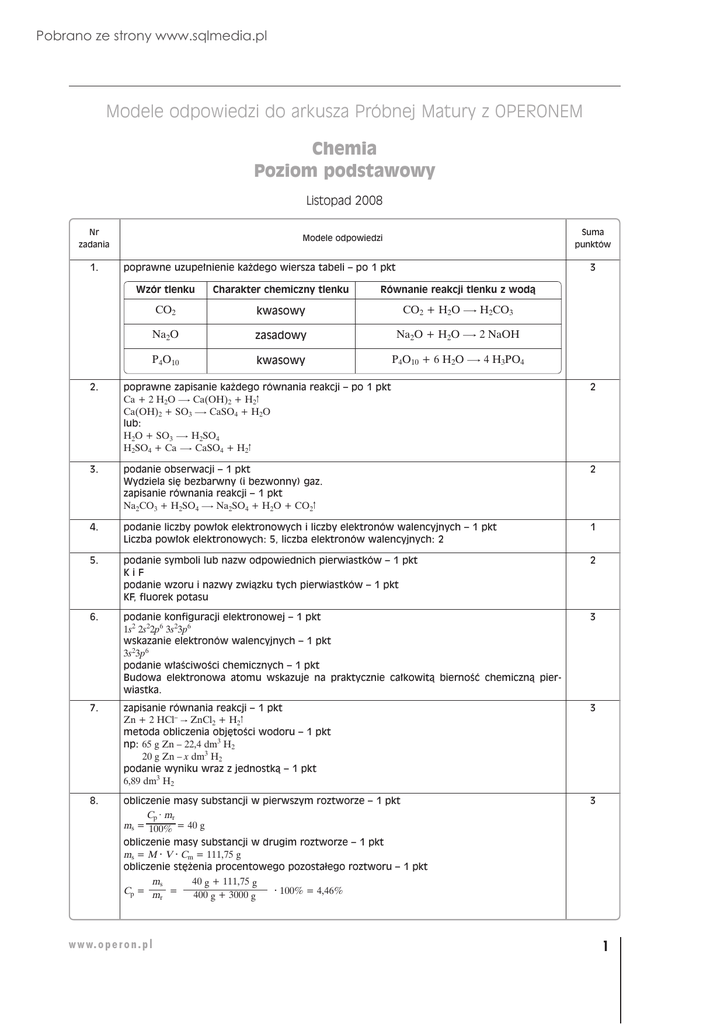 Pobrano ze strony www.sqlmedia.pl Modele odpowiedzi do arkusza Próbnej Matury z OPERONEM Chemia Poziom podstawowy Listopad 2008 Nr zadania 1. Suma punktów Modele odpowiedzi poprawne uzupe∏nienie ka˝dego wiersza tabeli – po 1 pkt 3 Wzór tlenku Charakter chemiczny tlenku Równanie reakcji tlenku z wodà CO2 kwasowy CO2 + H2O $ H2CO3 Na2O zasadowy Na2O + H2O $ 2 NaOH P4O10 kwasowy P4O10 + 6 H2O $ 4 H3PO4 2. poprawne zapisanie ka˝dego równania reakcji – po 1 pkt Ca + 2 H2O $ Ca(OH)2 + H2Ca(OH)2 + SO3 $ CaSO4 + H2O lub: H2O + SO3 $ H2SO4 H2SO4 + Ca $ CaSO4 + H2- 2 3. podanie obserwacji – 1 pkt Wydziela si´ bezbarwny (i bezwonny) gaz. zapisanie równania reakcji – 1 pkt Na2CO3 + H2SO4 $ Na2SO4 + H2O + CO2- 2 4. podanie liczby pow∏ok elektronowych i liczby elektronów walencyjnych – 1 pkt Liczba pow∏ok elektronowych: 5, liczba elektronów walencyjnych: 2 1 5. podanie symboli lub nazw odpowiednich pierwiastków – 1 pkt KiF podanie wzoru i nazwy zwiàzku tych pierwiastków – 1 pkt KF, fluorek potasu 2 6. podanie konfiguracji elektronowej – 1 pkt 1s2 2s22p6 3s23p6 wskazanie elektronów walencyjnych – 1 pkt 3s23p6 podanie w∏aÊciwoÊci chemicznych – 1 pkt Budowa elektronowa atomu wskazuje na praktycznie ca∏kowità biernoÊç chemicznà pierwiastka. 3 7. zapisanie równania reakcji – 1 pkt Zn + 2 HCl– " ZnCl2 + H2metoda obliczenia obj´toÊci wodoru – 1 pkt np: 65 g Zn – 22,4 dm3 H2 20 g Zn – x dm3 H2 podanie wyniku wraz z jednostkà – 1 pkt 6,89 dm3 H2 3 8. obliczenie masy substancji w pierwszym roztworze – 1 pkt Cp · mr ms = 100% = 40 g obliczenie masy substancji w drugim roztworze – 1 pkt ms = M · V · Cm = 111,75 g obliczenie st´˝enia procentowego pozostałego roztworu – 1 pkt 3 ms Cp = m = r w w w. o p e r o n . p l 40 g + 111,75 g 400 g + 3000 g · 100% = 4,46% 1 Pobrano ze strony www.sqlmedia.pl Chemia. Poziom podstawowy Próbna Matura z OPERONEM i „Gazetà Wyborczà” Nr zadania 9. 10. Suma punktów Modele odpowiedzi za napisanie ka˝dego ze wzorów – po 1 pkt Octan etylu: CH3–COOC2H5 Izomer, np: CH3–CH2–CH2–COOH 2 za napisanie ka˝dego równania wraz z podaniem warunków – po 1 pkt 3 a) H3C–CH2–CH=CH2 + H2 b) H3C – CH2 – CH2 Pt Al2O3, temp. OH H3C–CH2–CH2–CH3 H2C–CH2=CH2 + H2O NO2 NO2 c) + HNO3 H2SO4 st., temp. + H2O NO2 11. napisanie wzoru polimeru – 1 pkt –CF2–CF2–CF2–CF2–CF2–CF2–CF2–CF2– 1 12. zapisanie obserwacji – 1 pkt Barwa osadu w probówce zmienia si´ z niebieskiej na czerwonà (pomaraƒczowà). napisanie równania reakcji – 1 pkt 2 Cu(OH)2 + HCHO " Cu2O. + HCOOH + 2 H2O lub 2 Cu(OH)2 + HCHO + NaOH " Cu2O + HCOONa + 3 H2O podanie nazwy procesu – 1 pkt Utlenianie lub dezelektronacja 3 13. podanie wszystkich odpowiedzi – 1 pkt a) 1 mol, b) 2 mole, c) 3 mole 1 14. zapisanie wzoru kwasu – 1 pkt H3C – (CH2)16 – COOH 1 15. obliczenie masy 3 dm3 t∏uszczu – 1 pkt mt∏uszczu = V · d = 2790 g obliczenie masy kwasu – 1 pkt m = 0,52 · mt∏uszczu = 1450,8 g 2 16. podanie wzorów jonów – 1 pkt + + – Fe3+, SO2– 4 , H (lub H3O ), OH zapisanie równania w postaci czàsteczkowej – 1 pkt Fe2(SO4)3 + 6 KOH " 2 Fe(OH)3. + 3 K2SO4 zapisanie równania reakcji w postaci jonowej skróconej – 1 pkt Fe3++ 3 OH– " Fe(OH)3. 3 17. sformu∏owanie wniosku – 1 pkt SzybkoÊç reakcji chemicznej jest zale˝na od st´˝eƒ substratów. Im wi´ksze st´˝enie substratów, tym reakcja przebiega szybciej. podanie poprawnej odpowiedzi – 1 pkt szybkoÊç reakcji wzroÊnie 2 18. napisanie równania reakcji dysocjacji – 1 pkt CH3COOH E CH3COO– + H+ lub CH3COOH + H2O E CH3COO– + H3O+ metoda obliczenia stopnia dysocjacji – 1 pkt podanie wyniku – 1 pkt [H+] α= C · 100% = 1,3% 3 0 w w w. o p e r o n . p l 2 Pobrano ze strony www.sqlmedia.pl Chemia . Poziom podstawowy Próbna Matura z OPERONEM i „Gazetà Wyborczà” Nr zadania 19. Suma punktów Modele odpowiedzi podanie reduktora i utleniacza – 1 pkt 3 VII –I – MnO4– Reduktor: Br , utleniacz: przeprowadzenie bilansu elektronowego – 1 pkt VII II Mn + 5e– " Mn ·2 0 –I 2 Br " Br2 + 2e– · 5 VII –I VII 0 2 Mn + 10 Br " 2 Mn + Br2 zbilansowanie równania redoks – 1 pkt 2 MnO–4 + 10 Br– + 16 H+ " 2 Mn2+ + 5 Br2 + 8 H2O 20. podanie obserwacji w ka˝dym z doÊwiadczeƒ – po 1 pkt Fioletowy roztwór odbarwi∏ si´ w probówce a). W probówce b) z roztworu wytràci∏ si´ brunatny osad. 2 21. poprawne uzupe∏nienie ka˝dego wiersza tabeli – po 1 pkt 3 Typ roztworu 22. Przyk∏ad W∏aÊciwoÊci roztwór w∏aÊciwy roztwór glukozy w wodzie czàstki substancji rozpuszczonej nie sà widoczne go∏ym okiem ani pod mikroskopem koloidalny mg∏a wykazuje efekt Tyndalla zawiesina mieszanina piasku i wody ulega szybkiemu rozdzieleniu si´ na rozpuszczalnik i substancj´ rozpuszczonà podanie ka˝dego ze stopni utlenienia – po 1 pkt N: – III, C: 0 w w w. o p e r o n . p l 2 3