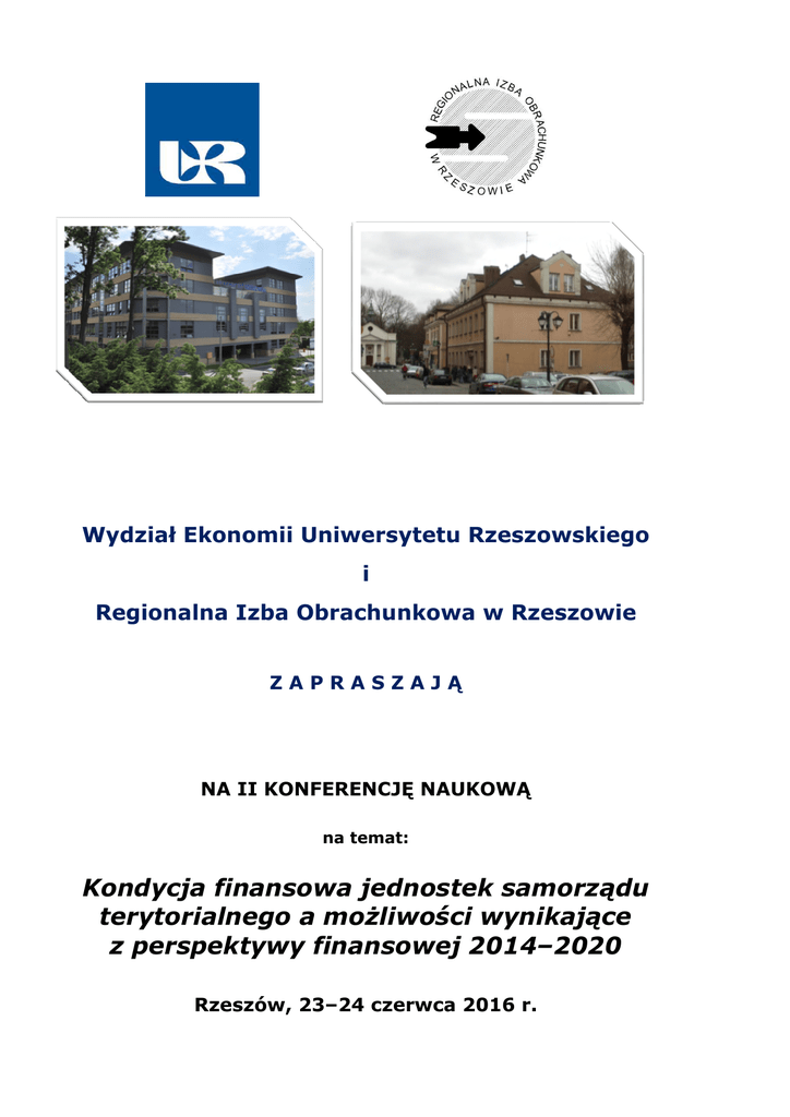 Wydział Ekonomii Uniwersytetu Rzeszowskiego i Regionalna Izba Obrachunkowa w Rzeszowie ZAPRASZAJĄ NA II KONFERENCJĘ NAUKOWĄ na temat: Kondycja finansowa jednostek samorządu terytorialnego a możliwości wynikające z perspektywy finansowej 2014–2020 Rzeszów, 23–24 czerwca 2016 r. Konferencja organizowana przez Wydział Ekonomii Uniwersytetu Rzeszowskiego oraz Regionalną Izbę Obrachunkową w Rzeszowie jest II Konferencją w ramach problematyki dotyczącej gospodarki finansowej jednostek samorządu terytorialnego. Konferencja stwarza możliwości wymiany poglądów naukowych oraz rozwiązań praktycznych w zakresie poprawy zarządzania finansami w sektorze samorządowym. Tematyka konferencji wychodzi naprzeciw aktualnym problemom i wyzwaniom stojącym przed jednostkami samorządu terytorialnego, w aspekcie ciągłego podnoszenia efektywności działania samorządów. Na organizowane spotkanie naukowe w szczególności zapraszamy przedstawicieli nauki zajmujących się problematyką finansów samorządowych, pracowników regionalnych izb obrachunkowych, przedstawicieli jednostek samorządu terytorialnego oraz studentów. TEMATYKA KONFERENCJI Proponowane grupy tematyczne zagadnień: 1. Diagnoza stanu finansowego gmin, powiatów i województw samorządowych na koniec 2015 roku. 2. Struktura przedmiotowa oferty dla jednostek samorządu terytorialnego zawartej w programach finansowych ze środków z budżetu UE (perspektywa 2007–2013) a rzeczywistość. 3. Ocena celowości i efektywności realizacji przedsięwzięć (w tym inwestycji) z udziałem środków unijnych w perspektywie 2007–2013. 4. Możliwości skorzystania z oferty zawartej w perspektywie 2014–2020 w świetle stanu finansów jednostek samorządu terytorialnego i doświadczeń wynikających z wykorzystania środków unijnych w przeszłości. 5. Perspektywy rozwoju regionalnego i lokalnego w świetle kondycji finansowej jednostek samorządowych. KOMITET NAUKOWY KONFERENCJI prof. dr hab. Adam CZUDEC, Uniwersytet Rzeszowski prof. dr hab. Anna HARAŃCZYK, Uniwersytet Ekonomiczny w Krakowie prof. dr hab. Maria KOSEK-WOJNAR, Uniwersytet Ekonomiczny w Krakowie prof. dr hab. Witold KOZIŃSKI, Uniwersytet Rzeszowski prof. dr hab. Krzysztof OPOLSKI, Uniwersytet Warszawski prof. dr hab. Mirosław STEC, Uniwersytet Jagielloński w Krakowie prof. dr hab. Krzysztof SURÓWKA, Uniwersytet Ekonomiczny w Krakowie prof. dr hab. Jerzy WĘCŁAWSKI, Uniwersytet Marii Curie-Skłodowskiej w Lublinie prof. dr hab. Andrzej P. WIATRAK, Uniwersytet Warszawski prof. PW, dr hab. Wojciech GONET, Politechnika Warszawska prof. UR, dr hab. Ryszard KATA, Uniwersytet Rzeszowski prof. UR, dr hab. Antoni MAGDOŃ, Uniwersytet Rzeszowski prof. UwB, dr hab. Marzanna PONIATOWICZ, Uniwersytet w Białymstoku prof. UwB, dr hab. Renata PRZYGODZKA, Uniwersytet w Białymstoku dr Bogdan CYBULSKI, doradca Prezydenta Wrocławia ds. Aglomeracji Wrocławskiej dr Zbigniew K. WÓJCIK, Regionalna Izba Obrachunkowa w Rzeszowie MIEJSCE KONFERENCJI: Wydział Ekonomii Uniwersytetu Rzeszowskiego Ul. Ćwiklińskiej 2 35-601 Rzeszów