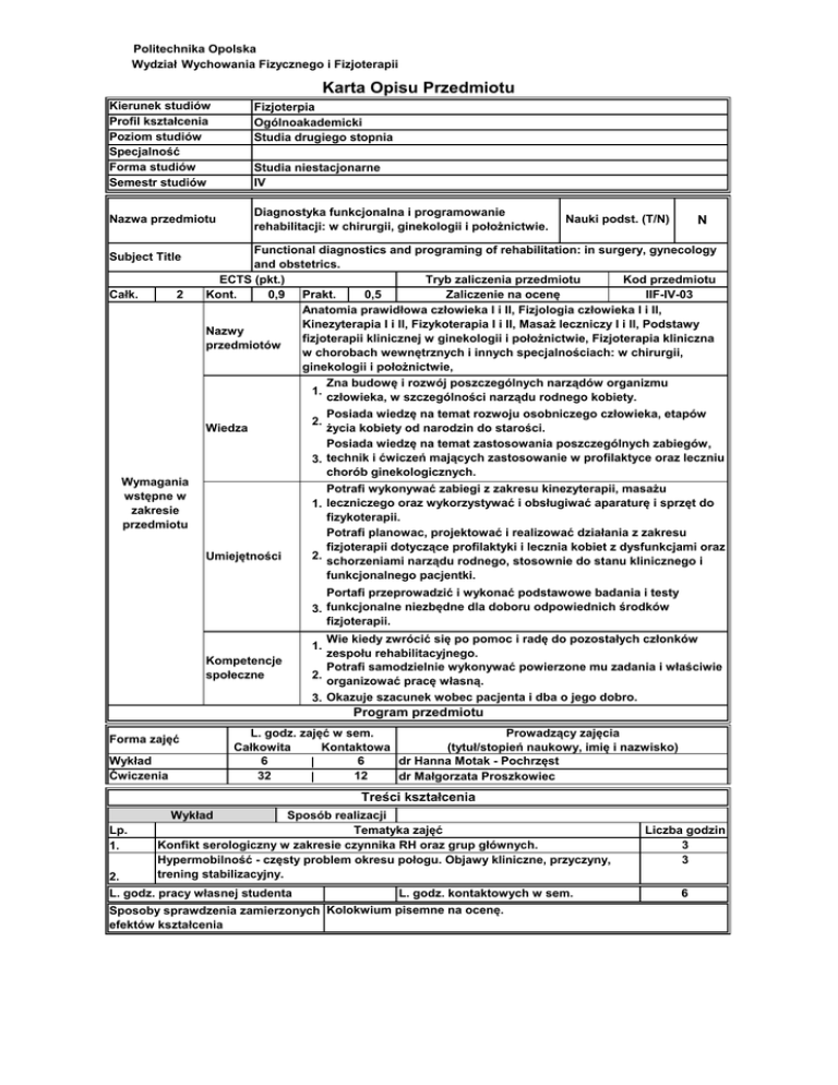 Politechnika Opolska Wydział Wychowania Fizycznego i Fizjoterapii Karta Opisu Przedmiotu Kierunek studiów Profil kształcenia Poziom studiów Specjalność Forma studiów Semestr studiów Fizjoterpia Ogólnoakademicki Studia drugiego stopnia Studia niestacjonarne IV Diagnostyka funkcjonalna i programowanie rehabilitacji: w chirurgii, ginekologii i położnictwie. Nazwa przedmiotu Subject Title Całk. 2 Nauki podst. (T/N) N Functional diagnostics and programing of rehabilitation: in surgery, gynecology and obstetrics. ECTS (pkt.) Tryb zaliczenia przedmiotu Kod przedmiotu Kont. 0,9 Prakt. 0,5 Zaliczenie na ocenę IIF-IV-03 Anatomia prawidłowa człowieka I i II, Fizjologia człowieka I i II, Kinezyterapia I i II, Fizykoterapia I i II, Masaż leczniczy I i II, Podstawy Nazwy fizjoterapii klinicznej w ginekologii i położnictwie, Fizjoterapia kliniczna przedmiotów w chorobach wewnętrznych i innych specjalnościach: w chirurgii, ginekologii i położnictwie, Zna budowę i rozwój poszczególnych narządów organizmu 1. człowieka, w szczególności narządu rodnego kobiety. Wiedza Wymagania wstępne w zakresie przedmiotu Umiejętności Posiada wiedzę na temat rozwoju osobniczego człowieka, etapów życia kobiety od narodzin do starości. Posiada wiedzę na temat zastosowania poszczególnych zabiegów, 3. technik i ćwiczeń mających zastosowanie w profilaktyce oraz leczniu chorób ginekologicznych. 2. Potrafi wykonywać zabiegi z zakresu kinezyterapii, masażu 1. leczniczego oraz wykorzystywać i obsługiwać aparaturę i sprzęt do fizykoterapii. Potrafi planowac, projektować i realizować działania z zakresu fizjoterapii dotyczące profilaktyki i lecznia kobiet z dysfunkcjami oraz 2. schorzeniami narządu rodnego, stosownie do stanu klinicznego i funkcjonalnego pacjentki. Portafi przeprowadzić i wykonać podstawowe badania i testy 3. funkcjonalne niezbędne dla doboru odpowiednich środków fizjoterapii. Wie kiedy zwrócić się po pomoc i radę do pozostałych członków zespołu rehabilitacyjnego. Potrafi samodzielnie wykonywać powierzone mu zadania i właściwie 2. organizować pracę własną. 3. Okazuje szacunek wobec pacjenta i dba o jego dobro. 1. Kompetencje społeczne Program przedmiotu Forma zajęć Wykład Ćwiczenia L. godz. zajęć w sem. Prowadzący zajęcia Całkowita Kontaktowa (tytuł/stopień naukowy, imię i nazwisko) 6 6 dr Hanna Motak - Pochrzęst | 32 12 dr Małgorzata Proszkowiec | Treści kształcenia Wykład Lp. 1. Sposób realizacji Tematyka zajęć Konfikt serologiczny w zakresie czynnika RH oraz grup głównych. Hypermobilność - częsty problem okresu połogu. Objawy kliniczne, przyczyny, trening stabilizacyjny. 2. L. godz. pracy własnej studenta L. godz. kontaktowych w sem. Sposoby sprawdzenia zamierzonych Kolokwium pisemne na ocenę. efektów kształcenia Liczba godzin 3 3 6 Ćwiczenia Lp. 1. 2. Sposób realizacji Zajęcia audytoryjne Tematyka zajęć Zaburzenia płodności: przyczyny, różnice między bezpłodnością i niepłodnością, metody diagnostyczne i postępowanie lecznicze. Diagnostyka w okresie ciąży, badania prenatalne: badania o charakterze inwazyjnym i nieinwazyjnym, wskazania do wykonania. Liczba godzin 1 1 Choroby zakaźne i przenoszone drogą płciową u kobiet ciężarnych: kiła, 1 toksoplazmoza, cytomegalia, wirusowe zapalenie wątroby, ospa wietrzna, różyczka, odra i świnka. Zagrożenia jakie ze sobą niosą dla ciężarnej i dziecka. Diagnostyka i profilaktyka nowotworu gruczołu piersiowego: mammografia, USG. 1 4. Postępowanie fizjoterapeutyczne - przygotowaniem do zabiegu mastektomii. Mastektomia, rodzaje ingerencji chirurgicznych, usprawnianie fizjoterapeutyczne 1 5. po zabiegu. Zabieg rekonstrukcji piersi, kiedy jest stosowany, metody rekonstrukcji. 1 6. Usprawnianie fizjoterapeutyczne przed i po zabiegu. Profilaktyka nowotworu szyjki macicy i jego diagnostyka: kolposkopia, 1 7. cytodiagnostyka, biopsja, badania dodatkowe. 8. Nowotwór szyjki macicy - leczenie oraz programowanie rehabilitacji po zabiegu 1 Profilaktyka i badania diagnostyczne w przypadku nowotworu jajnika. Leczenie 1 9. oraz usprawnianie fizjoterapeutyczne. Programowanie rehabilitacji u kobiet po leczeniu onkologicznym w poznanych 2 10. jednostkach chorobowych – praca studentów. 11. Końcowe kolokwium zaliczeniowe. 1 L. godz. pracy własnej studenta 20 L. godz. kontaktowych w sem. 12 Wykonanie i przedstawienie konspektu usprawniania pacjenta. Sposoby sprawdzenia zamierzonych Kolokwium zaliczeniowe w formie testu (pytania zamknięte i efektów kształcenia otwarte). KF_W04 posiada poszerzoną wiedzę na temat budowy 1. anatomicznej organizmu człowieka w ujęciu czynnościowym 3. KF_W05 posiada wiedzę z zakresu zasad doboru, wykonania i 2. interpretacji testów funkcjonalnych oraz badań dodatkowych Wiedza KF_W06 objaśnia związek przyczynowo-skutkowy objawów 3. klinicznych, tłumaczy patomorfologię oraz przebieg wybranych zaburzeń i jednostek chorobowych KF_W13: zna zasady planowania, prowadzenia i modyfikowania postępowania fizjoterapeutycznego w oparciu dowody naukowe KF_U06 potrafi zobrazować pacjentowi istotę jego dysfunkcji 1. i uzasadnić konieczność podjęcia właściwego leczenia Efekty kształcenia dla przedmiotu - po zakończonym cyklu kształcenia Umiejętności Kompetencje społeczne KF_U11 potrafi przeprowadzić badania funkcjonalne, 2. diagnostykę różnicową oraz zinterpretować wyniki badań dodatkowych KF_U12 potrafi właściwie zaplanować proces fizjoterapii w 3. oparciu o zróżnicowanie objawów klinicznych i analizę mechanizmów ich powstawania KF_U17 kontroluje jakość prowadzonego postępowania 4. fizjoterapeutycznego, identyfikuje błędy i zaniedbania w praktyce oraz charakteryzuje ich negatywne konsekwencje KF_K07 potrafi samodzielnie wykonywać powierzone mu 1. zadania oraz zorganizować pracę zespołu terapeutycznego KF_K08 określa priorytety i przestrzega zasad etycznych w 2. podejmowanych decyzjac