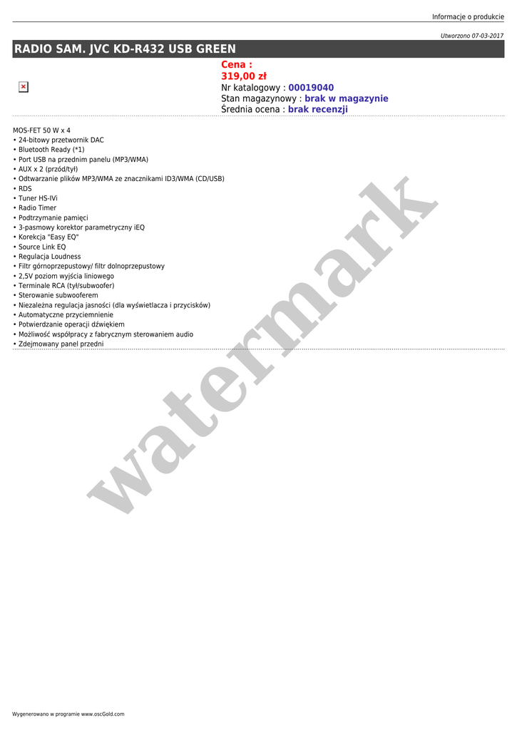 Informacje o produkcie Utworzono 07-03-2017 RADIO SAM. JVC KD-R432 USB GREEN Cena : 319,00 zł Nr katalogowy : 00019040 Stan magazynowy : brak w magazynie Średnia ocena : brak recenzji w at er m ar k MOS-FET 50 W x 4 • 24-bitowy przetwornik DAC • Bluetooth Ready (*1) • Port USB na przednim panelu (MP3/WMA) • AUX x 2 (przód/tył) • Odtwarzanie plików MP3/WMA ze znacznikami ID3/WMA (CD/USB) • RDS • Tuner HS-IVi • Radio Timer • Podtrzymanie pamięci • 3-pasmowy korektor parametryczny iEQ • Korekcja "Easy EQ" • Source Link EQ • Regulacja Loudness • Filtr górnoprzepustowy/ filtr dolnoprzepustowy • 2,5V poziom wyjścia liniowego • Terminale RCA (tył/subwoofer) • Sterowanie subwooferem • Niezależna regulacja jasności (dla wyświetlacza i przycisków) • Automatyczne przyciemnienie • Potwierdzanie operacji dźwiękiem • Możliwość współpracy z fabrycznym sterowaniem audio • Zdejmowany panel przedni Wygenerowano w programie www.oscGold.com