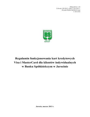 Załącznik nr 1 do Uchwały 205/2013 z dnia 27.03.2013 r. Zarządu Banku Spółdzielczego w Jarocinie Regulamin funkcjonowania kart kredytowych Visa i MasterCard dla klientów indywidualnych w Banku Spółdzielczym w Jarocinie Jarocin, marzec 2013 r. SPIS TREŚCI Rozdział 1. Postanowienia ogólne .............................................................................................. 2 Rozdział 2. Wydawanie i wznawianie kart oraz wysyłka PIN ................................................... 7 Rozdział 3. Posługiwanie się kartą i korzystanie z limitu kredytowego .................................... 9 Rozdział 4. Wygaśnięcie prawa do używania karty ................................................................. 13 Rozdział 5. Rozliczanie transakcji. Spłata zadłużenia ............................................................. 14 Rozdział 6. Opłaty, prowizje i oprocentowanie ....................................................................... 16 Rozdział 7. Zastrzeganie kart ................................................................................................... 17 Rozdział 8. Zasady odpowiedzialności za operacje dokonane przy użyciu kart ...................... 18 Rozdział 9. Reklamacje ............................................................................................................ 20 Rozdział 10. Taryfa prowizji i opłat ......................................................................................... 21 Rozdział 11. Zmiana umowy o kartę i regulaminu .................................................................. 21 Rozdział 12. Rozwiązanie i wygaśnięcie umowy o kartę ........................................................ 23 Załącznik nr 1 - Standardowe limity dzienne wypłat gotówki i operacji bezgotówkowych dla kart kredytowych Visa i MasterCard Załącznik nr 2 - Zasady funkcjonowania usługi 3D-Secure w Banku Spółdzielczym w Jarocinie 1 Rozdział 1 Postanowienia ogólne §1 Niniejszy „Regulamin funkcjonowania kart kredytowych Visa i MasterCard dla klientów indywidualnych w Banku Spółdzielczym w Jarocinie.”, zwany dalej regulaminem, określa zasady: 1) wydawania kart kredytowych dla klientów indywidualnych: Visa i MasterCard, 2) udzielania kredytu wykorzystywanego przy użyciu wyżej wymienionych kart, 3) korzystania z wyżej wymienionych kart kredytowych. §2 Poprzez użyte w regulaminie określenia należy rozumieć: 1) adres elektroniczny – oznaczenie systemu teleinformatycznego umożliwiającego porozumiewanie się za pomocą środków komunikacji elektronicznej, w szczególności adresu poczty elektronicznej, 2) agent rozliczeniowy – bank lub instytucję kredytową prowadzącą działalność określoną w ustawie o usługach płatniczych, w zakresie zawierania umów z akceptantami o przyjmowanie zapłaty przy użyciu instrumentów płatniczych, w tym elektronicznych instrumentów płatniczych albo instytucję płatniczą, która uzyskała zezwolenie na prowadzenie takiej działalności, 3) agent rozliczeniowy banku – agenta rozliczeniowego, za pośrednictwem którego bank dokonuje rozliczeń transakcji dokonanych przy użyciu elektronicznych instrumentów płatniczych wydanych przez bank, 4) akceptant – przedsiębiorcę, który zawarł z agentem rozliczeniowym umowę o przyjmowanie zapłaty przy użyciu elektronicznych instrumentów płatniczych, 5) autoryzacja - zgodę na dokonanie transakcji płatniczej udzieloną przez posiadacza karty lub użytkownika karty w sposób określony w regulaminie lub umowie, 6) bank/dostawca posiadacza karty – Bank Spółdzielczy w Jarocinie, 7) bank spółdzielczy – bank spółdzielczy, który zawarł z SGB-Bankiem S.A. umowę o współpracy, w zakresie wydawania kart płatniczych, 8) bankomat – urządzenie umożliwiające posiadaczowi karty/użytkownikowi karty płatniczej podejmowanie gotówki za pomocą karty płatniczej lub dodatkowo dokonywanie innych operacji, 9) bazy danych - zbiory danych prowadzone dla celów oceny ryzyka kredytowego przez instytucje, o których mowa w art. 105 ust. 4 ustawy z dnia 29 sierpnia 1997 r. – Prawo bankowe (t.j. Dz. U. z 2002 r. Nr 72, poz. 665 z późn. zm.) oraz biura informacji gospodarczej, o których mowa w ustawie z dnia 9 kwietnia 2010 r. o udostępnianiu informacji gospodarczych i wymianie danych gospodarczych(Dz. U. Nr 81, poz. 530 z późn. zm.), 10) całkowity koszt kredytu - wszelkie koszty, znane bankowi na dzień zawarcia umowy, do poniesienia których został zobowiązany kredytobiorca w związku z zawartą umową, z wyjątkiem kosztów opłat notarialnych ponoszonych przez kredytobiorcę, 11) całkowita kwota kredytu - sumę wszystkich środków pieniężnych, które bank udostępnia kredytobiorcy w formie limitu kredytowego na podstawie zawartej umowy, 12) całkowita kwota do zapłaty - sumę całkowitego kosztu kredytu i całkowitej kwoty kredytu, 13) cykl rozliczeniowy – okres miesięczny liczony od dnia następnego po oznaczonym przez kredytobiorcę dniu w miesiącu jako dzień rozliczenia do dnia rozliczenia włącznie, po zakończeniu którego generowane jest zestawienie transakcji, 14) data waluty (data księgowania) – dzień, w którym obciążono lub uznano rachunek karty kwotą środków pieniężnych od którego lub do którego bank nalicza odsetki od środków pieniężnych, 2 15) dni robocze – wszystkie dni tygodnia, z wyjątkiem sobót oraz dni określonych w powszechnie obowiązujących przepisach, jako dni wolne od pracy, w których bank prowadzi swoją działalność i w którym działa system płatności, 16) dzienna kwota operacji – dzienna suma kwot operacji, które mogą być dokonane przy użyciu karty w danym dniu, do wysokości niewykorzystanego limitu kredytowego; dzienna kwota operacji nie może być wyższa niż limit dzienny wypłat gotówki i operacji bezgotówkowych, 17) dzień rozliczeniowy – określony przez posiadacza karty ostatni dzień cykl