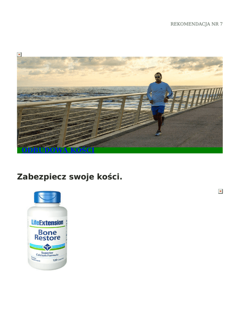 REKOMENDACJA NR 7 ODBUDOWA KOŚCI Zabezpiecz swoje kości. REKOMENDACJA NR 7 Dlaczego kobiety i mężczyźni, biorący suplementy wapnia, nadal cierpią na utratę mineralnej gęstości kości? Jednym z powodów jest to, że większość ludzi nie bierze wystarczającej ilości wapnia, aby uzupełnić naturalne straty w procesie normalnego starzenia. Innym problemem często pomijanym przez większość lekarzy jest fakt, że utrata gęstości kości nie jest tylko powiązana z niedoborem wapnia, ale również z niedoborem wielu innych środków odżywczych włącznie z magnezem i witaminą D3. [1-6] Aby wapń pomógł w utrzymaniu zdrowych kości potrzebne są adekwatne ilości witaminy D3, [3, 7] cynku, [8-10] magnezu, [11] manganu [12] i innych środków odżywczych, aby wapń i fosfor mogły być wbudowywane do kości. Poza tym, wiele form wapnia nie jest dobrze absorbowanych. [13, 15] Podczas gdy utrata mineralnej gęstości kości bardziej dotyka kobiet, to starzejący się mężczyźni też mogą cierpieć na tą dolegliwość. [16] Zarówno kobiety jak i mężczyźni mogą cierpieć na niedobór magnezu jeśli go nie suplementują. Magnez jest potrzebny, żeby utrzymać silne kości, a także dla wspomagania układu sercowo-naczyniowego. [17-18] Właściwie to magnez jest niezbędny do utrzymania setek reakcji enzymatycznych dzięki którym nasze ciało pozostaje w optymalnym stanie zdrowotnym. [19, 20] Odbudowa Kości jest zaprojektowana, aby wspomagać zdrową gęstość oraz wytrzymałość kości. Odbudowa Kości zapewnia 700 miligramów wapnia w trzech różnych formach, jak również ważne składniki odżywcze takie jak magnez, [11, 21-23] bor, [1, 3, 24-29] cynk, [8-10, 30] krzem, [31-33] mangan [12, 34] oraz witaminę D [7, 35-38] potrzebne dla zdrowych kości. Kompleks bor/węglowodany w tej formule jest identyczny jak ten, który znajduje się w owocach i warzywach, i jest bardziej biodostępny, niż cytrynian boru. Badania naukowe dowiodły korzyści ze stosowania boru dla kości i stawów. [26-29] Dodatkowo Odbudowa Kości zawiera 300 mg magnezu. Kobiety powinny brać 4 kapsułki dziennie suplementu Odbudowa Kości, a mężczyźni 3 kapsułki dziennie. Utrzymanie optymalnego poziomu witaminy D we krwi oraz stosowanie witaminy K, jak również utrzymanie poziomu hormonów na młodzieńczym poziomie również pomaga maksymalizować gęstość kości. Uwaga: Odbudowa Kości jest również dostępna z witaminą K2 dla osób, które nie korzystają z jej benefitów w innych produktach, jak np. Super K. Osoby przyjmujące lek przeciwpłytkowy Coumadin® (warfarin) powinny stosować Odbudowę Kości bez witaminy K2 lub skonsultować się ze swoim lekarzem. Otwórz przypisy 1. Open Orthop J. 2012;6:143-9. REKOMENDACJA NR 7 2. Curr Pharm Des.2003;9(32):2687-704. 3. Biol Trace Elem Res 28:243-55, 1991. 4. Magnes Res. 1993 Jun;6(2):155-63. 5. J Reprod Med. 1990 May;35(5):503-7. 6. Gynecol Endocrinol. 1994 Mar;8(1):55-8. 7. Am J Clin Nutr. 2004 Dec;80(6 Suppl):1678S-88S. 8. J Int Med Res. 2007 Sep-Oct;35(5):692-5. 9. Ann Nutr Metab. 2009;54(3):218-26. 10. Toxicol Sci. 2006 Jul;92(1):286-94. 11. PDR for Nutritional Supplements, 1st ed. Montvale, NJ: Medical Economics Co.; 2001:288-95. 12. J Nutr. 1994 Jul;124(7):1060-4. 13. J Nutr Sci Vitaminol (Tokyo). 1999 Oct;45(5):509-17. 14. Methods Find Exp Clin Pharmacol. 1995 Sep;17(7):437-42. 15. Scand J Gastroenterol. 2010;45(2):133-8. 16. Osteoporos Int. 2009 Jul;20(7):1175-82. 17. Congest Heart Fail. 2006 Jan-Feb;12(1):9-13. 18. Br J Sports Med. 2006 Sep;40(9):773-8. 19. J Bone Miner Res. 1998 Apr;13(4):749-58. 20. South Med J. 2001 Dec;94(12):1195-201. 21. Biol Trace Elem Res. 2011 Dec;144(1-3):109-17. 22. Clin Oral Implants Res. 2011 Jul;22(7):716-21. REKOMENDACJA NR 7 23. Magnes Res. 2010 Sep;23(3):126-30. 24. PDR for Nutritional Supplements, 1st ed. Montvale, NJ: Medical Economics Co.; 2001:60-3. 25. Magnes Trace Elem. 1990;9(2):61-9. 26. Environ Health Perspect. 1994 Nov;102 Suppl 7:83-5. 27. Crit Rev Food Sci Nutr. 2003;43(2):219-31. 28. Prog Food Nutr Sci. 1993 Oct-Dec;17(4):331-49. 29. J Trace Elem Med Biol. 2009;23(3):195-203. 30. Mol Cell Biochem. 2010 May;338(1-2):241-54. 31. Bone. 2003 Feb;32(2):127-35. 32. Magnes Res. 1993 Sep;6(3):247-9. 33. Biol Trace Elem Res. 2009 Jun;128(3):239-47. 34. Physiol Rev. 1958 Jul;38(3):503-32. 35. Best Pract Res Clin Rheumatol. 2009 Dec;23(6):755-68. 36. Clin Endocrinol (Oxf). 2010 Sep;73(3):277-85 37. Int J Vitam Nutr Res. 2008 Dec;78(6):286-92. 38. Age Ageing. 2010 Jan;39(1):62-8.