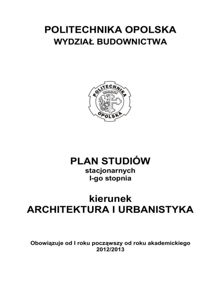 POLITECHNIKA OPOLSKA WYDZIAŁ BUDOWNICTWA PLAN STUDIÓW stacjonarnych I-go stopnia kierunek ARCHITEKTURA I URBANISTYKA Obowiązuje od I roku począwszy od roku akademickiego 2012/2013 CHARAKTERYSTYKA OGÓLNA I. USTALENIA OGÓLNE Studia kończą się nadaniem tytułu zawodowego inżyniera. Studia trwają 7 semestrów. Liczba godzin zajęć wynosi 2565, a liczba punktów ECTS 210. II. KWALIFIKACJE ABSOLWENTA Absolwent studiów I-go stopnia:  posiada wiedzę i umiejętności z zakresu historii i teorii architektury i urbanistyki, sztuk pięknych, budownictwa i technologii budowlanych, konstrukcji, fizyki budowli oraz projektowania architektonicznego i urbanistycznego;  zna przepisy techniczno-budowlane oraz metody organizacji i przebiegu procesu inwestycyjnego;  posiada umiejętności gromadzenia informacji, kształtowania środowiska człowieka zgodnie z jego potrzebami użytkowymi – z uwzględnieniem osób niepełnosprawnych – oraz tworzenia projektów obiektów spełniających wymagania estetyczne, użytkowe i techniczne;  posiada znajomość prawa budowlanego, ekonomiki, organizacji procesu inwestycyjnego i organizacji procesu projektowego w państwach członkowskich Unii Europejskiej. Absolwent jest przygotowany do podjęcia działalności zawodowej w charakterze pracownika pomocniczego oraz w wykonawstwie i nadzorze budowlanym w zakresie projektowania urbanistycznego i projektowania obiektów architektonicznych wraz z ich otoczeniem. Absolwent zna język obcy na poziomie biegłości B2 Europejskiego Systemu Opisu Kształcenia Językowego Rady Europy oraz posiadają umiejętności posługiwania się językiem specjalistycznym z zakresu studiów. Absolwent jest przygotowany do podjęcia studiów drugiego stopnia. III. TREŚCI KSZTAŁCENIA Na kolejnych stronach podano plan studiów i karty opisu przedmiotów ujętych w planie studiów. PRZEDMIOTY OGÓLNE (330) 1 Wychowanie fizyczne I 2 Wychowanie fizyczne II 3 Język obcy I 4 Język obcy II 5 Język obcy III 6 Język obcy IV 7 Ergonomia 8 Ochrona własności intelektualnej 9 Bezpieczeństwo i higiena pracy 10 Technologia informacyjna 11 Treści humanistyczne I 11a Podstawy filozofii 11b Historia sztuki 12 Treści humanistyczne II 12a Psychologia 12b Socjologia PRZEDMIOTY PODSTAWOWE (285 h) 13 Matematyka 14 Geometria wykreślna I 15 Geometria wykreślna II 16 Fizyka budowli 17 Mechanika budowli I 18 Mechanika budowli II PRZEDMIOTY KIERUNKOWE (1830 h) 19A Projektowanie architektoniczne I.A 19B Projektowanie architektoniczne I.B 20A Projektowanie architektoniczne II.A 20B Projektowanie architektoniczne II.B 21A Projektowanie architektoniczne III.A 21B Projektowanie architektoniczne III.B 22A Projektowanie architektoniczne IV.A 22B Projektowanie architektoniczne IV.B 23A Projektowanie architektoniczne V.A 23B Projektowanie architektoniczne V.B 24A Projektowanie architektoniczne VI.A 24B Projektowanie architektoniczne VI.B 25A Projektowanie urbanistyczne I.A 25B Projektowanie urbanistyczne I.B 2 1,2 25 5 5 4 3 4 4 158 13 2,4 2,4 1,2 2,4 2,4 1,8 79 8 1,0 1,0 1,0 1,0 1,0 2,0 1 1 1,0 10 0,0 2,4 1,8 1,6 2,2 2,4 87 5 1 1 1 1 1 8 Godziny zajęć ROK I Sem. I 15 tyg. w tym S W Ć 13 330 120 195 1 30 30 1 30 30 1 30 30 1 30 30 1 30 30 30 30 2 30 15 15 1 15 15 1 15 15 2 30 15 1 30 30 1 Uchwalony przez Radę Wydziału w dniu: 11.07.2012 r. PLAN STUDIÓW PIERWSZEGO STOPNIA Kierunek: ARCHITEKTURA I URBANISTYKA Zaliczenie 14 1,0 1,0 1,0 1,0 1,0 2,0 1,0 1,0 1,0 1,2 1,2 Egzamin 16 1 1 1 1 1 2 1 1 1 2 2 ECTS zaj. prakt. ECTS zaj.kontakt. Lp. Nazwa kursu ECTS Politechnika Opolska Wydział Budownictwa Studia stacjonarne 30 L 15 P S W Ć L ROK II Sem. III Sem. IV 15 tyg. 15 tyg. Sem. II 15 tyg. P W Ć L P W Ć L P W Ć L ROK III Sem. V Sem. VI 15 tyg. 15 tyg. P W Ć L P W Ć L ROK IV Sem. VII 15 tyg. P W Ć L P S 2 2 2 2 2 2 1 1 1 15 1 1 2 30 7 285 135 1 60 30 2 60 30 1 30 15 1 45 15 1 45 30 1 45 15 50 1830 690 2 30 30 45 75 2 2 30 15 - 2 2 1 30 15 30 285 840 15 7 3,6 5,4 2 90 15 75 7 3,6 5,6 2 90 15 75 7 3,6 6,0 2 90 15 75 6 3,6 5,4 2 90 15 75 7 3,6 5,8 2 90 15 75 8 3,6 6,4 2 90 15 75 6 2,4 4,8 2 75 15 60 2 1 1 1 2 1 5 1 1 2 1 5 5 1 5 20120711_AiU_pelny.xlsx / I_PlanS /1 1 5 1 1 4 5 1 26A 26B 27A 27B 28A 28B 29 30 31 32 33 34 50 Projektowanie urbanistyczne II.A Projektowanie urbanistyczne II.B Projektowanie urbanistyczne III.A Projektowanie urbanistyczne III.B Projektowanie urbanistyczne IV.A Projektowanie urbanistyczne IV.B Historia architektury i urbanistyki I Historia architektury i urbanistyki II Historia architektury i urbanistyki III Historia architektury i urbanistyki IV Historia architektury i urbanistyki V Historia architektury i urbanistyki VI Budownictwo ogólne z materiałoznawstwem I Budownictwo ogólne z materiałoznawstwem II Budownictwo ogólne z materiałoznawstwem III Budownictwo ogólne z materiałoznawstwem IV Instalacje budowlane Konstrukcje budowlane I Konstrukcje budowlane II Konstrukcje budowlane III Techniki plastyczne (rys. odręczny, model. arch.) I Techniki plastyczne (rys. odręczny, model. arch.) II Techniki plastyczne (rys. odręczny, model. arch.) III Techniki plastyczne (rys. odręczny, model. arch.) IV Organizacja i ekonomika procesu inwestycyjnego Prawo budowlane Projektowanie architektoniczne wspomagane komputerem Rewitalizacja osiedli mieszkaniowych 51 Rewitalizacja terenów poprzemysłowych 35 36 37 38 39 40 41 42 43 44 45 46 47 48 49 52 Etyka i specyfika zawodu architekta 53 Seminarium dyplomowe 54 Praca dyplomowa 55 Praktyka dyplomowa PRZEDMIOTY FAKULTATYWNE (120 h) 56 Przedmiot fakultatywny I 56a Teoria projektowania 5 2,4 4,8 2 75 15 60 5 3,0 4,4 2 60 15 45 8 3,6 6,2 2 90 15 75 3 5 4 4 3 4 1,2 1,2 2,4 2,4 1,8 1,2 1 1 2 1 2 30 45 60 60 45 30 30 30 30 30 30 30 4 1,8 0,0 1 45 45 4 2,4 1,2 2 60 45 2 1,2 1,2 2 30 15 15 4 2,4 1,6 1 1 60 30 30 3 3 3 3 1,2 2,4 1,8 1,8 1 1 1 1 1 1 1 30 45 45 45 30 30 30 30 15 15 15 4 1,8 3,6 1 45 45 4 1,8 3,6 1 45 45 3 1,8 2,6 1 45 45 2 1,8 2,2 1 30 30 2 1,2 0,0 1 30 30 2 1 0,6 0,0 1 15 15 