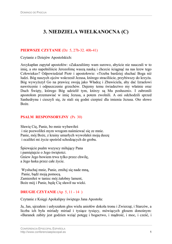 DOMINGO DE PASCUA 3. NIEDZIELA WIELKANOCNA (C) PIERWSZE CZYTANIE (Dz 5, 27b-32. 40b-41) Czytanie z Dziejów Apostolskich: Arcykapłan zapytał apostołów: «Zakazaliśmy wam surowo, abyście nie nauczali w to imię, a oto napełniliście Jerozolimę waszą nauką i chcecie ściągnąć na nas krew tego Człowieka»? Odpowiedział Piotr i apostołowie: «Trzeba bardziej słuchać Boga niż ludzi. Bóg naszych ojców wskrzesił Jezusa, którego straciliście, przybiwszy do krzyża. Bóg wywyższył Go na prawicę swoją jako Władcę i Zbawiciela, aby dać Izraelowi nawrócenie i odpuszczenie grzechów. Dajemy temu świadectwo my właśnie oraz Duch Święty, którego Bóg udzielił tym, którzy są Mu posłuszni». I zabronili apostołom przemawiać w imię Jezusa, a potem zwolnili. A oni odchodzili sprzed Sanhedrynu i cieszyli się, że stali się godni cierpieć dla imienia Jezusa. Oto słowo Boże. PSALM RESPONSORYJNY (Ps 30) Sławię Cię, Panie, bo mnie wybawiłeś i nie pozwoliłeś mym wrogom naśmiewać się ze mnie. Panie, mój Boże, z krainy umarłych wywołałeś moją duszę i ocaliłeś mi życie spośród schodzących do grobu. Śpiewajcie psalm wszyscy miłujący Pana i pamiętajcie o Jego świętości. Gniew Jego bowiem trwa tylko przez chwilę, a Jego łaska przez całe życie. Wysłuchaj mnie, Panie, zmiłuj się nade mną, Panie, bądź moją pomocą. Zamieniłeś w taniec mój żałobny lament, Boże mój i Panie, będę Cię sławił na wieki. DRUGIE CZYTANIE (Ap 5, 11 - 14 ) Czytanie z Księgi Apokalipsy świętego Jana Apostoła: Ja, Jan, ujrzałem i usłyszałem głos wielu aniołów dokoła tronu i Zwierząt, i Starców, a liczba ich była miriady miriad i tysiące tysięcy, mówiących głosem donośnym: «Baranek zabity jest godzien wziąć potęgę i bogactwo, i mądrość, i moc, i cześć, i CONFERENCIA EPISCOPAL ESPAÑOLA http://www.conferenciaepiscopal.es 1 DOMINGO DE PASCUA chwałę, i błogosławieństwo». A wszelkie stworzenie, które jest w niebie i na ziemi, i pod ziemią, i na morzu, i wszystko, co w nich przebywa, usłyszałem, jak mówiło: «Siedzącemu na tronie i Barankowi błogosławieństwo i cześć, i chwała, i moc na wieki wieków». A czworo Zwierząt mówiło: «Amen». Starcy zaś upadli i oddali pokłon. Oto słowo Boże. EWANGELIA (J 21, 1 - 19 ) Słowa Ewangelii według świętego Jana. Jezus ukazał się znowu nad Morzem Tyberiadzkim. A ukazał się w ten sposób: Byli razem Szymon Piotr, Tomasz, zwany Didymos, Natanael z Kany Galilejskiej, synowie Zebedeusza oraz dwaj inni z Jego uczniów. Szymon Piotr powiedział do nich: «Idę łowić ryby». Odpowiedzieli mu: «Idziemy i my z tobą». Wyszli więc i wsiedli do łodzi, ale tej nocy nic nie złowili. A gdy ranek zaświtał, Jezus stanął na brzegu. Jednakże uczniowie nie wiedzieli, że to był Jezus. A Jezus rzekł do nich: «Dzieci, czy nie macie nic do jedzenia»? Odpowiedzieli Mu: «Nie». On rzekł do nich: «Zarzućcie sieć po prawej stronie łodzi, a znajdziecie». Zarzucili więc i z powodu mnóstwa ryb nie mogli jej wyciągnąć. Powiedział więc do Piotra ów uczeń, którego Jezus miłował: «To jest Pan!» Szymon Piotr usłyszawszy, że to jest Pan, przywdział na siebie wierzchnią szatę, był bowiem prawie nagi, i rzucił się w morze. Reszta uczniów dobiła łodzią, ciągnąc za sobą sieć z rybami. Od brzegu bowiem nie było daleko, tylko około dwustu łokci. A kiedy zeszli na ląd, ujrzeli żarzące się na ziemi węgle, a na nich ułożoną rybę oraz chleb. Rzekł do nich Jezus: «Przynieście jeszcze ryb, któreście teraz ułowili». Poszedł Szymon Piotr i wyciągnął na brzeg sieć pełną wielkich ryb w liczbie stu pięćdziesięciu trzech. A pomimo tak wielkiej ilości, sieć się nie rozerwała. Rzekł do nich Jezus: «Chodźcie, posilcie się!» Żaden z uczniów nie odważył się zadać Mu pytania: «Kto Ty jesteś»?, bo wiedzieli, że to jest Pan. A Jezus przyszedł, wziął chleb i podał im, podobnie i rybę. To już trzeci raz, jak Jezus ukazał się uczniom od chwili, gdy zmartwychwstał. A gdy spożyli śniadanie, rzekł Jezus do Szymona Piotra: «Szymonie synu Jana, czy miłujesz Mnie więcej aniżeli ci»? Odpowiedział Mu: «Tak, Panie, Ty wiesz, że Cię kocham». Rzekł do niego: «Paś baranki moje». I powtórnie powiedział do niego: «Szymonie, synu Jana, czy miłujesz Mnie»? Odparł Mu: «Tak, Panie, Ty wiesz, że Cię kocham». Rzekł do niego: «Paś owce moje». Powiedział mu po raz trzeci: «Szymonie, synu Jana, czy kochasz Mnie»? Zasmucił się Piotr, że mu po raz trzeci powiedział: «Czy kochasz Mnie»? I rzekł do Niego: «Panie, Ty wszystko wiesz, Ty wiesz, że Cię kocham». Rzekł do niego Jezus: «Paś owce moje. Zaprawdę, zaprawdę powiadam ci: Gdy byłeś młodszy, opasywałeś się sam i chodziłeś, gdzie chciałeś. Ale gdy się zestarzejesz, wyciągniesz ręce swoje, a inny Cię opasze i poprowadzi, dokąd nie chcesz». To powiedział, aby zaznaczyć, jaką śmiercią uwielbi Boga. A wypowiedziawszy to rzekł do niego: «Pójdź za Mną!» Oto słowo Pańskie. CONFERENCIA EPISCOPAL ESPAÑOLA http://www.conferenciaepiscopal.es 2