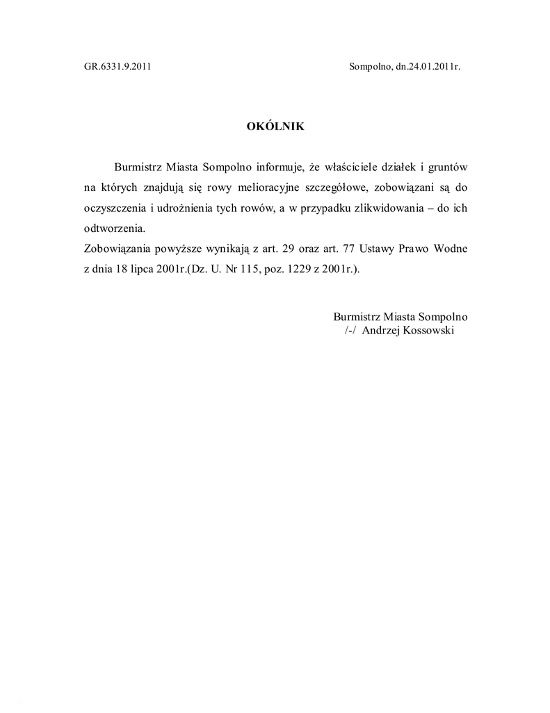 GR.6331.9.2011 Sompolno, dn.24.01.2011r. OKÓLNIK Burmistrz Miasta Sompolno informuje, że właściciele działek i gruntów na których znajdują się rowy melioracyjne szczegółowe, zobowiązani są do oczyszczenia i udrożnienia tych rowów, a w przypadku zlikwidowania – do ich odtworzenia. Zobowiązania powyższe wynikają z art. 29 oraz art. 77 Ustawy Prawo Wodne z dnia 18 lipca 2001r.(Dz. U. Nr 115, poz. 1229 z 2001r.). Burmistrz Miasta Sompolno /-/ Andrzej Kossowski