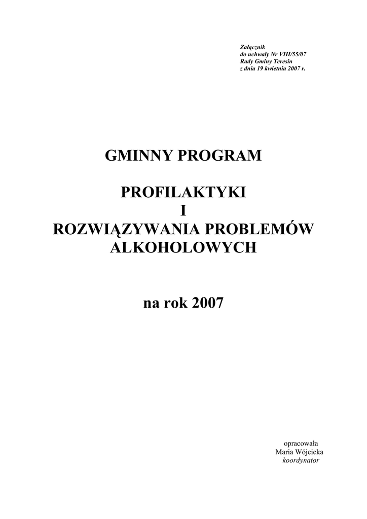Załącznik do uchwały Nr VIII/55/07 Rady Gminy Teresin z dnia 19 kwietnia 2007 r. GMINNY PROGRAM PROFILAKTYKI I ROZWIĄZYWANIA PROBLEMÓW ALKOHOLOWYCH na rok 2007 opracowała Maria Wójcicka koordynator Alkohol towarzyszy człowiekowi przez całe dzieje ludzkości i od początku dziejów jego obecność ma ambiwalentny charakter. Alkohol odsłania bowiem bardzo różne oblicza. W życiu wielu ludzi stanowi on jeden z symboli, używanych dla podkreślenia chwil ważnych, uroczystych, radosnych. Spożywany w umiarkowanych ilościach potrafi rozweselać i nie stanowi zagrożenia dla człowieka. Jednak ten sam alkohol potrafi odsłonić zupełnie inne oblicze. Potrafi oszukiwać, uzależniać i zabijać. Dla jednych ludzi alkohol bywa znakiem przyjaźni i radości. Dla innych jest synonimem cierpienia, zniewolenia i nieszczęścia. W polskiej rzeczywistości ta ambiwalencja odczuwana jest w sposób szczególnie intensywny. Są domy i środowiska, w których alkohol nadal kojarzy się ze świętowaniem i bliskością życzliwych sobie ludzi, ale są i takie, gdzie substancja ta oznacza zniewolenie, degenerację, rozpad życia rodzinnego, czasem także śmierć. Cechą polskiego modelu rozwiązywania problemów alkoholowych jest decentralizacja działań związanych z profilaktyką i rozwiązywaniem problemów i przeniesienie kompetencji w tym zakresie na szczebel samorządu gminnego. Znajduje ona swoją podstawę w najważniejszym akcie prawnym, regulującym działania administracji rządowej i samorządowej w sferze rozwiązywania problemów alkoholowych – ustawie z dnia 26 października 1982 r. o wychowaniu w trzeźwości i przeciwdziałaniu alkoholizmowi. Wspomniana wyżej ustawa określa podstawowe zadania samorządów gminnych, stwierdzając jednoznacznie, że działania te należą do zadań własnych gminy i obejmują: I. Zwiększenie dostępności pomocy terapeutycznej i rehabilitacyjnej dla osób uzależnionych od alkoholu poprzez: 1. Podniesienie poziomu usług terapeutycznych poprzez szkolenie kadry medycznej i osób, które zajmują się profesjonalnym pomaganiem osobom uzależnionym od alkoholu i ich rodzinom – ( terapeuty, członków komisji, koordynatora, pracowników socjalnych, pedagogów). 2. Przeprowadzenie rozmów pierwszego kontaktu. 3. Działalność punktu konsultacyjnego dla osób uzależnionych i współuzależnionych mieszczącego się w Teresińskim Ośrodku Kultury w Teresinie. 4. Obsługa dyżuru Telefonu Zaufania dla rodzin z problemem alkoholowym – TOK Teresin 86 -149 – 23. 5. Funkcjonowanie punktu dla osób uzależnionych w Domu Parafialnym. 6. Współpraca z grupą wstępną dla osób uzależnionych. 7. Umieszczenie pacjentów na oddziale detoksykacyjnym. 2 II. Udzielanie rodzinom, w których występują problemy alkoholowe pomocy psychospołecznej i prawnej realizowane poprzez: 1. Prowadzenie rozmów motywujących do leczenia, zobowiązywanie do stawienia się na leczenie i kierowanie do odpowiednich placówek w ramach pomocy osobom uzależnionym. 2. Pomoc w znalezieniu zatrudnienia bezrobotnym z problemem alkoholowym poprzez finansowanie kursów doskonalenia zawodowego, poszukiwanie pracy. 3. Udzielenie pomocy ofiarom przemocy domowej – punkt w Domu Parafialnym w Niepokalanowie. 4. Grupa wsparcia dla dzieci osób uzależnionych. 5. Organizowanie czasu wolnego dla dzieci z grup ryzyka – zajęcia w czasie ferii zimowych, wycieczki, kolonie profilaktyczno – terapeutyczne, wakacje w szkole. 6. Telefon zaufania dla osób współuzależnionych. 7. Współpraca z Gminnym Ośrodkiem Pomocy Społecznej – pomoc materialna, dożywianie dzieci. 8. Współdziałanie z Komisariatem Policji w związku z interwencjami domowymi i zjawiskiem przemocy. III. Prowadzenie profilaktycznej działalności edukacyjnej szczególności dla dzieci i młodzieży realizowane poprzez: i informacyjnej w 1. Realizację programów profilaktycznych w szkołach podstawowych i gimnazjach. 2. Funkcjonowanie świetlic profilaktyczno – wychowawczych zainteresowanych szkołach samorządowych i świetlicy parafialnej. we wszystkich 3. Krzewienie trzeźwości poprzez Teresiński Ośrodek Kultury. 4. Kącik informacyjny w Gminnej Bibliotece Publicznej – broszury, materiały informacyjne, fachowa literatura. 5. Konkursy propagujące zdrowy styl życia i alternatywne sposoby spędzania wolnego czasu. 6. Współpraca z Kościołem mająca na celu propagowanie zdrowia i trzeźwych obyczajów. 7. Nawiązywanie współpracy z miejscowymi zakładami pracy w ramach działalności naprawczej. 3 8. Działalność na rzecz przeciwdziałania nietrzeźwości kierowców i bezpieczeństwa w miejscach publicznych. 9. Udział w ogólnopolskich akcjach „PARPA”. 10. Prowadzenie informacji publicznej poprzez spotkania informacyjne z rodzicami oraz zamieszczenie aktualnych informacji dotyczących podejmowanych działań profilaktycznych i naprawczych w informatorze samorządowym „Prosto z Gminy”. IV. Wspomaganie działalności instytucji, stowarzyszeń służących rozwiązywaniu problemów alkoholowych realizowane przez: 1. Szkolenie członków Gminnej Komisji RPA do pełnienia funkcji zgodnie z ustawą. 2. Udzielenie wsparcia finansowego instytucjom leczniczym i pomagającym osobom z problemem alkoholowym. 3. Współdziałanie i koordynacja działań z gminami powiatu sochaczewskiego. V. Podejmowanie interwencji Podejmowanie interwencji w związku z naruszeniem przepisów określonych w art. 13 i 15 ustawy oraz występowanie przed sądem w charakterze oskarżyciela publicznego. W przypadku złamania zakazu sprzedaży alkoholu nieletnim lub nietrzeźwym oraz w przypadku złamania zakazów promocji i reklamy napojów alkoholowych gmina może podejmować interwencje oraz występować przed sądem jako oskarżyciel publiczny, czyli kierować sprawy bezpośrednio do sądu z pominięciem prokuratora. Postępowanie z tego zakresu prowadzone jest na podstawie przepisów o postępowaniu karnym. Spraw
