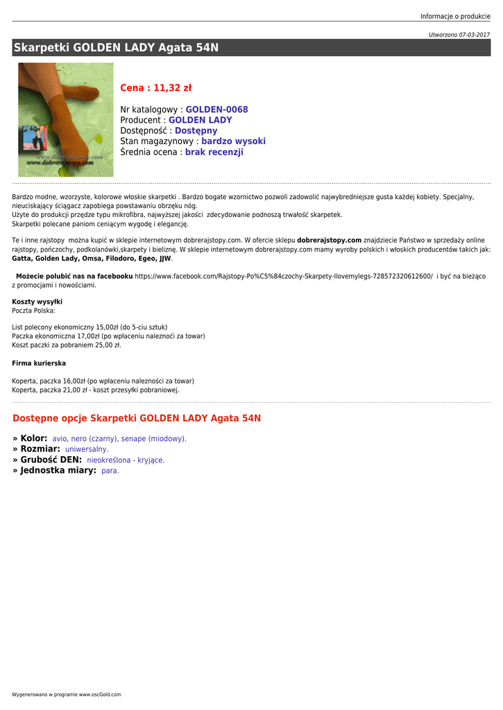 Informacje o produkcie Utworzono 07-03-2017 Skarpetki GOLDEN LADY Agata 54N Cena : 11,32 zł Nr katalogowy : GOLDEN-0068 Producent : GOLDEN LADY Dostępność : Dostępny Stan magazynowy : bardzo wysoki Średnia ocena : brak recenzji Bardzo modne, wzorzyste, kolorowe włoskie skarpetki . Bardzo bogate wzornictwo pozwoli zadowolić najwybredniejsze gusta każdej kobiety. Specjalny, nieuciskający ściągacz zapobiega powstawaniu obrzęku nóg. Użyte do produkcji przędze typu mikrofibra, najwyższej jakości zdecydowanie podnoszą trwałość skarpetek. Skarpetki polecane paniom ceniącym wygodę i elegancję. Te i inne rajstopy można kupić w sklepie internetowym dobrerajstopy.com. W ofercie sklepu dobrerajstopy.com znajdziecie Państwo w sprzedaży online rajstopy, pończochy, podkolanówki,skarpety i bieliznę. W sklepie internetowym dobrerajstopy.com mamy wyroby polskich i włoskich producentów takich jak: Gatta, Golden Lady, Omsa, Filodoro, Egeo, JJW. Możecie polubić nas na facebooku https://www.facebook.com/Rajstopy-Po%C5%84czochy-Skarpety-Ilovemylegs-728572320612600/ i być na bieżąco z promocjami i nowościami. Koszty wysyłki Poczta Polska: List polecony ekonomiczny 15,00zł (do 5-ciu sztuk) Paczka ekonomiczna 17,00zł (po wpłaceniu naleznoći za towar) Koszt paczki za pobraniem 25,00 zł. Firma kurierska Koperta, paczka 16,00zł (po wpłaceniu nalezności za towar) Koperta, paczka 21,00 zł - koszt przesyłki pobraniowej. Dostępne opcje Skarpetki GOLDEN LADY Agata 54N » » » » Kolor: avio, nero (czarny), senape (miodowy). Rozmiar: uniwersalny. Grubość DEN: nieokreślona - kryjące. Jednostka miary: para. Wygenerowano w programie www.oscGold.com