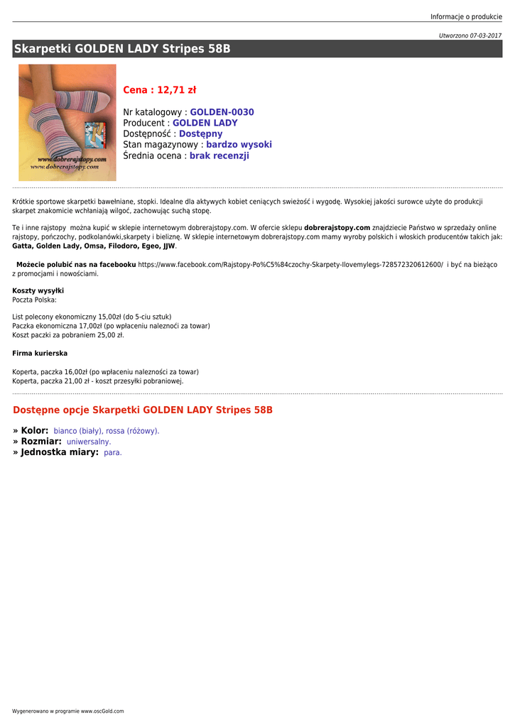 Informacje o produkcie Utworzono 07-03-2017 Skarpetki GOLDEN LADY Stripes 58B Cena : 12,71 zł Nr katalogowy : GOLDEN-0030 Producent : GOLDEN LADY Dostępność : Dostępny Stan magazynowy : bardzo wysoki Średnia ocena : brak recenzji Krótkie sportowe skarpetki bawełniane, stopki. Idealne dla aktywych kobiet ceniących swieżość i wygodę. Wysokiej jakości surowce użyte do produkcji skarpet znakomicie wchłaniają wilgoć, zachowując suchą stopę. Te i inne rajstopy można kupić w sklepie internetowym dobrerajstopy.com. W ofercie sklepu dobrerajstopy.com znajdziecie Państwo w sprzedaży online rajstopy, pończochy, podkolanówki,skarpety i bieliznę. W sklepie internetowym dobrerajstopy.com mamy wyroby polskich i włoskich producentów takich jak: Gatta, Golden Lady, Omsa, Filodoro, Egeo, JJW. Możecie polubić nas na facebooku https://www.facebook.com/Rajstopy-Po%C5%84czochy-Skarpety-Ilovemylegs-728572320612600/ i być na bieżąco z promocjami i nowościami. Koszty wysyłki Poczta Polska: List polecony ekonomiczny 15,00zł (do 5-ciu sztuk) Paczka ekonomiczna 17,00zł (po wpłaceniu naleznoći za towar) Koszt paczki za pobraniem 25,00 zł. Firma kurierska Koperta, paczka 16,00zł (po wpłaceniu nalezności za towar) Koperta, paczka 21,00 zł - koszt przesyłki pobraniowej. Dostępne opcje Skarpetki GOLDEN LADY Stripes 58B » Kolor: bianco (biały), rossa (różowy). » Rozmiar: uniwersalny. » Jednostka miary: para. Wygenerowano w programie www.oscGold.com