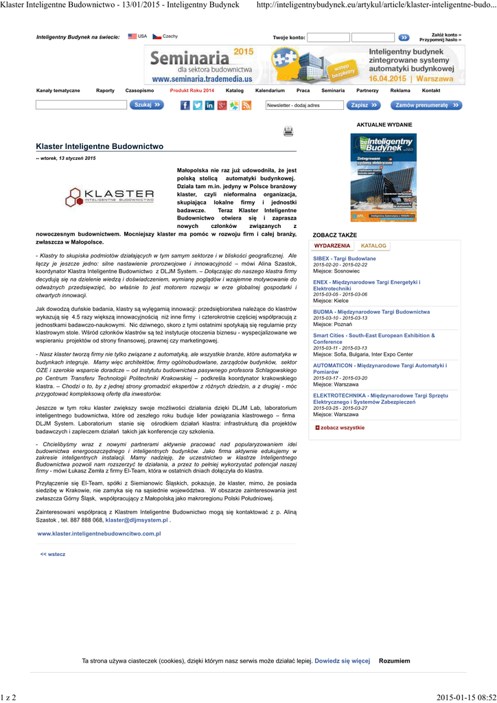 Klaster Inteligentne Budownictwo - 13/01/2015 - Inteligentny Budynek Inteligentny Budynek na świecie: Kanały tematyczne Raporty USA Czechy Czasopismo Produkt Roku 2014 http://inteligentnybudynek.eu/artykul/article/klaster-inteligentne-budo... Załóż konto » Przypomnij hasło » Twoje konto: Katalog Kalendarium Praca Seminaria Partnerzy Reklama Kontakt Newsletter - dodaj adres AKTUALNE WYDANIE Klaster Inteligentne Budownictwo -- wtorek, 13 styczeń 2015 Małopolska nie raz już udowodniła, że jest polską stolicą automatyki budynkowej. Działa tam m.in. jedyny w Polsce branżowy klaster, czyli nieformalna organizacja, skupiająca lokalne firmy i jednostki badawcze. Teraz Klaster Inteligentne Budownictwo otwiera się i zaprasza nowych członków związanych z nowoczesnym budownictwem. Mocniejszy klaster ma pomóc w rozwoju firm i całej branży, zwłaszcza w Małopolsce. - Klastry to skupiska podmiotów działających w tym samym sektorze i w bliskości geograficznej. Ale łączy je jeszcze jedno: silne nastawienie prorozwojowe i innowacyjność – mówi Alina Szastok, koordynator Klastra Inteligentne Budownictwo z DLJM System. – Dołączając do naszego klastra firmy decydują się na dzielenie wiedzą i doświadczeniem, wymianę poglądów i wzajemne motywowanie do odważnych przedsięwzięć, bo właśnie to jest motorem rozwoju w erze globalnej gospodarki i otwartych innowacji. ZOBACZ TAKŻE WYDARZENIA KATALOG SIBEX - Targi Budowlane 2015-02-20 - 2015-02-22 Miejsce: Sosnowiec ENEX - Międzynarodowe Targi Energetyki i Elektrotechniki 2015-03-05 - 2015-03-06 Miejsce: Kielce Jak dowodzą duńskie badania, klastry są wylęgarnią innowacji: przedsiębiorstwa należące do klastrów wykazują się 4.5 razy większą innowacyjnością niż inne firmy i czterokrotnie częściej współpracują z jednostkami badawczo-naukowymi. Nic dziwnego, skoro z tymi ostatnimi spotykają się regularnie przy klastrowym stole. Wśród członków klastrów są też instytucje otoczenia biznesu - wyspecjalizowane we wspieraniu projektów od strony finansowej, prawnej czy marketingowej. BUDMA - Międzynarodowe Targi Budownictwa 2015-03-10 - 2015-03-13 Miejsce: Poznań Smart Cities - South-East European Exhibition & Conference 2015-03-11 - 2015-03-13 - Nasz klaster tworzą firmy nie tylko związane z automatyką, ale wszystkie branże, które automatyka w budynkach integruje. Mamy więc architektów, firmy ogólnobudowlane, zarządców budynków, sektor OZE i szerokie wsparcie doradcze – od instytutu budownictwa pasywnego profesora Schlagowskiego po Centrum Transferu Technologii Politechniki Krakowskiej – podkreśla koordynator krakowskiego klastra. – Chodzi o to, by z jednej strony gromadzić ekspertów z różnych dziedzin, a z drugiej - móc przygotować kompleksową ofertę dla inwestorów. Miejsce: Sofia, Bulgaria, Inter Expo Center Jeszcze w tym roku klaster zwiększy swoje możliwości działania dzięki DLJM Lab, laboratorium inteligentnego budownictwa, które od zeszłego roku buduje lider powiązania klastrowego – firma DLJM System. Laboratorium stanie się ośrodkiem działań klastra: infrastrukturą dla projektów badawczych i zapleczem działań takich jak konferencje czy szkolenia. 2015-03-25 - 2015-03-27 AUTOMATICON - Międzynarodowe Targi Automatyki i Pomiarów 2015-03-17 - 2015-03-20 Miejsce: Warszawa ELEKTROTECHNIKA - Międzynarodowe Targi Sprzętu Elektrycznego i Systemów Zabezpieczeń Miejsce: Warszawa zobacz wszystkie - Chcielibyśmy wraz z nowymi partnerami aktywnie pracować nad popularyzowaniem idei budownictwa energooszczędnego i inteligentnych budynków. Jako firma aktywnie edukujemy w zakresie inteligentnych instalacji. Mamy nadzieję, że uczestnictwo w klastrze Inteligentnego Budownictwa pozwoli nam rozszerzyć te działania, a przez to pełniej wykorzystać potencjał naszej firmy - mówi Łukasz Zemła z firmy El-Team, która w ostatnich dniach dołączyła do klastra. Przyłączenie się El-Team, spółki z Siemianowic Śląskich, pokazuje, że klaster, mimo, że posiada siedzibę w Krakowie, nie zamyka się na sąsiednie województwa. W obszarze zainteresowania jest zwłaszcza Górny Śląsk, współpracujący z Małopolską jako makroregionu Polski Południowej. Zainteresowani współpracą z Klastrem Inteligentne Budownictwo mogą się kontaktować z p. Aliną Szastok , tel. 887 888 068, [email protected] . www.klaster.inteligentnebudowncitwo.com.pl << wstecz Ta strona używa ciasteczek (cookies), dzięki którym nasz serwis może działać lepiej. Dowiedz się więcej 1z2 Rozumiem 2015-01-15 08:52 Klaster Inteligentne Budownictwo - 13/01/2015 - Inteligentny Budynek http://inteligentnybudynek.eu/artykul/article/klaster-inteligentne-budo... O wydawnictwie | Reklama | Mapa strony | Kontakt | Darmowa prenumerata | RSS | Partnerzy | Copyright Media 4 Engineers sp. z o.o. ul. Koszykowa 6, 00-564 Warszawa NIP: 521-36-45-002, KRS: 0000452772, REGON: 146567392 Wszystkie materiały pochodzące ze strony Consulting - Specifying Engineer USA są własnością CFE Media. Wszystkie prawa zastrzeżone. Zobacz nasze pozostałe strony Ta strona używa ciasteczek (cookies), dzięki którym nasz serwis może działać lepiej. Dowiedz się więcej 2z2 Rozumiem 2015-01-15 08:52