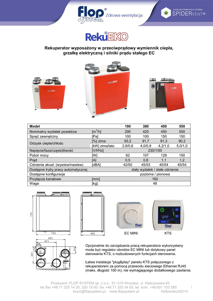 Rekuperator wyposażony w przeciwprądowy wymiennik ciepła, grzałkę elektryczną i silniki prądu stałego EC Model Nominalny wydatek powietrza Spręż zewnętrzny 3 Odzysk ciepła/chłodu Napięcie/faza/częstotliwość Pobór mocy Prąd Ciśnienie akust. (wywiew/nawiew) Dostępne tryby pracy automatycznej Dostępne konfiguracje Przyłącza kanałowe Waga [m /h] [Pa] [%] zima [kW] zima/lato [V/f/Hz] [W] [A] [dBA] [mm] [kg] 190 290 100 93,2 2,8/0,6 380 450 550 420 450 550 100 150 150 91,7 91,3 90,2 4,0/0,9 4,2/1,0 5,0/1,0 230/1/50 62 107 129 150 0,5 0,8 1,1 1,2 42/50 45/53 45/54 45/54 stały wydatek / stałe ciśnienie pozioma / pionowa 160 48 EC MINI KTS Opcjonalnie do zarządzania pracą rekuperatora wykorzystany może być regulator obrotów EC MINI lub dotykowy panel sterowania KTS, o rozbudowanych funkcjach sterowania. Łatwa instalacja "plug&play" panelu KTS połączonego z rekuperatorem za pomocą przewodu sieciowego Ethernet RJ45 (maks. długość 100 m), nie wymagającego dodatkowego zasilania. Producent: FLOP SYSTEM sp. z o.o. 51–315 Wrocław, ul. Kiełczowska 64 tel./fax +48 71 325 14 20, 325 15 60, fax +48 71 325 34 00, tel. kom. +48 601 703 585 1 [email protected], www.flopsystem.pl fol/fpw/eko/02/14 Typ regulatora EC MINI PŁYNNY KTS STOPNIOWY STANDARD EKSTRA Wygaszacz ekranu z zabezpieczeniem hasłem Zarządzanie akcesoriami (czujniki/nagrzewn./chłodnice) Kontrola bajpasu Funkcja odszraniania Przypomnienie o konieczności wymiany filtrów Zastrzeżone menu serwisowe (osobne hasło dostępu) Informacja o statusie jednostki i błędach Wentylacja na żądanie (z czujnikami) Płynna regulacja Stopniowa regulacja (3 stopnie + wyłącz) 3 stopniowa regulacja (ustawiana przez użytkownika) Tryb stałego ciśnienia Tryb stałego wydatku Konfiguracja wejść (2 wejścia 0-10 V) Konfiguracja wyjść (2 wyjścia przekaźnikowe) Zarządzanie proporcją strumieni nawiew/wywiew Tryb "Impreza" Programator tygodniowy Producent: FLOP SYSTEM sp. z o.o. 51–315 Wrocław, ul. Kiełczowska 64 tel./fax +48 71 325 14 20, 325 15 60, fax +48 71 325 34 00, tel. kom. +48 601 703 585 2 [email protected], www.flopsystem.pl fol/fpw/eko/02/14 Montaż pionowy (BI) Nawiew Montaż poziomy na podłodze (G) Czerpnia (Y) Wywiew Montaż pod sufitem (B) Wyrzut Na życzenie przyłącza G i B umieszczone mogą być po przeciwległej stronie urządzenia. MONTAŻ PIONOWY Podłogowy stelaż dystansowy SHK (opcja) MONTAŻ POZIOMY Uchwyt do montażu ściennego (w zestawie) Szyny montażowe SSK (opcja) Rekuperator zaprojektowany z myślą o Zdrowej Wentylacji budynków mieszkalnych, działającej w trybie "na żądanie”, zapewniającej wymianę powietrza stosownie do bieżącej aktywności domowników i ich gości. RekuEKO realizuje tę funkcję już przy zastosowaniu prostego regulatora obrotów EC MINI i czujnika CO2. Wykorzystując regulator z wyświetlaczem dotykowym KTS, pracą urządzenia zarządzać można w sposób bardziej złożony, zależnie od wersji.Panel sterowania KTS umieścić można w obudowie rekuperatora lub zdalnie. Rekuperator współpracować może z systemem zarządzania budynkiem i platformą komunikacyjną MODBUS. Sterownik urządzenia przygotowany jest do współpracy z akcesoriami zewnętrznymi, takim jak nagrzewnice wstępna i wtórna, chłodnica, przepustnica wymiennika gruntowego oraz czujniki parametrów powietrza. Urządzenie wyposażone jest wymiennik przeciwprądowy wykonany z tworzywa sztucznego i zabezpieczony przed szronieniem dwustopniowo : strumieniowo "nawiew/wywiew" oraz za pomocą wbudowanej grzałki elektrycznej. Wszystko dla zapewnienia wymaganej wydajności i jakości powietrza wewnętrznego, nawet w najcięższe mrozy. Sztywna metalowa obudowa i dwa punkty odprowadzenia skroplin umożliwiają łatwy montaż urządzenia na ścianie, na podłodze lub pod sufitem. Króćce przyłączeniowe mogą znajdować się po przeciwległych stronach obudowy ( wyrób na zamówienie). ® Konstrukcja rekuperatora dostosowana jest do systemu wentylacji stropowej SPIDERvent , zarówno pod kątem wymiarów jak i usytuowania króćców kanałowych względem kolektorów-rozdzielaczy powietrza, zapewniając minimalizację oporów hydraulicznych, hałasu i zużycia energii całego systemu wentylacyjnego. Producent: FLOP SYSTEM sp. z o.o. 51–315 Wrocław, ul. Kiełczowska 64 tel./fax +48 71 325 14 20, 325 15 60, fax +48 71 325 34 00, tel. kom. +48 601 703 585 3 [email protected], www.flopsystem.pl fol/fpw/eko/02/14 Czujniki i regulacja Czujnik CO2 - ścienny (APC) Czujnik CO2 - kanałowy (DPC) Czujnik jakości powietrza - ścienny (APV) Czujnik jakości powietrza - kanałowy (DPV) Czujnik wilgotności - ścienny (APH) Czujnik wilgotności - kanałowy (DPH) Zabezpieczenie wymiennika przed szronieniem poprzez zmienny strumień powietrza (DES) Obejście (bajpas) 100% (BPD) Grzałka elektryczna, wstępna, sterowana elektronicznie - wbudowana (IPEHD) Nagrzewnica elektryczna, wstępna, sterowana elektronicznie - zewnętrzna (PEHD) Nagrzewnica elektryczna, wtórna, sterowana elektroniczna - zewnętrzna (EHD) Nagrzewnica wodna, wstępna, sterowana elektronicznie - zewnętrzna (PHWD) Nagrzewnica wodna, wtórna, sterowana elektronicznie - zewnętrzna (HWD) Chłodnica wodna, sterowana elektronicznie - zewnętrzna (CWD) Alarm zabrudzenia filtrów (czasowy) (DPS) Czujnik ruchu PIR (IRS) Sterowanie Regulator prędkości EC MINI (płynny) Regulator prędkości EC MINI (3 stopnie + wyłącz) Panel sterowania z ekranem dotykowym KTS (STANDARD) Panel sterowania z ekranem dotykowym KTS (EKSTRA) Moduł stałego wydatku powietrza (CAF) Moduł stałego ciśnienia (CAP) Złącze wieloczujnikowe (HUB) Filtry i elementy montażowe Filtr F7 - nawiew, Filtr G4 - wywiew Stelaż dystansowy - do pionowej instalacji podłogowej (SHK) Szyny montażowe - do instalacji poziomej (SSK) Komunikacja Moduł MODBUS (MOD) Moduł sieciowy TCP/IP (NET) Moduł komunikacji radiowej (RFM) ■ ■ ■ ■ ■ ■ ■ ■ ■ ■ 