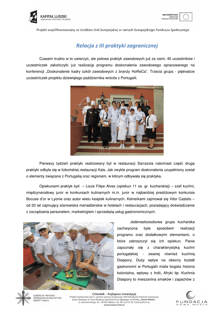 Relacja z III praktyki zagranicznej Czasem trudno w to uwierzyć, ale połowa praktyk zawodowych już za nami. 45 uczestników i uczestniczek zakończyło już realizację programu doskonalenia zawodowego opracowanego na konferencji „Doskonalenie kadry szkół zawodowych z branży HoReCa”. Trzecia grupa - piętnaście uczestniczek projektu dziewiątego października wróciła z Portugalii. Pierwszy tydzień praktyki realizowany był w restauracji Sarrazola natomiast część druga praktyki odbyła się w lizbońskiej restauracji Kais. Jak zwykle program doskonalenia uzupełniony został o elementy związane z Portugalią oraz regionem, w którym odbywała się praktyka. Opiekunami praktyk byli – Louis Filipe Alves (opiekun 11 os. gr. kucharskiej) – szef kuchni, międzynarodowy juror w konkursach kulinarnych m.in. juror w najbardziej prestiżowym konkursie Bocuse d’or w Lyonie oraz autor wielu książek kulinarnych. Kelnerkami zajmował się Vitor Castelo – od 20 lat zajmujący stanowiska menadżerskie w hotelach i restauracjach, posiadający doświadczenie z zarządzania personelem, marketingiem i sprzedażą usług gastronomicznych. Jedenastoosobowa grupa kucharska zachwycona była sposobem realizacji programu oraz dodatkowymi elementami, o które zatroszczył się ich opiekun. Panie zapoznały portugalskiej się - z charakterystyką zwanej również kuchni kuchnią Diaspory. Duży wpływ na obecny kształt gastronomii w Portugalii miała bogata historia kolonialna, wpływy z Indii, Afryki itp. Kuchnia Diaspory to mieszanina smaków i zapachów z różnych zakątków świata, dzięki czemu nasze kucharki poznały np. kuchnię marokańską, która odcisnęła silne piętno na współczesnej kuchni Portugalii. Nauczycielki podczas pracowały na kuchni zimnej, na której przygotowywały przede wszystkim przystawki, które wykorzystywane były podczas kolacji serwowanych w restauracji. Ciekawostką były dni przeznaczone na carving, który okazał się dla nauczycielek nie lada wyzwaniem oraz na przygotowywanie potraw z ryb, których różnorodność zachwyciła i zadziwiła nasze Panie. W cukierni Uczestniczki przygotowywały charakterystyczne portugalskie ciasteczka, a wszystko wykonywane było zgodnie tradycją, czyli ręcznie. Realizując program kuchni gorącej nauczycielki poznały receptury i sposoby przyrządzania jagnięciny, koziny oraz wołowiny, a także sporządzania sosów. Również cztery Panie uczące kelnerstwa próżnowały. Od podstaw poznały zasady serwowania wszystkich posiłków – śniadania, lunchu i kolacji – nawet w ich najwykwintniejszym wydaniu. Opiekun zadbał również o to, by umiały przygotować bufet pełen smakołyków. Grupa kelnerska pogłębiła też swoją wiedzę nt. protokołu obsługi gości tzw. VIP-ów, ciekawostką może być zasada, iż z 3 kieliszków na stole( do wina białego (branco) i czerwonego (tinto) oraz do wody), tylko kieliszek do wody może pozostać pusty (po opróżnieniu) natomiast wino kelner musi uzupełniać na bieżąco (pytając gościa o rodzaj wina). Serwowanie dań to jedynie część pracy kelnera. Dlatego też zgodnie z programem Panie nauczyły się robić podstawowe drinki w cocktail barze - niektóre wyszły lepiej od oryginału przygotowanego przez doświadczonego barmana :) Praca z somelierem pozwoliła im poznać zasady dekantacji wina, doboru odpowiedniego trunku do potrawy oraz tradycyjnych sposobów ich podawania. Dużo zabawy sprawił czas poświęcony na naukę składania serwetek. Okazało się, że ograniczeniem w kształcie serwetki jest jedynie nasza wyobraźnia. Ostatni dzień praktyki poświęcony został podsumowaniu zdobytej wiedzy oraz omówieniu sytuacji kryzysowych, konfliktowych. Po zakończonej praktyce każda z nauczycielek kelnerstwa wyjdzie z batalii z gościem zwycięsko! W nagrodę za ciężką pracę nauczycielki miały do wykorzystania dzień wolny, który przypadał w połowie praktyki. Z samego rana wyruszyły na zamek Pena - najpiękniejszy w całej Portugalii! Jego kształt przypomina tort, natomiast sam zamek składa się z różnych stylów architektonicznych ( mnożone z wiekiem przez różne kultury, które się przeplatały w Portugalii tak jak i kuchnia - Diaspora). By równie królewsko zjeść na obiad Panie wybrały się do Obidos (nie mylić z obiadem) - tu menu wybierał sam opiekun gr. Kucharskiej. Popołudnie spędziły w Fatimie! Natchnione przeuroczą aurą tego miejsca wróciły do hotelu by nabrać sił na kolejny tydzień ciężkiej, ale przyjemnej pracy na praktyce.