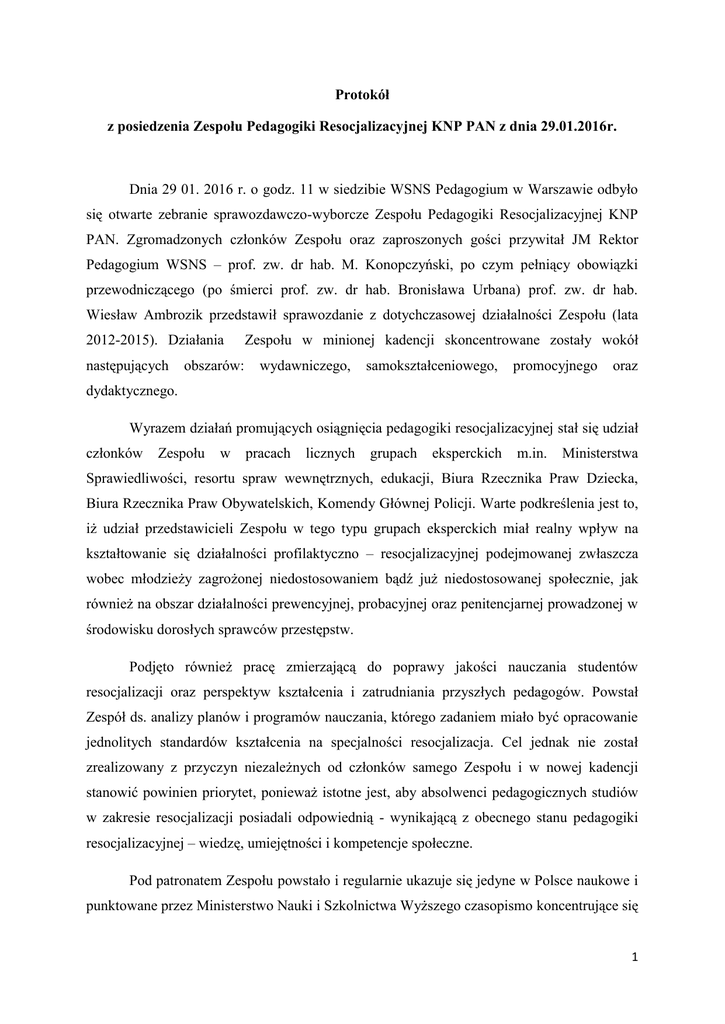 Protokół z posiedzenia Zespołu Pedagogiki Resocjalizacyjnej KNP PAN z dnia 29.01.2016r. Dnia 29 01. 2016 r. o godz. 11 w siedzibie WSNS Pedagogium w Warszawie odbyło się otwarte zebranie sprawozdawczo-wyborcze Zespołu Pedagogiki Resocjalizacyjnej KNP PAN. Zgromadzonych członków Zespołu oraz zaproszonych gości przywitał JM Rektor Pedagogium WSNS – prof. zw. dr hab. M. Konopczyński, po czym pełniący obowiązki przewodniczącego (po śmierci prof. zw. dr hab. Bronisława Urbana) prof. zw. dr hab. Wiesław Ambrozik przedstawił sprawozdanie z dotychczasowej działalności Zespołu (lata 2012-2015). Działania następujących obszarów: Zespołu w minionej kadencji skoncentrowane zostały wokół wydawniczego, samokształceniowego, promocyjnego oraz dydaktycznego. Wyrazem działań promujących osiągnięcia pedagogiki resocjalizacyjnej stał się udział członków Zespołu w pracach licznych grupach eksperckich m.in. Ministerstwa Sprawiedliwości, resortu spraw wewnętrznych, edukacji, Biura Rzecznika Praw Dziecka, Biura Rzecznika Praw Obywatelskich, Komendy Głównej Policji. Warte podkreślenia jest to, iż udział przedstawicieli Zespołu w tego typu grupach eksperckich miał realny wpływ na kształtowanie się działalności profilaktyczno – resocjalizacyjnej podejmowanej zwłaszcza wobec młodzieży zagrożonej niedostosowaniem bądź już niedostosowanej społecznie, jak również na obszar działalności prewencyjnej, probacyjnej oraz penitencjarnej prowadzonej w środowisku dorosłych sprawców przestępstw. Podjęto również pracę zmierzającą do poprawy jakości nauczania studentów resocjalizacji oraz perspektyw kształcenia i zatrudniania przyszłych pedagogów. Powstał Zespół ds. analizy planów i programów nauczania, którego zadaniem miało być opracowanie jednolitych standardów kształcenia na specjalności resocjalizacja. Cel jednak nie został zrealizowany z przyczyn niezależnych od członków samego Zespołu i w nowej kadencji stanowić powinien priorytet, ponieważ istotne jest, aby absolwenci pedagogicznych studiów w zakresie resocjalizacji posiadali odpowiednią - wynikającą z obecnego stanu pedagogiki resocjalizacyjnej – wiedzę, umiejętności i kompetencje społeczne. Pod patronatem Zespołu powstało i regularnie ukazuje się jedyne w Polsce naukowe i punktowane przez Ministerstwo Nauki i Szkolnictwa Wyższego czasopismo koncentrujące się 1 wokół problematyki profilaktyki społecznej i resocjalizacji - półrocznik „Resocjalizacja Polska”. Od 2014 r. czasopismo ukazuje się również w wersji angielskojęzycznej. Redaktorem półrocznika jest prof. zw. dr hab. Marek Konopczyński. Wydawcą w latach 2010-2015 było Pedagogium Wyższa Szkoła Nauk Społecznych w Warszawie, a od 2016 r. Fundacja Pedagogium. Skład Rady Naukowej czasopisma stanowią krajowi i zagraniczni profesorowie reprezentujący rozmaite obszary współczesnej profilaktyki społecznej i resocjalizacji. 17 grudnia 2013r. postanowieniem Ministra Nauki i Szkolnictwa Wyższego półrocznik „Resocjalizacja Polska” uzyskał 5 punktów parametrycznych. Obecnie zgodnie z Komunikatem Ministra Nauki i Szkolnictwa Wyższego z dnia 18 grudnia 2015 r. w sprawie wykazu czasopism naukowych wraz z liczbą punktów przyznawanych za publikacje w tych czasopismach półrocznik „Resocjalizacja Polska” posiada 12 punktów. Warto również podkreślić, iż czasopismo jest indeksowane w bazach danych: The Central European Journal of Social Sciences and Humanities (CEJSH), Directory of Open Access Journals (DOAJ), Index Copernicus International, BazHum, ARIANTA, Centre for Open Science oraz World Catalogue of Scientific Journals. Zespół Pedagogiki Resocjalizacyjnej przy KNP PAN patronował także wielu konferencjom i seminariom naukowym w Polsce, organizowanych przez centralne, jak i lokalne ogniwa praktyki resocjalizacyjnej. Szczególnie ważnym polem dyskusji stał się Kongres Kuratorów Sądowych, który odbył się we wrześniu 2015 r. w Warszawie, a pracach którego, obok przedstawicieli resortu sprawiedliwości i praktyków, uczestniczyło również liczne grono przedstawicieli nauki, w tym przedstawicieli Zespołu Pedagogiki Resocjalizacyjnej KNP PAN. W ramach Zespołu powołane zostało Koło Młodych Pracowników Nauki, którego zadaniem jest wspieranie rozwoju młodej kadry naukowo – dydaktycznej, posiadającej już stopień doktora. Członkowie Koła, przyjęli zasadę, że w seminariach uczestniczyć będą zarówno reprezentujący różne ośrodki akademickie młodzi pracownicy nauki oraz zaproszeni profesorowie, specjalizujący się w prezentowanej tematyce. Inicjatywa ta spotkała się z żywym zainteresowaniem całego Zespołu. Do tej pory odbyło się siedem takich spotkań. Wypracowano także ciekawy moduł pracy, pozwalający na organizację spotkań równocześnie w dwóch miejscach, dzięki możliwości połączenia internetowego w Pedagogium Wyższej Szkole Nauk Społecznych w Warszawie oraz na Wydziale Studiów Edukacyjnych UAM w Poznaniu. Dzięki takiemu rozwiązaniu zainteresowani uczestnicy w zależności od istniejących możliwości dojazdu, biorą udział w spotkaniu, w wybranym przez siebie 2 ośrodku. Przewodniczącym Koła Młodych Pracowników Nauki został dr Maciej Muskała (UAM w Poznaniu). Po przedstawieniu sprawozdania z mijającej kadencji Zespołu prof. W. Ambrozik zainicjował dyskusję o miejscu i roli pedagogiki resocjalizacyjnej wobec współczesnych wyzwań. Dyskusja ta skoncentrowała się wokół tez zawartych w sprawozdaniu i dotyczyła w szczególności konieczności inspirowania przez Zespół zintegrowanych badań naukowych realizowanych w oparciu o wspólnie wypracowane narzędzia badawcze, organizowania w wiodących ośrodkach akademickich wspólnych konferencji naukowych poświęconych węzłowym problemom profilaktyki i resocjalizacji, potrzeby wypracowania ogólnych standardów kształcenia w ramach specjalnośc