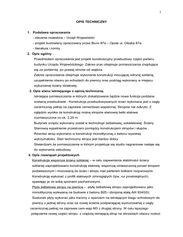 1 OPIS TECHNICZNY 1. Podstawa opracowania - zlecenie inwestora – Urząd Wojewódzki - projekt budowlany opracowany przez Biuro 87a – Opole ul. Oleska 87a. - literatura i normy . 2. Opis ogólny . Przedmiotem opracowania jest projekt konstrukcyjny przebudowy części parteru budynku Urzędu Wojewódzkiego. Zakres prac obejmuje pomieszczenia znajdujące się za portiernią po prawej stronie od wejścia. Zakres opracowania obejmuje wykonanie konstrukcji mocującej witrynę szklaną, uzupełnienie otworu po schodach do piwnicy oraz podciąg wykonany w miejscu wyburzanej ściany działowej. 3. Opis stanu istniejącego z opinią techniczną. Istniejące pomieszczenia w których zlokalizowana będzie nowa funkcja poddane zostaną przebudowie . Konstrukcja przebudowywanych ścian wykonana jest z cegły ceramicznej pełnej na zaprawie cementowo-wapiennej. Stropów nie odkryto. Z oględzin wynika że konstrukcję nośną stropów stanowią belki stalowe rozmieszczone co ok. 2,20 m Budynek urzędu wykonany został w technologii żelbetowej, szkieletowej. Ściany Stanowią wypełnienie przestrzeni pomiędzy konstrukcjami stropów i słupów . Również strop wykonano w konstrukcji monolitycznej z betonu wysokiej wytrzymałości. Stan techniczny stropu jest bardzo dobry. Stwierdzam że pomieszczenie w którym projektuje się studio nagraniowe nadaje się do wykonania zabudowy. 4. Opis rozwiązań projektowych Konstrukcja wsporcza ściany szklanej – w celu zapewnienia stabilności ściany szklanej zaprojektowano konstrukcję stalową, wsporczą umieszczoną ponad stropem podwieszonym i mocowaną do ścian i stropu nad parterem kołkami rozporowymi. Konstrukcję wykonać z profili stalowych zimnogiętych (tzw. rur prostokątnych) spawając je ze sobą spoinami pachwinowymi. Płyta żelbetowa stropu na piwnicą – płytę żelbetową stropu zaprojektowano jako monolityczną wylewaną na budowie z betonu B25 i zbrojoną stalą AIII 934GS). Szalunek płyty wykonać jako tracony z oparciem na istniejącym biegu schodowym do piwnicy z jednej strony oraz na nowej ścianie podpierającej wymurowanej z cegły ceramicznej pełnej na zaprawie cem-wap M3 z drugiej strony. W celu lepszego połączenia nowej części stropu z częścią istniejącą strop na obrzeżach otworu rozkuć 2 i zalać betonem łącznie z częścią projektowaną. Podciąg stalowy – ze względu na możliwość osłabienia sztywności konstrukcji stropu nad parterem projektuje się w miejscu wyburzanej ściany gr. 18 cm podciąg wykonany z profili stalowych walcowanych. Podciąg oparty będzie z jednej strony na ścianie z drugiej na słupie stalowym umiejscowionym przy ścianie. W pierwszej kolejności rozkuć ścianę w miejscu posadowienia słupa stalowego. Po osadzeniu słupa mocować go do ściany kotwami M12 w rozstawie co 120 cm. Następnie wykuć bruzdę poziomą w miejscu posadowienia podciągu. Osadzić belkę podciągu. Powtórzyć te czynności z drugiej strony. Belki połączyć ze sobą śrubami M12 w rozstawie co 80 cm. Po zastabilizowaniu podciągu wykuć od dołu otwór o projektowanym wymiarze. Belki wyszpałdować, osiatkować i otynkować tynkiem cementowo-wapiennym kat. III. Konstrukcja drzwi zewnętrznych – w celu wzmocnienia otworu nowych drzwi zewnętrznych zaprojektowano ramę stalową z rury prostokątnej mocowaną pomiędzy istniejącymi słupami międzyokiennymi. W tym celu należy zdemontować okno i skuć murek podokienny do poziomu poniżej posadzki istniejącej. Osadzić ramę stalową mocując ją do podłoża i filarów bocznych kołkami rozporowymi. Próg zalać betonem B25. Na zewnątrz wejście wykonać w postaci płyt żelbetowych, monolitycznych wykonanych z betonu B25 i zbrojonych stalą AIII . Płyty wylać w ramach z kątownika nierównoramiennego w dwóch częściach. Całość osadzić zgodnie z detalem architektury. Zabezpieczenie konstrukcji – wszystkie elementy stalowe przed zamontowaniem oczyścić do I stopnia czystości a następnie pomalować farbą podkładową i nawierzchniową. Po osadzeniu konstrukcji wykonać poprawki malarskie elementów o uszkodzonej powłoce oraz zabezpieczyć dodatkowo połączenia śrubowe. 4. Warunki wykonywania robót budowlano-montażowych Wszystkie roboty budowlano-montażowe i odbiór robót wykonać zgodnie z „ Warunkami technicznymi wykonania i odbioru robót budowlano-montażowych „ wydanych przez Ministerstwo Gospodarki Przestrzennej i Budownictwa a opracowanych przez Instytut Techniki Budowlanej oraz instrukcjami szczegółowymi dla poszczególnych systemów budowlanych . Opracował : inż. Zbigniew Węgrzyński Opole maj 2014 r