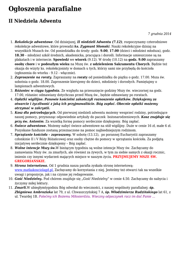 Ogłoszenia parafialne II Niedziela Adwentu 7 grudnia 2014 1. Rekolekcje adwentowe. Od dzisiejszej, II niedzieli Adwentu (7.12), rozpoczynamy czterodniowe rekolekcje adwentowe, które prowadzi ks. Zygmunt Słomski. Nauki rekolekcyjne dzisiaj na wszystkich Mszach św. Od poniedziałku do środy: godz. 9.00, 17.00 (dzieci i młodzież młodsza), godz. 18.30 – młodzież szkół średnich, akademicka, pracująca i dorośli. Informacje umieszczone są na plakatach i w internecie. Spowiedź we wtorek (9.12). W środę (10.12) na godz. 9.00 zapraszamy osoby chore i w podeszłym wieku na Mszę św. z udzieleniem Sakramentu Chorych. Będzie też okazja do wizyty ks. rekolekcjonisty w domach u tych, którzy sami nie przybędą do kościoła (zgłoszenia do wtorku - 9.12 - włącznie). 2. Zaproszenie na roraty. Zapraszamy na roraty od poniedziałku do piątku o godz. 17.00. Msza św. sobotnia o godz. 18.00. Zaproszenie kierujemy do dzieci, młodzieży i dorosłych. Pamiętajmy o lampionach adwentowych. 3. Różaniec w ciągu tygodnia. Ze względu na przesunięcie godziny Mszy św. wieczornej na godz. 17.00, różaniec odmawiany dotychczas przed Mszą św., będzie odmawiany po roratach. 4. Opłatki wigilijne. Panowie kościelni zakończyli roznoszenie opłatków. Dziękujemy za otwarcie i życzliwość z jaką ich przyjmowaliście. Bóg zapłać. Obecnie opłatki możemy otrzymać w zakrystii. 5. Kosz dla potrzebujących. Od pierwszej niedzieli adwentu możemy wesprzeć rodziny, potrzebujące naszej pomocy, przynosząc odpowiednie artykuły do paczek bożonarodzeniowych. Kosz znajduje się przy św. Antonim. Za wszelką formę pomocy serdecznie dziękujemy. Bóg zapłać. 6. Świece adwentowe. Możemy nabyć świece adwentowe na stół wigilijny. Duże w cenie 16 zł, małe 6 zł. Pozyskane fundusze zostaną przeznaczone na pomoc najbiedniejszym rodzinom. 7. Sprzątanie kościoła – zapraszamy. W sobotę (13.12), po porannej Eucharystii zapraszamy członkinie II i V Róży Różańcowej oraz osoby chętne do pomocy w sprzątaniu kościoła. Za podjętą inicjatywę serdecznie dziękujemy – Bóg zapłać. 8. Wolne intencje Mszy św.W bieżącym tygodniu są wolne intencje Mszy św. Zachęcamy do zamawiania Mszy św. za zmarłych, ale również za żywych, w tym za siebie samych z okazji rocznic, imienin czy innymi wydarzeń mających miejsce w naszym życiu. PRZYJMUJEMY MSZE ŚW. GREGORIAŃSKIE. 9. Strona internetowa. Od 1 grudnia nasza parafia zyskała stronę internetową: www.matkakosciolagd.pl. Zachęcamy do korzystania z niej. Jesteśmy też otwarci tak na wszelkie uwagi i propozycje, jak i na czynne jej redagowanie. 10. Gość Niedzielny. Pod chórem znajduje się „Gość Niedzielny” w cenie 4.50. Zachęcamy do nabycia i życzymy miłej lektury. 11. Zmarli.W ubiegłymtygodniu Bóg odwołał do wieczności, z naszej wspólnoty parafialnej: śp. Zbigniewa Ambroziaka lat 79, z ul. Chwaszczyńskiej 7 A, śp. Włodzimierza Rudzińskiego lat 61, z ul. Twardej 1B. Polećmy ich Bożemu Miłosierdziu. Wieczny odpoczynek racz im dać Panie …