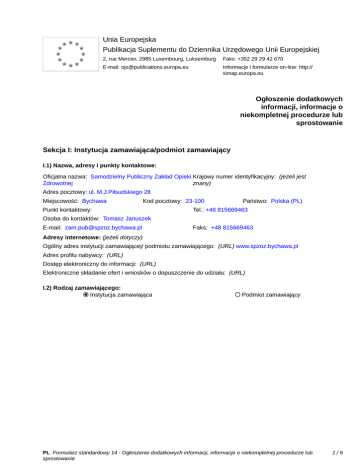 Unia Europejska Publikacja Suplementu do Dziennika Urzędowego Unii Europejskiej 2, rue Mercier, 2985 Luxembourg, Luksemburg Faks: +352 29 29 42 670 E-mail: [email protected] Informacje i formularze on-line: http:// simap.europa.eu Ogłoszenie dodatkowych informacji, informacje o niekompletnej procedurze lub sprostowanie Sekcja I: Instytucja zamawiająca/podmiot zamawiający I.1) Nazwa, adresy i punkty kontaktowe: Oficjalna nazwa: Samodzielny Publiczny Zakład Opieki Krajowy numer identyfikacyjny: (jeżeli jest Zdrowotnej znany) _____ Adres pocztowy: ul. M.J.Piłsudskiego 28 Miejscowość: Bychawa Kod pocztowy: 23-100 Punkt kontaktowy: _____ Państwo: Polska (PL) Tel.: +48 815669463 Osoba do kontaktów: Tomasz Januszek E-mail: [email protected] Faks: +48 815669463 Adresy internetowe: (jeżeli dotyczy) Ogólny adres instytucji zamawiającej/ podmiotu zamawiającego: (URL) www.spzoz.bychawa.pl Adres profilu nabywcy: (URL) _____ Dostęp elektroniczny do informacji: (URL) _____ Elektroniczne składanie ofert i wniosków o dopuszczenie do udziału: (URL) _____ I.2) Rodzaj zamawiającego: Instytucja zamawiająca Podmiot zamawiający PL Formularz standardowy 14 - Ogłoszenie dodatkowych informacji, informacje o niekompletnej procedurze lub sprostowanie 1/6 Sekcja II: Przedmiot zamówienia II.1.1) Nazwa nadana zamówieniu: Dostawa leków,materiałów szewnych,gumowych, opatrunkowych i preparatów dezynfekcyjnych. II.1.2) Krótki opis zamówienia lub zakupu:(podano w pierwotnym ogłoszeniu) Przedmiotem zamówienia jest dostawa leków, materiałów szewnych, gumowych opatrunkowych i preparatów dezynfekcyjnych podzielonych na 18 części, których szczegółowy wykaz asortymentowo-ilościowy zawierają załączniki do SIWZ. Załącznik nr 1 A - Część nr 1 Leki, psychotropy i narkotyki, leki – substancje Załącznik nr 1 B - Część nr 2 Leki różne Załącznik nr 1 C - Część nr 3 Antybiotyki cz.1 Załącznik nr 1 D - Część nr 4 Antybiotyki cz.2 Załącznik nr 1 E - Część nr 5 Płyny infuzyjne i worki do żywienia pozajelitowego Załącznik nr 1 F - Część nr 6 Leki w opakowaniach szpitalnych Załącznik nr 1 G - Część nr 7 Drobnocząsteczkowe heparyny Załącznik nr 1 H - Część nr 8 Inne Załącznik nr 1 I - Część nr 9 Materiały opatrunkowe Załącznik nr 1 J - Część nr 10 Pieluchomajtki Załącznik nr 1 K - Część nr 11 Materiały gumowe Załącznik nr 1 L - Część nr 12 Materiały szewne Załącznik nr 1 Ł - Część nr 13 Materiały higieniczne Załącznik nr 1 M - Część nr 14 Preparaty i sprzęt do leczenia żywieniowego Załącznik nr 1 N - Część nr 15 Dezynfekcja narzędzi Załącznik nr 1 O - Część nr 16 Dezynfekcja powierzchni małych i duzych Załącznik nr 1 P -Część nr 17 Preparaty do dezynfekcji skóry, śluzówek i myjni dezynfektora Załącznik nr 1 R - Część nr 18 Preparaty do dezynfekcji i mycia rąk II.1.3) Wspólny Słownik Zamówień (CPV) Główny przedmiot Słownik główny 33690000 Słownik uzupełniający (jeżeli dotyczy) PL Formularz standardowy 14 - Ogłoszenie dodatkowych informacji, informacje o niekompletnej procedurze lub sprostowanie 2/6 Sekcja IV: Procedura IV.1)Rodzaj procedury(podano w pierwotnym ogłoszeniu) Otwarta Ograniczona Ograniczona przyspieszona Negocjacyjna Negocjacyjna przyspieszona Dialog konkurencyjny Negocjacyjna z uprzednim ogłoszeniem Negocjacyjna bez uprzedniego ogłoszenia Negocjacyjna z publikacją ogłoszenia o zamówieniu Negocjacyjna bez publikacji ogłoszenia o zamówieniu Udzielenie zamówienia bez uprzedniej publikacji ogłoszenia o zamówieniu w Dzienniku Urzędowym Unii Europejskiej IV.2)Informacje administracyjne IV.2.1)Numer referencyjny: (podano w pierwotnym ogłoszeniu) SZP-4/2012 IV.2.2)Dane referencyjne ogłoszenia w przypadku ogłoszeń przesłanych drogą elektroniczną: Pierwotne ogłoszenie przesłane przez eNotices TED eSender Login: ENOTICES_SPZOZMARTA Dane referencyjne ogłoszenia: 2012-042841 rok i numer dokumentu IV.2.3)Ogłoszenie, którego dotyczy niniejsza publikacja: Numer ogłoszenia w Dz.U.: 2012/S 59-096036 z dnia: 24/03/2012 (dd/mm/rrrr) IV.2.4)Data wysłania pierwotnego ogłoszenia: 21/03/2012 (dd/mm/rrrr) PL Formularz standardowy 14 - Ogłoszenie dodatkowych informacji, informacje o niekompletnej procedurze lub sprostowanie 3/6 Sekcja VI: Informacje uzupełniające VI.1) Ogłoszenie dotyczy: Procedury niepełnej Sprostowania Informacji dodatkowych VI.2) Informacje na temat niepełnej procedury udzielenia zamówienia: Postępowanie o udzielenie zamówienia zostało przerwane Postępowanie o udzielenie zamówienia uznano za nieskuteczne Zamówienia nie udzielono Zamówienie może być przedmiotem ponownej publikacji VI.3) Informacje do poprawienia lub dodania : VI.3.1) Zmiana oryginalnej informacji podanej przez instytucję zamawiającą Publikacja w witrynie TED niezgodna z oryginalną informacją, przekazaną przez instytucję zamawiającą Oba przypadki VI.3.2) W ogłoszeniu pierwotnym W odpowiedniej dokumentacji przetargowej (więcej informacji w odpowiedniej dokumentacji przetargowej) W obu przypadkach (więcej informacji w odpowiedniej dokumentacji przetargowej) VI.3.3) Tekst, który należy poprawić w pierwotnym ogłoszeniu Miejsce, w którym znajduje się Zamiast: Powinno być: zmieniany tekst: W celu potwierdzenia, ze dostawy W celu potwierdzenia, że dostawy III.2) Warunki udziału: III.2.3) odpowiadają odpowiadają wymaganiom wymaganiom określonym przez określonym przez Zamawiającego, Kwalifikacje techniczne: Zamawiającego, Wykonawca składa: Wykonawca składa: C.1) odnośnie preparatów 1) odnośnie preparatów rejestrowanych jako produkty rejestrowanych jako produkty lecznicze - Oświadczenie lecznicze - pozwolenie na Wykonawcy, że posiada dokumenty dopuszczenie do obrotu pozwalające na dopuszczenie do produktu leczniczego wydane przez obrotu produktu leczniczego wydane Ministra Zdrowia przez Ministra Zdrowia zgodnie z zgodnie wymogami ustawy 