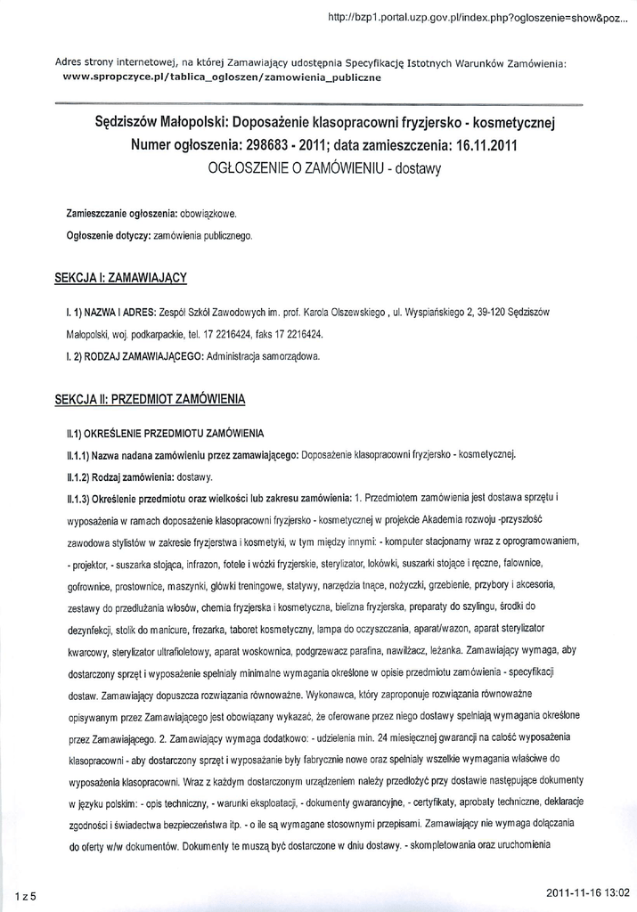http://bzp1.portal.uzp.gov.pl/index.php?ogloszenie=show&poz. Adres strony intemetowej, na ktorej Zamawiajacy udoste_pnia Specyfikacje. Istotnych Warunkow Zamowienia: www.spropczyce.pl/tablica_ogloszen/zamowienia_publiczne S^dziszow Matopolski: Doposazenie klasopracowni fryzjersko • kosmetycznej Numer ogtoszenia: 298683 • 2011; data zamieszczenia: 16.11.2011 OGtOSZENIE 0 ZAMOWIENIU - dostawy Zamieszczanie ogtoszenia: obowiazkowe. Ogtoszenie dotyczy: zamowienia publicznego. SEKCJA I: ZAMAWIAJACY 1.1)NAZWAI ADRES: Zespot Szkol Zawodowych im. prof. Karola Olszewskiego , ul. Wyspiariskiego 2, 39-120 S^dziszow Matopolski, woj. podkarpackie, tel. 17 2216424, faks 17 2216424. I. 2) R0DZAJ ZAMAWIAJACEGO: Administracja samorzadowa. SEKCJAll: PRZEDMIOT ZAMOWIENIA 11.1) OKRESLENIE PRZEDMIOTU ZAMOWIENIA 11.1.1) Nazwa nadana zamowieniu przez zamawiajacego: Doposazenie klasopracowni fryzjersko - kosmetycznej. 11.1.2) Rodzajzamowienia: dostawy. 11.1.3) Okreslenie przedmiotu oraz wielkosci lub zakresu zamowienia: 1. Przedmiotem zamowienia jest dostawa sprzeju i wyposazenia wramach doposazenie klasopracowni fryzjersko - kosmetycznej wprojekcie Akademia rozwoju -przyszlosc zawodowa stylistow wzakresie fryzjerstwa i kosmetyki, wtym mi?dzy innymi: - komputer stacjonamy wraz z oprogramowaniem, - projektor, -suszarka stojaca, infrazon, fotele iwozki fryzjerskie, sterylizator, lokowki, suszarki stojace ire.czne, falownice, gofrownice, prostownice, maszynki, glowki treningowe, statywy, narz^dzia tnace, nozyczki, grzebienie, przybory iakcesoria, zestawy do przedluzania wlosow, chemia fryzjerska ikosmetyczna, bielizna fryzjerska, preparaty do szylingu, srodki do dezynfekcji, stolik do manicure, frezarka, taboret kosmetyczny, lam pa do oczyszczania, aparat/wazon, aparat sterylizator kwarcowy, sterylizator ultrafioletowy, aparat woskownica, podgrzewacz parafina, nawilzacz, lezanka. Zamawiaja^cy wymaga, aby dostarczony sprzej iwyposazenie spelniary minimalne wymagania okreslone wopisie przedmiotu zamowienia -specyfikacji dostaw. Zamawiajapy dopuszcza rozwiazania rownowazne. Wykonawca, ktory zaproponuje rozwiazania rownowazne opisywanym przez Zamawiajacego jest obowia^zany wykazac, ze oferowane przez niego dostawy spelniaja,wymagania okreslone przez Zamawiajacego. 2. Zamawiajacy wymaga dodatkowo: - udzielenia min. 24 miesi^cznej gwarancji na calosc wyposazenia klasopracowni -aby dostarczony sprzej iwyposazanie byly fabrycznie nowe oraz spelnialy wszelkie wymagania wlasciwe do wyposazenia klasopracowni. Wraz z kazdym dostarczonym urzadzeniem nalezy przedlozyc przy dostawie nast§pujape dokumenty wjejzyku polskim: -opis techniczny, -warunki eksploatacji, -dokumenty gwarancyjne, -certyfikaty, aprobaty techniczne, deklaracje zgodnosci iswiadectwa bezpieczehstwa itp. -o ile sa, wymagane stosownymi przepisami. Zamawiajacy nie wymaga dolaczania do oferty w/w dokumentow. Dokumenty te muszqbyc dostarczone wdniu dostawy. - skompletowania oraz uruchomienia 1z5 2011-11-16 13:02
