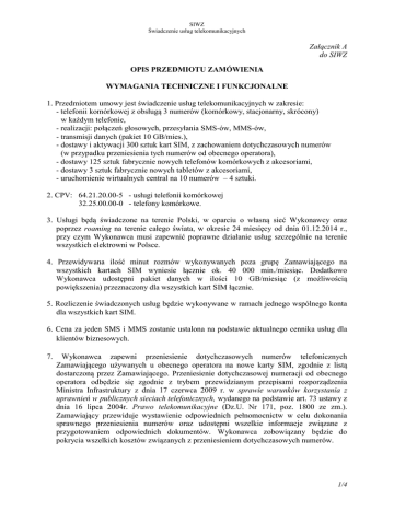 SIWZ Świadczenie usług telekomunikacyjnych Załącznik A do SIWZ OPIS PRZEDMIOTU ZAMÓWIENIA WYMAGANIA TECHNICZNE I FUNKCJONALNE 1. Przedmiotem umowy jest świadczenie usług telekomunikacyjnych w zakresie: - telefonii komórkowej z obsługą 3 numerów (komórkowy, stacjonarny, skrócony) w każdym telefonie, - realizacji: połączeń głosowych, przesyłania SMS-ów, MMS-ów, - transmisji danych (pakiet 10 GB/mies.), - dostawy i aktywacji 300 sztuk kart SIM, z zachowaniem dotychczasowych numerów (w przypadku przeniesienia tych numerów od obecnego operatora), - dostawy 125 sztuk fabrycznie nowych telefonów komórkowych z akcesoriami, - dostawy 3 sztuk fabrycznie nowych tabletów z akcesoriami, - uruchomienie wirtualnych central na 10 numerów – 4 sztuki. 2. CPV: 64.21.20.00-5 - usługi telefonii komórkowej 32.25.00.00-0 - telefony komórkowe. 3. Usługi będą świadczone na terenie Polski, w oparciu o własną sieć Wykonawcy oraz poprzez roaming na terenie całego świata, w okresie 24 miesięcy od dnia 01.12.2014 r., przy czym Wykonawca musi zapewnić poprawne działanie usług szczególnie na terenie wszystkich elektrowni w Polsce. 4. Przewidywana ilość minut rozmów wykonywanych poza grupę Zamawiającego na wszystkich kartach SIM wyniesie łącznie ok. 40 000 min./miesiąc. Dodatkowo Wykonawca udostępni pakiet danych w ilości 10 GB/miesiąc (z możliwością powiększenia) przeznaczony dla wszystkich kart SIM łącznie. 5. Rozliczenie świadczonych usług będzie wykonywane w ramach jednego wspólnego konta dla wszystkich kart SIM. 6. Cena za jeden SMS i MMS zostanie ustalona na podstawie aktualnego cennika usług dla klientów biznesowych. 7. Wykonawca zapewni przeniesienie dotychczasowych numerów telefonicznych Zamawiającego używanych u obecnego operatora na nowe karty SIM, zgodnie z listą dostarczoną przez Zamawiającego. Przeniesienie dotychczasowej numeracji od obecnego operatora odbędzie się zgodnie z trybem przewidzianym przepisami rozporządzenia Ministra Infrastruktury z dnia 17 czerwca 2009 r. w sprawie warunków korzystania z uprawnień w publicznych sieciach telefonicznych, wydanego na podstawie art. 73 ustawy z dnia 16 lipca 2004r. Prawo telekomunikacyjne (Dz.U. Nr 171, poz. 1800 ze zm.). Zamawiający przewiduje wystawienie odpowiednich pełnomocnictw w celu dokonania sprawnego przeniesienia numerów oraz udostępni wszelkie informacje związane z przygotowaniem odpowiednich dokumentów. Wykonawca zobowiązany będzie do pokrycia wszelkich kosztów związanych z przeniesieniem dotychczasowych numerów. 1/4 SIWZ Świadczenie usług telekomunikacyjnych Załącznik A do SIWZ 8. W ramach świadczenia usług w zakresie telefonii komórkowej, o których mowa w p. 1, Wykonawca zapewni: 1) aktywowanie usług telekomunikacyjnych dla numerów przeniesionych od obecnego operatora zgodnie z zaoferowanymi w ofercie taryfami i abonamentami z zachowaniem ciągłości usług telekomunikacyjnych i podlegających utrzymaniu przez Wykonawcę w następstwie zawarcia umowy oraz aktywowanie usług telekomunikacyjnych dla nowych numerów przydzielonych przez Wykonawcę; 2) jedno wspólne konto rozliczeniowe; 3) możliwość wykonywania nieograniczonych bezpłatnych połączeń na terytorium Polski w ramach grupy Zamawiającego (tzw. sieci firmowej) obejmującej wszystkie aktywne karty SIM Zamawiającego obsługiwane przez Wykonawcę; 4) pakiet danych w ilości 10 GB/mies. do wspólnego wykorzystania przez wszystkie karty SIM w ramach konta. Po wykorzystaniu pakietu Zamawiający nie będzie obciążany dodatkowymi opłatami, ale operator będzie miał prawo ograniczyć prędkość transmisji danych, 5) jednolite stawki dla wszystkich kart SIM: a) jedną stawkę za połączenia głosowe do wszystkich krajowych sieci komórkowych i stacjonarnych bez względu na porę dnia i dzień tygodnia, b) jedną stawkę za wysłanie SMS do wszystkich krajowych sieci komórkowych, c) jedną stawkę za wysłanie MMS do wszystkich krajowych sieci komórkowych, 6) funkcjonalność obejmującą: a) w połączeniach krajowych naliczanie sekundowe, począwszy od pierwszej sekundy trwania połączenia do wszystkich operatorów, b) identyfikację numeru dzwoniącego, c) bezpłatne odsłuchiwanie poczty głosowej przy połączeniach inicjowanych przez system poczty głosowej na terytorium Polski, d) wirtualne centrale na 10 numerów – 4 sztuki, e) przekazywanie Zamawiającemu wykazów zrealizowanych połączeń w wersji elektronicznej – bilingi szczegółowe dla każdego z numerów telefonicznych, za każdy okres rozliczeniowy, w terminie 14 dni kalendarzowych od zakończenia okresu rozliczeniowego, f) zdalny bezpłatny dostęp do konta Zamawiającego przez internet dla dwóch osób wskazanych przez Zamawiającego, g) brak blokady karty SIM (brak SIMlocka) w telefonach – zamawiający nie wyraża zgody na dostarczenie kodów do odblokowania telefonów we własnym zakresie, 7) wyznaczenie opiekuna handlowego w celu zapewnienia bieżącej obsługi zamówienia drogą e-mailową lub telefoniczną godz. od 8:30 do 15:00 w dni robocze. 9. W ramach obsługi serwisowej Wykonawca zapewni: a) dostęp do serwisu technicznego w dni robocze w godz. 8.30 – 16.30, b) bezpłatną wymianę kart SIM w przypadku ich uszkodzenia, kradzieży, utraty lub zablokowania w okresie trwania umowy, c) możliwość zgłaszania wszelkich nieprawidłowości w działaniu sprzętu i usług objętych obowiązującą umową poprzez Biuro Obsługi Klienta Wykonawcy e-mailem lub faksem. Dane teleadresowe Wykonawca określi w umowie, d) odbiór niesprawnego i objętego gwarancją sprzętu w ciągu 2 dni roboczych od momentu zgłoszenia uszkodzenia w godzinach urzędowania Zamawiającego (dni robocze od 07:00 do 15:00) oraz dostarczenie sprzętu zastępczego na czas naprawy. Odbiór i dostawa sprzętu po usunięciu wady lub naprawie zostaną wykonane w 2/4 SIWZ Świadczenie usług telekomunikacyjnych Załącznik A do SIWZ godzin