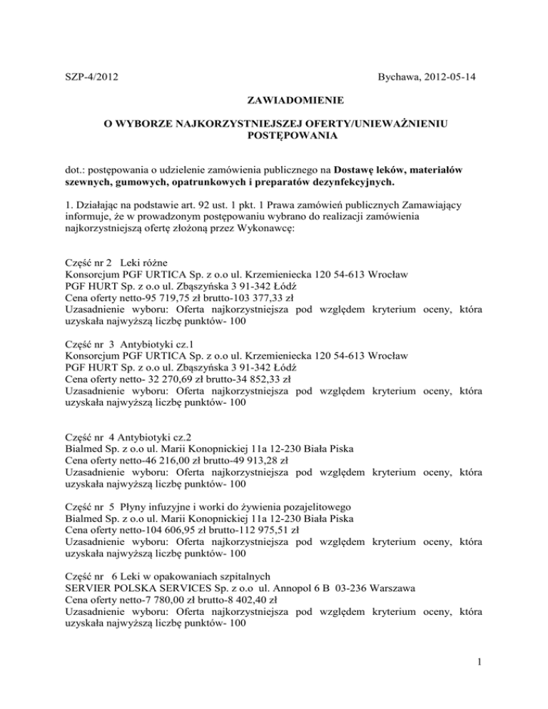 SZP-4/2012 Bychawa, 2012-05-14 ZAWIADOMIENIE O WYBORZE NAJKORZYSTNIEJSZEJ OFERTY/UNIEWAŻNIENIU POSTĘPOWANIA dot.: postępowania o udzielenie zamówienia publicznego na Dostawę leków, materiałów szewnych, gumowych, opatrunkowych i preparatów dezynfekcyjnych. 1. Działając na podstawie art. 92 ust. 1 pkt. 1 Prawa zamówień publicznych Zamawiający informuje, że w prowadzonym postępowaniu wybrano do realizacji zamówienia najkorzystniejszą ofertę złożoną przez Wykonawcę: Część nr 2 Leki różne Konsorcjum PGF URTICA Sp. z o.o ul. Krzemieniecka 120 54-613 Wrocław PGF HURT Sp. z o.o ul. Zbąszyńska 3 91-342 Łódź Cena oferty netto-95 719,75 zł brutto-103 377,33 zł Uzasadnienie wyboru: Oferta najkorzystniejsza pod względem kryterium oceny, która uzyskała najwyższą liczbę punktów- 100 Część nr 3 Antybiotyki cz.1 Konsorcjum PGF URTICA Sp. z o.o ul. Krzemieniecka 120 54-613 Wrocław PGF HURT Sp. z o.o ul. Zbąszyńska 3 91-342 Łódź Cena oferty netto- 32 270,69 zł brutto-34 852,33 zł Uzasadnienie wyboru: Oferta najkorzystniejsza pod względem kryterium oceny, która uzyskała najwyższą liczbę punktów- 100 Część nr 4 Antybiotyki cz.2 Bialmed Sp. z o.o ul. Marii Konopnickiej 11a 12-230 Biała Piska Cena oferty netto-46 216,00 zł brutto-49 913,28 zł Uzasadnienie wyboru: Oferta najkorzystniejsza pod względem kryterium oceny, która uzyskała najwyższą liczbę punktów- 100 Część nr 5 Płyny infuzyjne i worki do żywienia pozajelitowego Bialmed Sp. z o.o ul. Marii Konopnickiej 11a 12-230 Biała Piska Cena oferty netto-104 606,95 zł brutto-112 975,51 zł Uzasadnienie wyboru: Oferta najkorzystniejsza pod względem kryterium oceny, która uzyskała najwyższą liczbę punktów- 100 Część nr 6 Leki w opakowaniach szpitalnych SERVIER POLSKA SERVICES Sp. z o.o ul. Annopol 6 B 03-236 Warszawa Cena oferty netto-7 780,00 zł brutto-8 402,40 zł Uzasadnienie wyboru: Oferta najkorzystniejsza pod względem kryterium oceny, która uzyskała najwyższą liczbę punktów- 100 1 Część nr 7 Drobnocząsteczkowe heparyny Sanofi-Aventis Sp. z o.o ul. Bonifraterska 17 00-203 Warszawa Cena oferty netto-117 538, 32 zł brutto-126 941,40 zł Uzasadnienie wyboru: Oferta najkorzystniejsza pod względem kryterium oceny, która uzyskała najwyższą liczbę punktów- 100 Część nr 8 Inne GSK Services Sp. z o.o ul. Grunwaldzka 189 60-322 Poznań Cena oferty netto-106 560,50 zł brutto-115 085,34 zł Uzasadnienie wyboru: Oferta najkorzystniejsza pod względem kryterium oceny, która uzyskała najwyższą liczbę punktów- 100 Część nr 9 Materiały opatrunkowe PAUL HARTMAN POLSKA Sp. z o.o ul. Partyzancka 133/151 95-200 Pabianice Cena oferty netto-70 027,90 zł brutto-75 630,13 zł Uzasadnienie wyboru: Oferta najkorzystniejsza pod względem kryterium oceny, która uzyskała najwyższą liczbę punktów- 100 Część nr 11 Materiały gumowe Górnośląska Centrala Zaopatrzenia Medycznego ZARYS Sp. z o.o ul.Pod Borem 18 41-808 Zabrze Cena oferty netto-1 271,44 zł brutto-1 373,16 zł Uzasadnienie wyboru: Oferta najkorzystniejsza pod względem kryterium oceny, która uzyskała najwyższą liczbę punktów- 100 Część nr 12 Materiały szewne Przedsiębiorstwo YAVO Sp. z o.o ul. Bawełniania 17 97-400 Bełchatów Cena oferty netto-3 400,56 zł brutto-3 672,60 zł Uzasadnienie wyboru: Oferta najkorzystniejsza pod względem kryterium oceny, która uzyskała najwyższą liczbę punktów- 100 Część nr 14 Preparaty i sprzęt do leczenia żywieniowego Bialmed Sp. z o.o ul. Marii Konopnickiej 11a 12-230 Biała Piska Cena oferty netto-57 788,00 zł brutto-61 209,00 zł Uzasadnienie wyboru: Oferta najkorzystniejsza pod względem kryterium oceny, która uzyskała najwyższą liczbę punktów- 100 Część nr 15 Dezynfekcja narzędzi MEDILAB-Jacek Andrzejewski ul. Piotrkowska 270 90-361 Łódź Cena oferty netto- 30 090,34 zł brutto-34 040,02 zł Uzasadnienie wyboru: Oferta najkorzystniejsza pod względem kryterium oceny, która uzyskała najwyższą liczbę punktów- 100 Część nr 16 Dezynfekcja powierzchni małych i dużych MEDI-SEPT Sp. z o.o Konopnica 159 c 21-030 Motycz Cena oferty netto-11 615,80 zł brutto-12 545,06 zł Uzasadnienie wyboru: Oferta najkorzystniejsza pod względem kryterium oceny, która uzyskała najwyższą liczbę punktów- 100 2 Część nr 17 Preparaty do dezynfekcji skóry, śluzówek i myjni dezynfektora Przedsiębiorstwo Zaopatrzenia Lecznictwa CEZAL LUBLIN Sp. z o.o Al. Spółdzielczości Pracy 38 20-147 Lublin Cena oferty netto-36 591,38 zł brutto-39 691,90 zł Uzasadnienie wyboru: Oferta najkorzystniejsza pod względem kryterium oceny, która uzyskała najwyższą liczbę punktów- 100 Część nr 18 Preparaty do dezynfekcji i mycia rąk Bialmed Sp. z o.o ul. Marii Konopnickiej 11a 12-230 Biała Piska Cena oferty netto-16 060,00 zł brutto-17 941,80 zł Uzasadnienie wyboru: Oferta najkorzystniejsza pod względem kryterium oceny, która uzyskała najwyższą liczbę punktów- 100 Podstawą prawną dokonanego wyboru jest art. 91 ust. 1 Pzp oraz Kodeks Cywilny W prowadzonym postępowaniu złożono następujące oferty: OFERTA 1 SERVIER POLSKA SERVICES Sp. z o.o ul. Annopol 6 B 03-236 Warszawa Cześć nr 6 Cena oferty netto-7 780,00 zł brutto-8 402,40 zł; liczba uzyskanych punktów-100 OFERTA 2 Centrum Zaopatrzenia Medycznego „CEZAL”S.A.-Wrocław Oddział Kraków ul. Balicka 117 30-149 Kraków Cześć nr 18 Cena oferty netto-16 855,00 zł brutto-18 813,90 zł; liczba uzyskanych punktów95,36 OFERTA 3 MEDILAB-Jacek Andrzejewski ul. Piotrkowska 270 90-361 Łódź Cześć nr 15 Cena oferty netto- 30 090,34 zł brutto-34 040,02 zł; liczba uzyskanych punktów100 OFERTA 4 MEDI-SEPT Sp. z o.o Konopnica 159 c 21-030 Motycz Cześć nr 16 Cena oferty netto-11 615,80 zł brutto-12 545,06 zł; liczba uzyskanych punktów100 OFERTA 5 Bialmed Sp. z o.o ul.Marii Konopnickiej 11a 12-230 Biała Piska Cześć nr 2 Cena oferty netto-97 552,45 zł brutto-105