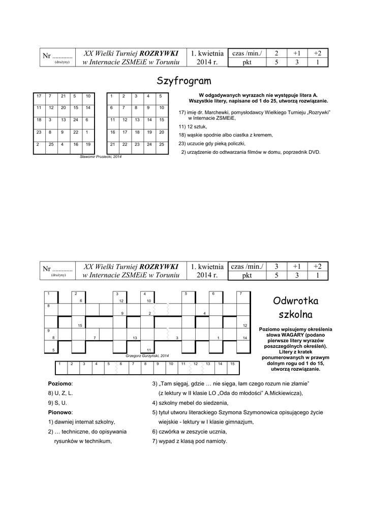 XX Wielki Turniej ROZRYWKI w Internacie ZSMEiE w Toruniu Nr ............. (drużyny) 1. kwietnia 2014 r. czas /min./ pkt 2 5 +1 3 +2 1 Szyfrogram 17 7 21 5 10 1 2 3 4 5 11 12 20 15 14 6 7 8 9 10 18 3 13 24 6 11 12 13 14 15 23 8 9 22 1 16 17 18 19 20 W odgadywanych wyrazach nie występuje litera A. Wszystkie litery, napisane od 1 do 25, utworzą rozwiązanie. 17) imię dr. Marchewki, pomysłodawcy Wielkiego Turnieju „Rozrywki” w Internacie ZSMEiE, 11) 12 sztuk, 2 25 4 16 19 21 22 23 24 18) wąskie spodnie albo ciastka z kremem, 23) uczucie gdy pieką policzki, 25 2) urządzenie do odtwarzania filmów w domu, poprzednik DVD. Sławomir Prusiecki, 2014 (drużyny) 1 1. kwietnia czas /min./ 2014 r. pkt XX Wielki Turniej ROZRYWKI w Internacie ZSMEiE w Toruniu Nr ............. 2 3 6 5 4 12 10 9 2 6 4 15 12 13 3 5 1 14 11 Grzegorz Gurzyński, 2014 1 2 3 4 5 6 Poziomo: 8) U, Z, L. 7 8 9 10 11 12 +2 1 Odwrotka szkolna 9 7 +1 3 7 8 8 3 5 13 14 15 Poziomo wpisujemy określenia słowa WAGARY (podano pierwsze litery wyrazów poszczególnych określeń). Litery z kratek ponumerowanych w prawym dolnym rogu od 1 do 15, utworzą rozwiązanie. 3) „Tam sięgaj, gdzie … nie sięga, łam czego rozum nie złamie” (z lektury w II klasie LO „Oda do młodości” A.Mickiewicza), 9) S, U. 4) szkolny mebel do siedzenia, Pionowo: 5) tytuł utworu literackiego Szymona Szymonowica opisującego życie 1) dawniej internat szkolny, 2) … techniczne, do opisywania rysunków w technikum, wiejskie - lektury w I klasie gimnazjum, 6) czwórka w zeszycie ucznia, 7) wypad z klasą pod namioty. Nr ............. (drużyny) 1. kwietnia czas /min./ 2014 r. pkt XX Wielki Turniej ROZRYWKI w Internacie ZSMEiE w Toruniu Wirówka 4 5 +1 3 +2 1 Pierwsze litery odgadywanych wyrazów zostały już wpisane w środkowym polu, kolejne litery wpisujemy zegarowo rozpoczynając od pola z kreską. G) dla kolegi Eugeniusz … i już, H) do bujania i spania, I) jego smak i do piwa i do piernika wnika, J) uprawia jogę, że tak powiem, K) z gałęziami krzewina bez pnia roślina, L) na nim letnik się praży na plaży, Ł) tam kocing na trawingu, M) silnik spalinowy jak pojazd jednośladowy, N) ujściowy ciek królowej polskich rzek, O) ma go górotwór i potwór, P) strofuje a przy tym rymuje, R) zrozpaczony absztyfikant z Werony, S) porcja wódki lub dystans krótki, Grzegorz Gurzyński, 2014 A) w Gdańsku ma dwór ten król, T) szlak w traktorzyście bity oczywiście, B) budulec na budowy jak twardogłowy, U) płata figle czasami aniołek z różkami, C) bywa, że Eskimos w tym pływa, V) taka uwertura: Giuseppe od „Trubadura”, D) gdy ujemny stan na koncie mam, W) czarna co kracze ale bywa i siwa, E) gruszką leczenie wywołuje wypróżnienie, Z) bernardyni lub paulini, F) świat zwierzęcy i nic więcej, Ż) smykałka co się zdarza dla wędkarza. Nr ............. (drużyny) XX Wielki Turniej ROZRYWKI w Internacie ZSMEiE w Toruniu Krzyżówka kamuflaż 1 2 3 1. kwietnia 2014 r. czas /min./ pkt Do diagramu należy wpisać słowa ukryte w odgadniętych wyrazach (na początku, w środku, na końcu). Gdyby na przykład podano znaczenie wyrazu REPLIKA, do diagramu należałoby wpisać: PLIK. Liczba w nawiasie określa ilość liter w odgadywanym słowie. Poziomo: 1) pani z budki z „Nowościami” (9), 4) interesuje botanika (7), 4 5) malutki mięczak z domkiem na plecach (9). Pionowo: 1) przyrząd pomiarowy w samolocie (15), 5 2) jednostka monetarna Wenezueli (7). Grzegorz Gurzyński, 2014 2 5 3) potocznie młode ptaka, pisklę, pisklak (10). +1 3 +2 1 XX Wielki Turniej ROZRYWKI w Internacie ZSMEiE w Toruniu Nr ............. (drużyny) 1. kwietnia czas /min./ 2014 r. pkt 3 5 +1 3 +2 1 Symbole Parków Narodowych Poziomo: 1 2) Wielkopolskiego – najczęściej występująca sowa w Polsce, 5) Drawieńskiego – zwierzę Jana Chryzostoma Paska, 6) Bieszczadzkiego – największy kot drapieżny w Polsce, 2 3 4 7) Narwiańskiego – ptak drapieżny z rodziny jastrzębi, P 10) Biebrzańskiego – ptak podmokłych terenów, bojownik, 13) Roztoczańskiego – jego dzikim poprzednikiem był tarpan (dwa wyrazy). 5 W 6 Pionowo: R 7 1) pomieszczenie dla baranów, 8 B 2) czar, urok osobisty, 9 10 11 3) tłuszcz zwierzęcy, 12 4) mały konik lub włosy związane z tyłu głowy, B 6) skorupiaki z polskich rzek i stawów, 8) roślina strączkowa cenna jako pasza, 13 9) zwód w boksie, P K 11) żerdź, długi kij, Sławomir Prusiecki, 2014 12) imię Kruczkowskiego, autora „Niemców”. Poziomo do diagramu należy wpisać nazwy zwierząt (podano ich pierwsze litery) – symboli polskich Parków Narodowych. Nr ............. (drużyny) XX Wielki Turniej ROZRYWKI w Internacie ZSMEiE w Toruniu 1. kwietnia 2014 r. czas /min./ pkt 3 5 +1 3 Krzyżówka na czasie Ujawniono wszystkie litery N. W nawiasach pierwsze litery odgadywanych wyrazów. Znaczenie wyrazów (w przypadkowej kolejności): N ● czas (P), ● czas to … (P), N N N ● bierze czas (T), ● na pobyt czasowy (M), ● spędza czas na wypoczynku (L), ● czasem trafi się ślepej kurze (Z), Edmund Kiejdo, 2014 ● Magdalena Różdżka w „Czasie honoru” (A). +2 1 Nr ............. (drużyny) XX Wielki Turniej ROZRYWKI w Internacie ZSMEiE w Toruniu 1 2 3 4 1. kwietnia czas /min./ 2014 r. pkt 3 5 +1 3 +2 1 Krzyżówka ● Litery z pól oznaczonych kropką, czytane rzędami, utworzą rozwiązanie – tytuł bajki. ● 5 ● ● ● Poziomo: 1) więcej niż podziw, 5) miejsce wojskowych manewrów, 6 7 8 9 6) mała, zgrabna, podobna do jelonka, 10) napisał ● powieść „Król Maciuś Pierwszy”, 11) do spania lub pływania, 15) ostatni posiłek spożywany wieczorem, 16) 10 miejsce zakwaterowania żołnierzy. ● Pionowo: 11 12 13 14 1) rezerwa na czarną godzinę, 2) pierwiastek o symbolu Cl, 3) ciągniony przez lokomotywę, 4) mała Tatiana, 7) ● 15 przeciwna do katody, 8) miasto w Murcji (Hiszpania), 9) ● oddział szkolny, 11) małpa wąskonosa, 12) uczony z Miletu, 13) porcja żywnoś