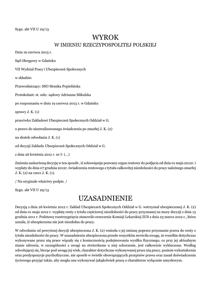 Sygn. akt VII U 29/13 WYROK W IMIENIU RZECZYPOSPOLITEJ POLSKIEJ Dnia 19 czerwca 2013 r. Sąd Okręgowy w Gdańsku VII Wydział Pracy i Ubezpieczeń Społecznych w składzie: Przewodniczący: SSO Monika Popielińska Protokolant: st. sekr. sądowy Adrianna Mikulska po rozpoznaniu w dniu 19 czerwca 2013 r. w Gdańsku sprawy J. K. (1) przeciwko Zakładowi Ubezpieczeń Społecznych Oddział w G. o prawo do niezrealizowanego świadczenia po zmarłej J. K. (2) na skutek odwołania J. K. (1) od decyzji Zakładu Ubezpieczeń Społecznych Oddział w G. z dnia 26 kwietnia 2012 r. nr I- (...) Zmienia zaskarżoną decyzję w ten sposób , iż zobowiązuje pozwany organ rentowy do podjęcia od dnia 01 maja 2012r. i wypłaty do dnia 07 grudnia 2012r. świadczenia rentowego z tytułu całkowitej niezdolności do pracy należnego zmarłej J. K. (2) na rzecz J. K. (1). / Na oryginale właściwy podpis. / Sygn. akt VII U 29/13 UZASADNIENIE Decyzją z dnia 26 kwietnia 2012 r. Zakład Ubezpieczeń Społecznych Oddział w G. wstrzymał ubezpieczonej J. K. (2) od dnia 01 maja 2012 r. wypłatę renty z tytułu częściowej niezdolności do pracy przyznanej na mocy decyzji z dnia 13 grudnia 2011 r. Podstawę rozstrzygnięcia stanowiło orzeczenie Komisji Lekarskiej ZUS z dnia 23 marca 2012 r., która uznała, iż ubezpieczona nie jest niezdolna do pracy. W odwołaniu od powyższej decyzji ubezpieczona J. K. (2) wniosła o jej zmianę poprzez przyznanie prawa do renty z tytułu niezdolności do pracy. W uzasadnieniu ubezpieczona przede wszystkim zwróciła uwagę, że wszelkie dotychczas wykonywane przez nią prace wiązały się z koniecznością podejmowania wysiłku fizycznego, co przy jej aktualnym stanie zdrowia, w szczególności z uwagi na stwierdzone u niej schorzenie, jest całkowicie wykluczone. Według odwołującej się, biorąc pod uwagę jej wiek, charakter dotychczas wykonywanej przez nią pracy, poziom wykształcenia oraz predyspozycje psychofizyczne, nie sposób w świetle obowiązujących przepisów prawa oraz zasad doświadczenia życiowego przyjąć także, aby mogła ona wykonywać jakąkolwiek pracę o charakterze wyłącznie umysłowym. Organ rentowy w odpowiedzi na odwołanie wniósł o jego oddalenie powołując się na argumentację przedstawioną w zaskarżonej decyzji. Pozwany nadmienił również, iż decyzją z dnia 27 kwietnia 2012 r. wydaną po rozpatrzeniu w trybie nadzoru Prezesa Zakładu nad wykonywaniem orzecznictwa o niezdolności do pracy, odmówił ubezpieczonej prawa do renty z tytułu niezdolności do pracy. Postanowieniem z dnia 04 stycznia 2013 r. Sąd zawiesił postępowanie odwoławcze na zasadzie art. 174 § 1 pkt 1 k.p.c., tj. wobec zgonu ubezpieczonej J. K. (2) (vide : k. 70), po czym w dniu 07 stycznia 2013 r. w miejsce zmarłej ubezpieczonej podjął je z udziałem J. K. (1) (vide : k. 71). Sąd ustalił następujący stan faktyczny: Ubezpieczona J. K. (2), urodzona dnia (...), z zawodu była tapicerem - stolarzem. Początkowo, w okresie od dnia 16 września 1975 r. do dnia 30 kwietnia 1981 r. pracowała jako stolarz wielooperacyjny, natomiast od dnia 01 grudnia 1992 r. wyłącznie jako sprzątaczka. W okresie od dnia 01 października 2011 r. do dnia 30 listopada 2012 r. ubezpieczona uprawniona była do renty z tytułu częściowej niezdolności do pracy. W związku z rozpatrywaniem sprawy ubezpieczonej w trybie nadzoru nad wykonywaniem orzecznictwa lekarskiego ponownie skierowano jej sprawę do rozpatrzenia przez Komisję Lekarską ZUS, która w orzeczeniu z dnia 23 marca 2012 r. uznała odwołującą się za zdolną do pracy. Komisja Lekarska ZUS rozpoznała u ubezpieczonej nadciśnienie tętnicze w okresie wydolności serca, stabilną chorobę wieńcową I CCS, zmiany zwyrodnieniowe kręgosłupa i stawów obwodowych nieupośledzające istotnie funkcji, stan po przebytej operacji zespołu cieśni nadgarstka prawego w 2009 r., stan po operacji z powodu perforacji przewodu pokarmowego w grudniu 2011 r. oraz stan po cholecystektomii i po appendektomii. Zaskarżoną w sprawie decyzją z dnia 26 kwietnia 2012 r. Zakład Ubezpieczeń Społecznych wstrzymał ubezpieczonej wypłatę renty z tytułu niezdolności do pracy począwszy od dnia 01 maja 2012 r. Następnie, decyzją z dnia 27 kwietnia 2012 r. organ rentowy odmówił J. K. (2) prawa do renty z tytułu niezdolności do pracy. W dniu 07 grudnia 2012r. ubezpieczona zmarła. Okoliczności bezsporne, vide : świadectwa pracy – k. 9, 11, 13, 15, 17 i 19 akt ubezpieczeniowych, decyzja ZUS z dnia 13.12.2011 r. – k. 41 akt ubezpieczeniowych, wniosek o wydanie orzeczenia – k. 48 akt ubezpieczeniowych, orzeczenie Komisji Lekarskiej ZUS z dnia 23.03.2012 r. wraz z opinią lekarską – k. 49 akt ubezpieczeniowych oraz k. 78 dokumentacji lekarskiej ZUS, decyzja ZUS z dnia 26.04.2012 r. – k. 60 akt ubezpieczeniowych, decyzja ZUS z dnia 27.04.2012 r. – k. 58 akt ubezpieczeniowych, odpis skrócony aktu zgonu k. 66 akt sprawy W celu ustalenia, czy ubezpieczona jest niezdolna do pracy wymagane były wiadomości specjalne, w związku z czym Sąd, na podstawie art. 279, 284 i 292 k.p.c., dopuścił dowód z opinii biegłych lekarzy sądowych : kardiologa, neurologa – rehabilitanta, gastroenterologa oraz ginekologa (uwzględniając w tym zakresie wniosek ubezpieczonej), zgodnie z rodzajem schorzeń występujących u wnioskodawczyni. W wyniku zebrania wywiadu i po przeprowadzeniu badań przedmiotowych (wyłącznie biegły sądowy kardiolog) oraz po dokonaniu analizy dokumentacji lekarskiej biegli sądowi kardiolog i gastroenterolog rozpoznali u wnioskodawczyni : • nadciśnienie tętnicze samoistne, umiarkowane, z zaburzeniem gospodarki lipidowej, • hyperlipidemię w wywiadzie, • przewlekłą stabilną chorobę niedokrwienną serca w klasie 1 CCS, • rozsiany, zaawansowany rak żołądka krzywizny większej, ze zwężeniem odźwiernika z naciekiem na otrzewną, wątrobę, naczynia trzewne i z przerzutami do jajnik