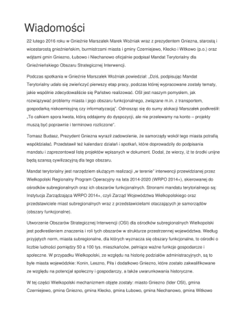 Wiadomości 22 lutego 2016 roku w Gnieźnie Marszałek Marek Woźniak wraz z prezydentem Gniezna, starostą i wicestarostą gnieźnieńskim, burmistrzami miasta i gminy Czerniejewo, Kłecko i Witkowo (p.o.) oraz wójtami gmin Gniezno, Łubowo i Niechanowo oficjalnie podpisał Mandat Terytorialny dla Gnieźnieńskiego Obszaru Strategicznej Interwencji. Podczas spotkania w Gnieźnie Marszałek Woźniak powiedział: „Dziś, podpisując Mandat Terytorialny udało się zwieńczyć pierwszy etap pracy, podczas której wypracowane zostały tematy, jakie wspólnie zdecydowaliście się Państwo realizować. OSI jest naszym pomysłem, jak rozwiązywać problemy miasta i jego obszaru funkcjonalnego, związane m.in. z transportem, gospodarką niskoemisyjną czy informatyzacją”. Odnosząc się do sumy alokacji Marszałek podkreślił: „To całkiem spora kwota, którą oddajemy do dyspozycji, ale nie przelewamy na konto – projekty muszą być poprawnie i terminowo rozliczone”. Tomasz Budasz, Prezydent Gniezna wyraził zadowolenie, że samorządy wokół tego miasta potrafią współdziałać. Przedstawił też kalendarz działań i spotkań, które doprowadziły do podpisania mandatu i zaprezentował listę projektów wpisanych w dokument. Dodał, że wierzy, iż te środki unijne będą szansą cywilizacyjną dla tego obszaru. Mandat terytorialny jest narzędziem służącym realizacji „w terenie” interwencji przewidzianej przez Wielkopolski Regionalny Program Operacyjny na lata 2014-2020 (WRPO 2014+), skierowanej do ośrodków subregionalnych oraz ich obszarów funkcjonalnych. Stronami mandatu terytorialnego są: Instytucja Zarządzająca WRPO 2014+, czyli Zarząd Województwa Wielkopolskiego oraz przedstawiciele miast subregionalnych wraz z przedstawicielami otaczających je samorządów (obszary funkcjonalne). Utworzenie Obszarów Strategicznej Interwencji (OSI) dla ośrodków subregionalnych Wielkopolski jest podkreśleniem znaczenia i roli tych obszarów w strukturze przestrzennej województwa. Według przyjętych norm, miasta subregionalne, dla których wyznacza się obszary funkcjonalne, to ośrodki o liczbie ludności pomiędzy 50 a 100 tys. mieszkańców, pełniące ważne funkcje gospodarcze i społeczne. W przypadku Wielkopolski, ze względu na historię podziałów administracyjnych, są to byłe miasta wojewódzkie: Konin, Leszno, Piła i dodatkowo Gniezno, które zostało zakwalifikowane ze względu na potencjał społeczny i gospodarczy, a także uwarunkowania historyczne. W tej części Wielkopolski mechanizmem objęte zostały: miasto Gniezno (lider OSI), gmina Czerniejewo, gmina Gniezno, gmina Kłecko, gmina Łubowo, gmina Niechanowo, gmina Witkowo oraz powiat gnieźnieński. Przewidziana na mocy Uchwały Zarządu Województwa Wielkopolskiego pula środków na realizację Mandatu Terytorialnego dla Gnieźnieńskiego OSI wynosi ponad 23,5 miliona euro, w tym z Europejskiego Funduszu Rozwoju Regionalnego to kwota prawie 21 milionów euro, a z Europejskiego Funduszu Społecznego pochodzi 2,66 mln euro. W ramach Gnieźnieńskiego OSI środki z Europejskiego Funduszu Rozwoju Regionalnego zostaną przeznaczone na działania dotyczące zmniejszenia emisji zanieczyszczeń i poprawy jakości transportu publicznego, informatyzacji, modernizacji dróg wojewódzkich, wsparcia przedsiębiorczości oraz inwestowania w infrastrukturę edukacyjną. Środki z Europejskiego Funduszu Społecznego będą wspierać działania dotyczące szkolnictwa zawodowego, edukacji, integracji społecznej oraz aktywności zawodowej osób wyłączonych z rynku pracy z powodu opieki nad małymi dziećmi. Działania przeznaczone do finansowania z Europejskiego Funduszu Rozwoju Regionalnego: - Działanie 5.1. Infrastruktura drogowa regionu, beneficjent: Samorząd Województwa Wielkopolskiego oraz Gmina i Miasto Witkowo, alokacja: 4 975 609,75 euro; - Działanie 1.3. Wsparcie przedsiębiorczości i infrastruktury na rzecz rozwoju gospodarczego, beneficjent: Gmina Łubowo, alokacja: 3 524 390,24; - Działanie 3.3. Wspieranie strategii niskoemisyjnych w tym mobilność miejska, beneficjenci: MPK w Gnieźnie, Miasto Gniezno, Powiat Gnieźnieński, Miasto i Gmina Czerniejewo, Gmina Gniezno, Miasto i Gmina Kłecko, Gmina Łubowo, Gmina Niechanowo oraz Gmina i Miasto Witkowo, alokacja: 6 291 646,92; - Działanie 9.3. Inwestowanie w rozwój infrastruktury edukacyjnej i szkoleniowej, beneficjent: Powiat Gnieźnieński, alokacja: 2 256 646,34 euro; - Działanie 2.1 Rozwój elektronicznych usług publicznych, beneficjent: Powiat Gnieźnieński, alokacja: 3 870 609,75 euro; Działania przeznaczone do finansowania z Europejskiego Funduszu Społecznego: - Działanie 6.4. Wsparcie aktywności zawodowej osób wyłączonych z rynku pracy z powodu opieki nad małymi dziećmi, alokacja: 104 613,15 euro; - Działanie 7.1. Aktywna integracja, alokacja: 248 780,49; - Działanie 7.2. Usługi społeczne i zdrowotne, alokacja: 829 268,29; - Działanie 8.1. Ograniczenie i zapobieganie przedwczesnemu kończeniu nauki szkolnej oraz wyrównanie dostępu do edukacji przedszkolnej i szkolnej, alokacja: 1 109 146,34; - Działanie 8.3. Wzmocnienie oraz dostosowanie kształcenia i szkolenia zawodowego do potrzeb rynku pracy, alokacja: 373 170,73.
