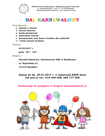 AXON Centrum Edukacyjno – Medyczne Leszek Twarowski ul. Antoniukowska 11 lok. 21, 15-740 Białystok [email protected], www.mentor-med.pl BAL KARNAWAŁOWY W programie: zabawy z chustą loteria fantowa kącik plastyczny malowanie twarzy poczęstunek oraz kawa i herbata dla rodziców i wiele innych atrakcji.. Termin: 03.02.2017 r. godz. 1600 – 1830 Miejsce: Ośrodek Szkolenia i Wychowania OHP w Wasilkowie ul. Supraślska 21, 16-010 Wasilków Zapisy do dn. 25.01.2017 r. w rejestracji NZOZ Axon lub pod nr tel.: 518 499 008, 505 177 208 Zachęcamy do przyjścia w strojach karnawałowych