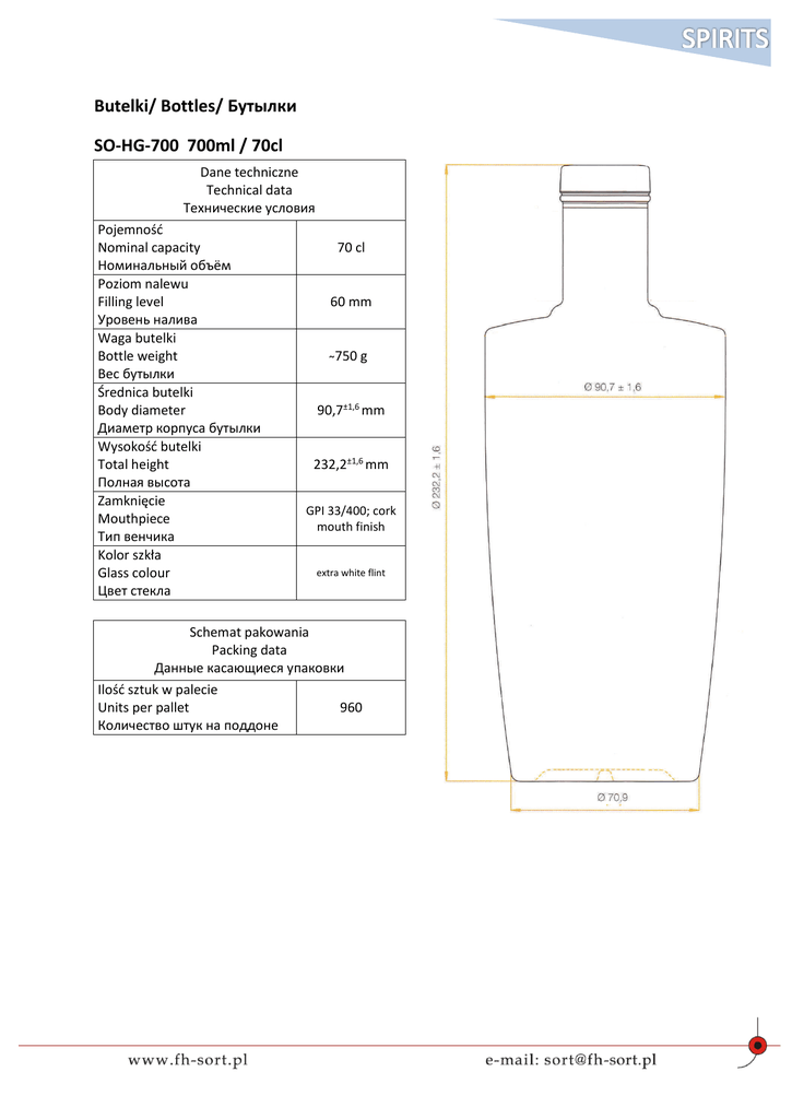 Butelki/ Bottles/ Бутылки SO-HG-700 700ml / 70cl Dane techniczne Technical data Технические условия Pojemność Nominal capacity Номинальный объём Poziom nalewu Filling level Уровень налива Waga butelki Bottle weight Вес бутылки Średnica butelki Body diameter Диаметр корпуса бутылки Wysokość butelki Total height Полная высота Zamknięcie Mouthpiece Тип венчика Kolor szkła Glass colour Цвет стекла 70 cl 60 mm ̴750 g 90,7±1,6 mm 232,2±1,6 mm GPI 33/400; cork mouth finish extra white flint Schemat pakowania Packing data Данные касающиеся упаковки Ilość sztuk w palecie Units per pallet 960 Количество штук на поддоне