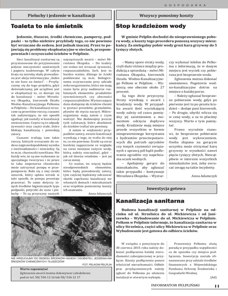 G O S P O D A R K A Pieluchy i jedzenie w kanalizacji Wszyscy ponosimy koszty Toaleta to nie śmietnik Stop kradzieżom wody Jedzenie, tłuszcze, środki chemiczne, pampersy, podpaski – to tylko niektóre przykłady tego, co nie powinno być wrzucane do sedesu. Jest jednak inaczej. Przez to pojawiają się problemy eksploatacyjne w sieciach, przepompowniach i oczyszczalni ścieków w Pelplinie. W gminie Pelplin dochodzi do nieuprawnionego poboru wody, a koszty tego procederu ponoszą wszyscy mieszkańcy. Za nielegalny pobór wody grozi kara grzywny do 5 tysięcy złotych. Sieci kanalizacji sanitarnej są przystosowane do przyjmowania jedynie nieczystości sanitarnych i papieru toaletowego. W całym kraju na szeroką skalę prowadzona jest akcja informacyjna „Sedes to nie kosz na śmieci”. – Przyłączamy się do tego projektu, gdyż doświadczamy, jak uciążliwe jest w eksploatacji to, co dostaje się do kanalizacji – mówi Mirosława Okupska, kierownik Działu Wodno-Kanalizacyjnego Pelkomu w Pelplinie. – Do kanalizacji wrzucane są przeróżne rzeczy, czasami tak zadziwiające, że nie sposób zgadnąć, jak zostały w kanalizacji umieszczone. Często są to odpady żywności oraz części stałe, które blokują kanalizację i powodują zatory. Czasami trafiają tam takie rzeczy, których wrzucanie do sedesu najprawdopodobniej wynika z nieświadomości i niewiedzy. Są to m.in. chusteczki nawilżane. Nie każdy wie, że są one wykonane ze specjalnego tworzywa i że przez to taka niepozorna chusteczka może zatrzymać pompę w przepompowni. Robi się z niej cienki sznurek, który oplata wirnik w taki sposób, że pompa przestaje pracować. To samo dotyczy innych środków higienicznych typu podpaski, patyczki do uszu i pieluchy. – To są przyczyny naszych najczęstszych awarii – mówi Mirosława Okupska. – Do toalety nie wolno też wrzucać żywności, rozpuszczalników, farb. Jest to bardzo ważne, dlatego że ścieki poddawane są m.in. biologicznemu oczyszczaniu przy udziale mikroorganizmów, które nie mają szans bytu przy nadmiarze rozłożonych elementów produktów żywnościowych czy obecności rozpuszczalników. Wystarczająco dużo dodajemy do ścieków chemii w postaci proszków, granulatów, płynów do mycia naczyń. Mikroorganizmy mają zatem z czym walczyć. Nie dodawajmy jeszcze tych substancji, które absolutnie do ścieków trafiać nie powinny. A zatem w większości przypadków zatory, awarie kanalizacji wynikają z tego, że trafia do niej to, co nie powinno. Ścieki są coraz bardziej zagęszczone ze względu na coraz mniejsze zużycie wody, którą należy oszczędzać, gdyż – jak od dawna wiadomo – jest jej coraz mniej. Co ważne, im więcej będzie nieodpowiednich elementów, które będą powodowały zatory, tym częściej będziemy odczuwać skutki zapchania kanalizacji we własnych domach i mieszkaniach oraz wspólnie poniesiemy koszty ich usuwania. Anna Adamczyk – Mamy spore straty wody, czyli duże różnice między produkcją a sprzedażą – mówi Mirosława Okupska, kierownik Działu Wodno-Kanalizacyjnego Pelkom w Pelplinie. – Wynoszą one obecnie około 27 procent. Są tego dwie przyczyny. Straty wynikają z awarii i kradzieży wody. W przypadku awarii ilość wyciekającej wody zależy od czasu pomiędzy jej zaistnieniem a momentem odcięcia dopływu wody. Kradzieże mają miejsce przede wszystkim w formie nieuprawnionego korzystania z hydrantów przeciwpożarowych dla potrzeb oprysków czy innych czynności związanych z uprawą pól bądź podlewania ogrodów czy napełniania oczek wodnych. – Apelujemy gorąco do mieszkańców, aby zgłaszać takie przypadki – kontynuuje Mirosława Okupska. – Wystar- czy wykonać telefon do Pelkomu z informacją, że w danym miejscu jest wyciek czy pobierana jest bezprawnie woda. Zgłoszenia można dokonać anonimowo. Pogotowie wodno-kanalizacyjne dotrze na miejsce o każdej porze. – Należy zgłaszać bezprawne pobieranie wody, gdyż po pierwsze jest to po prostu kradzież – dodaje pani kierownik. – Po drugie, ubytki wlicza się w cenę wody, a za to płacimy wszyscy. Warto o tym pamiętać. Prawo wyraźnie stanowi, że bezprawne pobieranie wody jest wykroczeniem. Osoba złapana na gorącym uczynku może otrzymać karę grzywny w wysokości nawet pięciu tysięcy złotych. Niewątpliwie w interesie wszystkich mieszkańców jest, żeby zwracać uwagę na takie incydenty. Anna Adamczyk Inwestycja gotowa Kanalizacja sanitarna Budowa kanalizacji sanitarnej w Pelplinie na odcinku od ul. Strzelnica do ul. Mickiewicza i od Janiszewka – Wybudowanie do ul. Mickiewicza w Pelplinie. Pelkom w Pelplinie informuje, że kanalizacja sanitarna w ulicy Strzelnica, części ulicy Mickiewicza w Pelplinie oraz Wybudowanie jest gotowa do odbioru ścieków. NIE WRZUCAJMY DO SEDESU ŚRODKÓW HIGIENY OSOBISTEJ, JEDZENIA ANI ŚRODKÓW CHEMICZNYCH I TŁUSZCZÓW FOT. PELKOM PELPLIN Warto zapamiętać Zgłoszenia awarii można dokonywać całodobowo pod nr tel. 58/ 536 12 16 lub 58/ 536 12 17 W związku z powyższym do 30 czerwca 2015 roku należy dokonać podłączenia każdej nieruchomości zabezpieczonej w przyłącze. Koszty podłączenia ponosi właściciel nieruchomości. Odbiór prac przyłączeniowych należy zgłosić do Pelkomu po ułożeniu instalacji w otwartym wykopie. Pracownicy Pelkomu służą poradą w przypadku wątpliwości co do sposobu czy miejsca podłączenia. Inwestycja została sfinansowana przy udziale środków finansowych z Wojewódzkiego Funduszu Ochrony Środowiska i Gospodarki Wodnej. (Ad) INFORMATOR PELPLIŃSKI 11