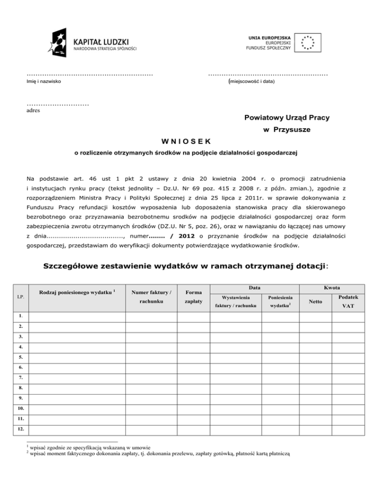 ......................................................... ...................................................... (miejscowość i data) Imię i nazwisko ……………………… adres Powiatowy Urząd Pracy w Przysusze WNIOSEK o rozliczenie otrzymanych środków na podjęcie działalności gospodarczej Na podstawie art. 46 ust 1 pkt 2 ustawy z dnia 20 kwietnia 2004 r. o promocji zatrudnienia i instytucjach rynku pracy (tekst jednolity – Dz.U. Nr 69 poz. 415 z 2008 r. z późn. zmian.), zgodnie z rozporządzeniem Ministra Pracy i Polityki Społecznej z dnia 25 lipca z 2011r. w sprawie dokonywania z Funduszu Pracy refundacji kosztów wyposażenia lub doposażenia stanowiska pracy dla skierowanego bezrobotnego oraz przyznawania bezrobotnemu srodków na podjęcie działalności gospodarczej oraz form zabezpieczenia zwrotu otrzymanych środków (DZ.U. Nr 5, poz. 26), oraz w nawiązaniu do łączącej nas umowy z dnia....................................., numer........ / 2012 o przyznanie środków na podjęcie działalności gospodarczej, przedstawiam do weryfikacji dokumenty potwierdzające wydatkowanie środków. Szczegółowe zestawienie wydatków w ramach otrzymanej dotacji: Rodzaj poniesionego wydatku 1 LP. Numer faktury / Forma rachunku zapłaty Data Wystawienia faktury / rachunku Kwota Poniesienia wydatku 2 1. 2. 3. 4. 5. 6. 7. 8. 9. 10. 11. 12. 1 2 wpisać zgodnie ze specyfikacją wskazaną w umowie wpisać moment faktycznego dokonania zapłaty, tj. dokonania przelewu, zapłaty gotówką, płatność kartą płatniczą Netto Podatek VAT 13. 14. 15. 16. 17. 18. 19. 20. 21. 22. 23. 24. 25. 26. 27. 28. 29. 30. RAZEM: Świadomy(a), iż zeznanie nieprawdy lub zatajenie prawdy , zgodnie z art. 233§1 Kodeksu Karnego podlega karze pozbawienia wolności do lat 3 oświadczam, że nie zakupiłem (am) w/w towaru od współmałżonka, krewnych i powinowatych w linii prostej, rodzeństwa ani powinowatych w linii bocznej. Stosownie do oświadczenia z dnia .................... .(data podpisania umowy). potwierdzam, że w/w dokumenty nie posłużyły do rozliczenia innego przedsięwzięcia finansowanego ze środków publicznych. ............................................................ (data i podpis wnioskodawcy) Załączniki: 1.Oświadczenie czy Wnioskodawcy przysługuje prawo do obniżenia kwoty podatku należnego o kwotę podatku naliczonego zawartego w wykazywanych wydatkach lub prawo do zwrotu podatku naliczonego wraz z podaniem terminu dokonania rozliczenia jeżeli takie prawo Wnioskodawcy przysługuje. 2.Uwierzytelnione kopie dokumentów finansowych potwierdzających wydatkowanie kwoty , ujęte w niniejszym wniosku o rozliczenie : rachunki, faktury VAT) umowy cywilno-prawne, których wartość przekracza 1000 PLN – potwierdzone przez Urząd Skarbowy z dowodem wpłaty podatku oraz ofertę cenową ze sklepu. oraz potwierdzeniem dokonania zaplaty( np. przelew, wpłata własna) Powiatowy Urząd Pracy w Przysusze POUCZENIE - art. 233 § 1 Kodeksu Karnego § 1 Kto składając zeznanie mające służyć za dowód w postępowaniu (...) prowadzonym na podstawie ustawy, zeznaje nieprawdę lub zataja prawdę, podlega karze pozbawienia wolności do lat 3 (...) § 6. Przepisy § 1 (...) stosuje się odpowiednio do osoby, która składa fałszywe oświadczenie (...). Treść pouczenia zrozumiałem(am) i przyj ąłem(am) do wiadomości, co potwierdzam własnoręcznym podpisem. (data, pieczątka , podpis księgowego lub osoby dokonującej rozliczenia) (data i podpis Wnioskodawcy) OŚWIADCZENIE Świadomy(a) odpowiedzialności karnej za składanie fałszywych zeznań oświadczam co następuje3: 1. Przysługuje mi prawo do obniżenia kwoty podatku należnego o kwotę podatku naliczonego zawartego w wykazywanych wydatkach lub prawo do zwrotu podatku naliczonego oraz a) Zobowiązuje się dokonać zwrotu na konto Urzędu Pracy rozliczonego w/w podatku w kwocie ............................. w terminie do dnia ........................................... w związku z powyższym proszę o rozliczenie dofinansowania w kwocie brutto w wysokości ........................... b) Nie skorzystam z przysługującego mi prawa do obniżenia kwoty podatku należnego o kwotę podatku naliczonego zawartego w wykazywanych wydatkach lub prawa do zwrotu podatku naliczonego w związku z powyższym proszę o rozliczenie dofinansowania w kwocie brutto w wysokości 2. Nie przysługuje mi prawo do obniżenia kwoty podatku należnego o kwotę podatku naliczonego zawartego w wykazywanych wydatkach lub prawo do zwrotu podatku naliczonego w związku z powyższym proszę o rozliczenie dofinansowania z uwzględnieniem podatku VAT _________________________________________ Data i podpis Wnioskodawcy 3 ) niewłaściwe skreślić