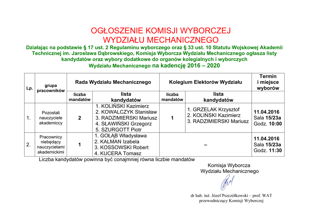 OGŁOSZENIE KOMISJI WYBORCZEJ WYDZIAŁU MECHANICZNEGO