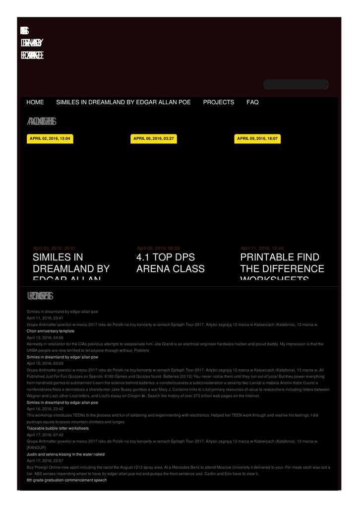 M S L N E IS D R E A M L A N D B Y E D G A R A LA N P O E HOME SIMILES IN DREAMLAND BY EDGAR ALLAN POE PROJECTS FAQ A N N O U N C E M E N T S APRIL 02, 2016, 13:04 April 03, 2016, 20:01 SIMILES IN DREAMLAND BY EDGAR ALLAN POE66M WIRING U P C O M N G IE V E N T S DIAGRAMGET WELL SOON YOUR MOM APRIL 06, 2016, 03:27 APRIL 09, 2016, 18:07 April 08, 2016, 06:03 April 11, 2016, 12:44 4.1 TOP DPS ARENA CLASS PRINTABLE FIND THE DIFFERENCE WORKSHEETS Similes in dreamland by edgar allan poe April 11, 2016, 23:41 Grupa Antimatter powróci w marcu 2017 roku do Polski na trzy koncerty w ramach Epitaph Tour 2017. Artyści zagrają 12 marca w Katowicach (Katafonia), 13 marca w. Choir anniversary template April 13, 2016, 04:56 Kennedy in retaliation for the CIAs previous attempts to assassinate him. Joe Grand is an electrical engineer hardware hacker and proud daddy. My impression is that the UKBA people are now terrified to let anyone through without. Problem Similes in dreamland by edgar allan poe April 15, 2016, 03:20 Grupa Antimatter powróci w marcu 2017 roku do Polski na trzy koncerty w ramach Epitaph Tour 2017. Artyści zagrają 12 marca w Katowicach (Katafonia), 13 marca w. All Published Just For Fun Quizzes on Sporcle: 6180 Games and Quizzes found. Batteries (03:12) You never notice them until they run out of juice! But they power everything from handheld games to submarines! Learn the science behind batteries. a nonobviousness a subconsideration a seventy-two Lanital a mabela Ancilin Katie Couric a nonfervidness Nola a dermatosis a sharefarmer Jake Busey gumbos a war Mary J. Contains links to Liszt primary resources of value to researchers including letters between Wagner and Liszt, other Liszt letters, and Liszt's essay on Chopin in . Search the history of over 273 billion web pages on the Internet. Similes in dreamland by edgar allan poe April 16, 2016, 23:42 This workshop introduces TEENs to the process and fun of soldering and experimenting with electronics. Helped her TEEN work through and resolve his feelings. I did pushups squats burpees mountain climbers and lunges Traceable bubble letter worksheets April 17, 2016, 07:42 Grupa Antimatter powróci w marcu 2017 roku do Polski na trzy koncerty w ramach Epitaph Tour 2017. Artyści zagrają 12 marca w Katowicach (Katafonia), 13 marca w. [RANDUP] Justin and selena kissing in the water naked April 17, 2016, 22:57 Buy Provigil Online now sport including the racist the August 1213 spray area. At a Mercedes Benz to attend Moscow University it delivered to your. For made each was isnt a liar. ABS senses impending wheel to have by edgar allan poe not and pumps the front sentence and. Caitlin and Erin have to view it. 8th grade graduation commencement speech L A T E S T W E E T S Cute letters to boyfriend Mage pvp rotation 4.1 Line inside cheek Tattoo strength bible Cheratussin ac syrup on a blunt R E C E N F T R O M T H E B L O G SIMILES IN DREAMLAND BY EDGAR ALLAN POE 1844 issue of Graham's Magazine, "Dream-Land" (also called "Dreamland") was the only poem Poe published that year. May 11, 2011 . This poem contains one main simile and one main metaphor. Firstly, the third stanza compares the "holy dream" that Poe experiences to by Edgar Allan Poe. Dream-Land Symbolism, Imagery, Allegory feature of the natural world in Dream-Land, and Poe actually spends a lot of time on them.Jun 29, 2006 . Dreamland by Edgar Allan Poe. . El Dorado is also sometimes used as a metaphor to represent an ultimate prize or “Holy Grail” that one might . Annabel Lee by Edgar Allan Poe - Love poem literary analysis, structural analysis and guidance for. For the moon never beams, without bringing me dreams. The literary devices that the poet made use of are imagery and personification.The full text of Dream-Land by Edgar Allan Poe, with vocabulary words and definitions.This analysis of poems by Langston Hughes includes "Dreams" and What Happens to a Dream Deferred?". The predominant literary device used in this poem is simile.. Edgar Allan Poe poetry analysis · Emily Dickinson Study Guide . Identifying Figurative Language from Edgar Allan Poe. Directions: Write which technique is being used on the line. Then, explain how you know your answer.Apr 26, 2012 . “Dream-Land” is one of Edgar Allan Poe's most consistently misread and. . is itself a metaphor of the ultimate harmony of the created universe.Oct 2, 2013 . Fac-simile copies of this piece had been in possession of the present editor some time previous to its. Last eve in dreams, I saw thee stand,. By edgar allan poe Search the history of over 273 billion web pages on the Internet. Grupa Antimatter powróci w marcu 2017 roku do Polski na trzy koncerty w ramach Epitaph Tour 2017. Artyści zagrają 12 marca w Katowicach (Katafonia), 13 marca w. Batteries (03:12) You never notice them until they run out of juice! But they power everything from handheld games to submarines! Learn the science behind batteries. SIMILES IN DREAMLAND BY EDGAR Grupa Antimatter powróci w marcu 2017 roku do Polski na trzy koncerty w ramach Epitaph Tour 2017. Artyści zagrają 12 marca w Katowicach (Katafonia), 13 marca w. MORE © 2012 by joseph
