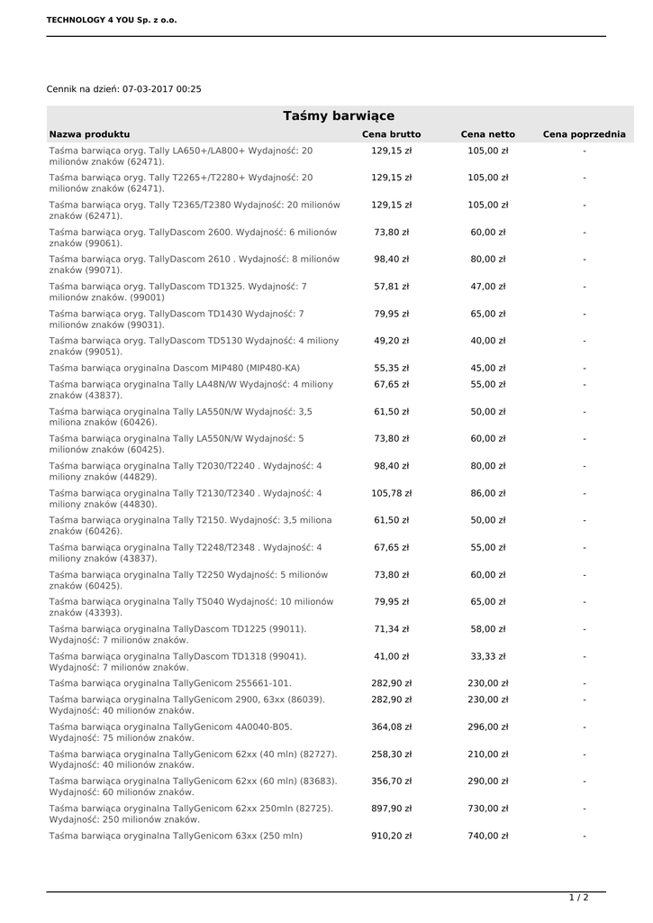 TECHNOLOGY 4 YOU Sp. z o.o. Cennik na dzień: 07-03-2017 00:25 Taśmy barwiące Nazwa produktu Cena brutto Cena netto Cena poprzednia Taśma barwiąca oryg. Tally LA650+/LA800+ Wydajność: 20 milionów znaków (62471). 129,15 zł 105,00 zł - Taśma barwiąca oryg. Tally T2265+/T2280+ Wydajność: 20 milionów znaków (62471). 129,15 zł 105,00 zł - Taśma barwiąca oryg. Tally T2365/T2380 Wydajność: 20 milionów znaków (62471). 129,15 zł 105,00 zł - Taśma barwiąca oryg. TallyDascom 2600. Wydajność: 6 milionów znaków (99061). 73,80 zł 60,00 zł - Taśma barwiąca oryg. TallyDascom 2610 . Wydajność: 8 milionów znaków (99071). 98,40 zł 80,00 zł - Taśma barwiąca oryg. TallyDascom TD1325. Wydajność: 7 milionów znaków. (99001) 57,81 zł 47,00 zł - Taśma barwiąca oryg. TallyDascom TD1430 Wydajność: 7 milionów znaków (99031). 79,95 zł 65,00 zł - Taśma barwiąca oryg. TallyDascom TD5130 Wydajność: 4 miliony znaków (99051). 49,20 zł 40,00 zł - Taśma barwiąca oryginalna Dascom MIP480 (MIP480-KA) 55,35 zł 45,00 zł - Taśma barwiąca oryginalna Tally LA48N/W Wydajność: 4 miliony znaków (43837). 67,65 zł 55,00 zł - Taśma barwiąca oryginalna Tally LA550N/W Wydajność: 3,5 miliona znaków (60426). 61,50 zł 50,00 zł - Taśma barwiąca oryginalna Tally LA550N/W Wydajność: 5 milionów znaków (60425). 73,80 zł 60,00 zł - Taśma barwiąca oryginalna Tally T2030/T2240 . Wydajność: 4 miliony znaków (44829). 98,40 zł 80,00 zł - Taśma barwiąca oryginalna Tally T2130/T2340 . Wydajność: 4 miliony znaków (44830). 105,78 zł 86,00 zł - Taśma barwiąca oryginalna Tally T2150. Wydajność: 3,5 miliona znaków (60426). 61,50 zł 50,00 zł - Taśma barwiąca oryginalna Tally T2248/T2348 . Wydajność: 4 miliony znaków (43837). 67,65 zł 55,00 zł - Taśma barwiąca oryginalna Tally T2250 Wydajność: 5 milionów znaków (60425). 73,80 zł 60,00 zł - Taśma barwiąca oryginalna Tally T5040 Wydajność: 10 milionów znaków (43393). 79,95 zł 65,00 zł - Taśma barwiąca oryginalna TallyDascom TD1225 (99011). Wydajność: 7 milionów znaków. 71,34 zł 58,00 zł - Taśma barwiąca oryginalna TallyDascom TD1318 (99041). Wydajność: 7 milionów znaków. 41,00 zł 33,33 zł - Taśma barwiąca oryginalna TallyGenicom 255661-101. 282,90 zł 230,00 zł - Taśma barwiąca oryginalna TallyGenicom 2900, 63xx (86039). Wydajność: 40 milionów znaków. 282,90 zł 230,00 zł - Taśma barwiąca oryginalna TallyGenicom 4A0040-B05. Wydajność: 75 milionów znaków. 364,08 zł 296,00 zł - Taśma barwiąca oryginalna TallyGenicom 62xx (40 mln) (82727). Wydajność: 40 milionów znaków. 258,30 zł 210,00 zł - Taśma barwiąca oryginalna TallyGenicom 62xx (60 mln) (83683). Wydajność: 60 milionów znaków. 356,70 zł 290,00 zł - Taśma barwiąca oryginalna TallyGenicom 62xx 250mln (82725). Wydajność: 250 milionów znaków. 897,90 zł 730,00 zł - Taśma barwiąca oryginalna TallyGenicom 63xx (250 mln) 910,20 zł 740,00 zł - 1/2 TECHNOLOGY 4 YOU Sp. z o.o. (86043). Wydajność: 250 milionów znaków. Taśma barwiąca oryginalna TallyGenicom 63xx (86041). Wydajność: 60 milionów znaków. 363,00 zł 295,12 zł - Taśma barwiąca oryginalna TallyGenicom MT6xx, T6xxx (80294). Wydajność: 25 milionów znaków. 153,75 zł 125,00 zł - Taśma barwiąca oryginalna TallyGenicom MT6xx, T6xxx (80296). Wydajność: 50 milionów znaków. 282,90 zł 230,00 zł - Taśma do drukarki Citic PB2 172,20 zł 140,00 zł - Taśma do drukarki T4Y-100 86,10 zł 70,00 zł - Taśma do drukarki T4Y-1000 283,00 zł 230,08 zł - Taśma do drukarki T4Y-320 135,30 zł 110,00 zł - Taśma do drukarki T4Y-321 159,90 zł 130,00 zł - Taśma do drukarki T4Y-350 135,30 zł 110,00 zł - Taśma do drukarki T4Y-650 166,05 zł 135,00 zł - Taśma do drukarki T4Y-8800 289,05 zł 235,00 zł - Taśma do drukarki T4Y-9000 295,20 zł 240,00 zł - 2/2 Powered by TCPDF (www.tcpdf.org)