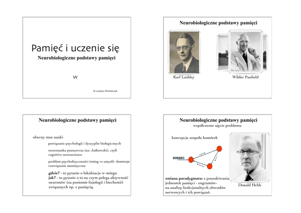 Neurobiologiczne podstawy pamięci Pamięć i uczenie się Neurobiologiczne podstawy pamięci Karl Lashley W Wilder Panfield dr Łukasz Michalczyk Neurobiologiczne podstawy pamięci Neurobiologiczne podstawy pamięci współczesne ujęcie problemu obecny stan nauki koncepcja zespołu komórek powiązanie psychologii i dyscyplin biologicznych neuronauka poznawcza (za: Jaśkowski), czyli cognitive neuroscience problem psychofizyczności (mózg vs umysł)- dominuje rozwiązanie monistyczne gdzie? - to pytanie o lokalizacje w mózgu jak? - to pytanie o to na czym polega aktywność neuronów (za poziomie fizjologii i biechemii) związanych np. z pamięcią. zmiana paradygmatu: z poszukiwania jednostek pamięci - engramówna analizę funkcjonalnych obwodów nerwowych i ich powiązań. Donald Hebb grzbietowa kora przedczołowa brzuszna kora przedczołowa bruzda środkowa zakręty bruzdy bruzda boczna przyśrodkowa część płata skroniowego kora przedczołowa śródmózgowie konary mózgu blaszka czworacza System limbiczny emocje motywacje pamięć hipokamp sklepienie ciało migdałowate jądro ogoniaste ciało suteczkowate jądro ogoniaste jądro ogoniaste skorupa gałka blada jądro soczewkowate jądro ogoniaste skorupa Gdzie jest pamięć w mózgu Kora przedczołowa pamięć robocza prążkowie prążkowie pamięć proceduralna/ nawyki Jądro migdałowate Pamięć proceduralna/ emocjonalna Hipokamp Pamięć przestrzenna, deklaratywna Komórki mózgowe Neurony pamięć proceduralna / warunkowanie mięśni szkieletowych