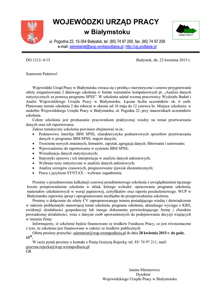 WOJEWÓDZKI URZĄD PRACY w Białymstoku ul. Pogodna 22, 15-354 Białystok, tel. (85) 74 97 200, fax. (85) 74 97 209 e-mail: [email protected], http://up.podlasie.pl DO.1212- 6/15 Białystok, dn. 22 kwietnia 2015 r. Szanowni Państwo! Wojewódzki Urząd Pracy w Białymstoku zwraca się z prośbą o merytoryczne i cenowe przygotowanie oferty zorganizowania 2 dniowego szkolenia w formie warsztatów komputerowych pt. „Analiza danych statystycznych za pomocą programu SPSS”. W szkoleniu udział wezmą pracownicy Wydziału Badań i Analiz Wojewódzkiego Urzędu Pracy w Białymstoku. Łączna liczba uczestników ok. 6 osób. Planowany termin szkolenia 2 dni robocze w okresie od 18 maja do 12 czerwca br. Miejsce szkolenia: w siedzibie Wojewódzkiego Urzędu Pracy w Białymstoku, ul. Pogodna 22, przy stanowiskach uczestników szkolenia. Celem szkolenia jest przekazanie pracownikom praktycznej wiedzy na temat przetwarzania danych oraz ich raportowania. Zakres tematyczny szkolenia powinien obejmować m.in.: Podstawowy interfejs IBM SPSS, charakterystyka podstawowych sposobów przetwarzania danych w programie IBM SPSS, import danych; Tworzenie nowych zmiennych, formatów, zapytań, agregacja danych, filtrowanie i sortowanie; Wprowadzenie do raportowania w systemie IBM SPSS; Wizualizacja danych statystycznych; Statystyki opisowe i ich interpretacja w analizie danych ankietowych; Wybrane testy statystyczne w analizie danych ankietowych; Analiza szeregów czasowych, prognozowanie zjawisk ekonomicznych; Praca z językiem SYNTAX – wybrane zagadnienia. Prosimy o przedstawienie kalkulacji cenowej przedmiotowego szkolenia z uwzględnieniem łącznego kosztu przeprowadzenia szkolenia w skład, którego wchodzi: opracowanie programu szkolenia, materiałów szkoleniowych w wersji papierowej, certyfikatów oraz raportu poszkoleniowego. WUP w Białymstoku zapewnia sprzęt i oprogramowanie niezbędne do przeprowadzenia szkolenia. Prosimy o dołączenie do oferty CV zaproponowanego trenera posiadającego wiedzę i doświadczenie w zakresie problematyki stanowiącej temat szkolenia, programu szkolenia, aktualnego wyciągu z KRS, ewidencji działalności gospodarczej lub innego dokumentu potwierdzającego formę i charakter prowadzonej działalności, wraz z danymi osób upoważnionych do podejmowania decyzji wiążących w imieniu firmy. Informujemy, iż szkolenie będzie finansowane ze środków Funduszu Pracy, co jest równoznaczne z tym, że szkolenie jest finansowane w całości ze środków publicznych. Ofertę prosimy przesyłać: [email protected] do dnia 28 kwietnia 2015 r. do godz. 1530. W razie pytań prosimy o kontakt z Panią Grażyną Rojecką: tel. 85/ 74 97 211, mail: [email protected] GR Janina Mironowicz Dyrektor Wojewódzkiego Urzędu Pracy w Białymstoku