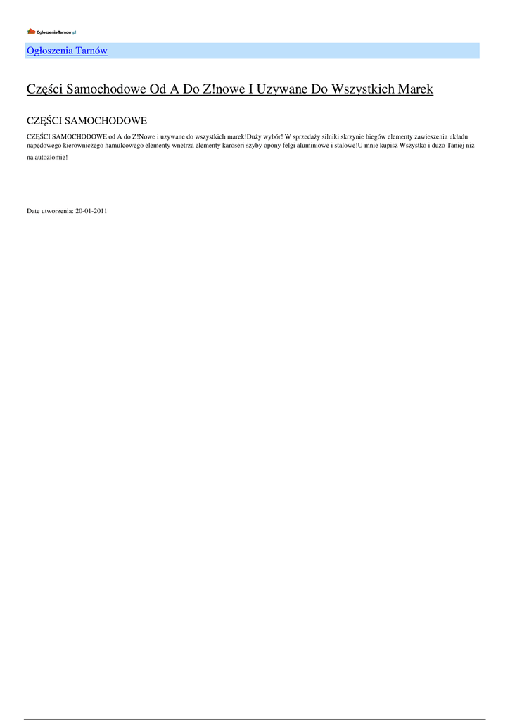 Ogłoszenia Tarnów Części Samochodowe Od A Do Z!nowe I Uzywane Do Wszystkich Marek CZĘŚCI SAMOCHODOWE CZĘŚCI SAMOCHODOWE od A do Z!Nowe i uzywane do wszystkich marek!Duży wybór! W sprzedaży silniki skrzynie biegów elementy zawieszenia układu napędowego kierowniczego hamulcowego elementy wnetrza elementy karoseri szyby opony felgi aluminiowe i stalowe!U mnie kupisz Wszystko i duzo Taniej niz na autozlomie! Date utworzenia: 20-01-2011