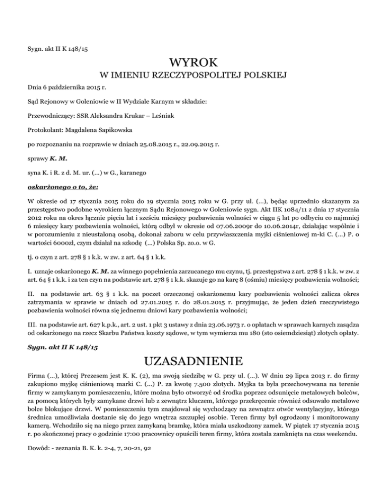 Sygn. akt II K 148/15 WYROK W IMIENIU RZECZYPOSPOLITEJ POLSKIEJ Dnia 6 października 2015 r. Sąd Rejonowy w Goleniowie w II Wydziale Karnym w składzie: Przewodniczący: SSR Aleksandra Krukar – Leśniak Protokolant: Magdalena Sapikowska po rozpoznaniu na rozprawie w dniach 25.08.2015 r., 22.09.2015 r. sprawy K. M. syna K. i R. z d. M. ur. (...) w G., karanego oskarżonego o to, że: W okresie od 17 stycznia 2015 roku do 19 stycznia 2015 roku w G. przy ul. (...), będąc uprzednio skazanym za przestępstwo podobne wyrokiem łącznym Sądu Rejonowego w Goleniowie sygn. Akt IIK 1084/11 z dnia 17 stycznia 2012 roku na okres łącznie pięciu lat i sześciu miesięcy pozbawienia wolności w ciągu 5 lat po odbyciu co najmniej 6 miesięcy kary pozbawienia wolności, którą odbył w okresie od 07.06.2009r do 10.06.2014r, działając wspólnie i w porozumieniu z nieustaloną osobą, dokonał zaboru w celu przywłaszczenia myjki ciśnieniowej m-ki C. (...) P. o wartości 6000zł, czym działał na szkodę (...) Polska Sp. zo.o. w G. tj. o czyn z art. 278 § 1 k.k. w zw. z art. 64 § 1 k.k. I. uznaje oskarżonego K. M. za winnego popełnienia zarzucanego mu czynu, tj. przestępstwa z art. 278 § 1 k.k. w zw. z art. 64 § 1 k.k. i za ten czyn na podstawie art. 278 § 1 k.k. skazuje go na karę 8 (ośmiu) miesięcy pozbawienia wolności; II. na podstawie art. 63 § 1 k.k. na poczet orzeczonej oskarżonemu kary pozbawienia wolności zalicza okres zatrzymania w sprawie w dniach od 27.01.2015 r. do 28.01.2015 r. przyjmując, że jeden dzień rzeczywistego pozbawienia wolności równa się jednemu dniowi kary pozbawienia wolności; III. na podstawie art. 627 k.p.k., art. 2 ust. 1 pkt 3 ustawy z dnia 23.06.1973 r. o opłatach w sprawach karnych zasądza od oskarżonego na rzecz Skarbu Państwa koszty sądowe, w tym wymierza mu 180 (sto osiemdziesiąt) złotych opłaty. Sygn. akt II K 148/15 UZASADNIENIE Firma (...), której Prezesem jest K. K. (2), ma swoją siedzibę w G. przy ul. (...). W dniu 29 lipca 2013 r. do firmy zakupiono myjkę ciśnieniową marki C. (...) P. za kwotę 7.500 złotych. Myjka ta była przechowywana na terenie firmy w zamykanym pomieszczeniu, które można było otworzyć od środka poprzez odsunięcie metalowych bolców, za pomocą których były zamykane drzwi lub z zewnątrz kluczem, którego przekręcenie również odsuwało metalowe bolce blokujące drzwi. W pomieszczeniu tym znajdował się wychodzący na zewnątrz otwór wentylacyjny, którego średnica umożliwiała dostanie się do jego wnętrza szczupłej osobie. Teren firmy był ogrodzony i monitorowany kamerą. Wchodziło się na niego przez zamykaną bramkę, która miała uszkodzony zamek. W piątek 17 stycznia 2015 r. po skończonej pracy o godzinie 17:00 pracownicy opuścili teren firmy, która została zamknięta na czas weekendu. Dowód: - zeznania B. K. k. 2-4, 7, 20-21, 92 • faktura zakupu k. 5 • oświadczenie pokrzywdzonego k. 44 • płyta CD k. 47 • protokół oględzin miejsca k. 48-48a W niedzielę 19 stycznia 2015 r., około godziny 19:15 do mieszkającego w G. przy u. S. K. M.o przyszedł jego znajomy noszący pseudonim (...) i zaproponował mu kradzież urządzenia z terenu firmy (...), na co K. M. wyraził zgodę. Miał on za to dostać najpierw kwotę 100 złotych, a później dodatkowo część z pieniędzy uzyskanych ze sprzedaży ukradzionego urządzenia. K. M. umówił się ze swoim znajomym na spotkanie pod budką przy ul. (...). Jego znajomy przyjechał tam samochodem osobowym marki F. (...) koloru zielonego, którym następnie oboje udali się pod siedzibę firmę (...). Na teren firmy (...) weszli przez furtkę. Znajomy K. M. wszedł poprzez otwór wentylacyjny do pomieszczenia, w którym znajdowała się myjka ciśnieniowa, po czym odsunął metalowe bolce blokujące drzwi wejściowe do tego pomieszczenia i opuścił je zabierając ze sobą myjkę ciśnieniową. Następnie przekazał tę myjkę K. M., który podciągnął ją pod bramę. Potem oboje załadowali ją do pojazdu należącego do mężczyzny o pseudonimie (...). Znajomy K. M. dał mu wówczas obiecane pieniądze w kwocie 100 złotych, po czym odjechał swoim samochodem, w którym znajdowała się ukradziona myjka ciśnieniowa. Natomiast K. M. wrócił do domu pieszo. Dowód: - wyjaśnienia oskarżonego k. 29-30, 33,-34, 91 • zeznania B. K. k. 2-4, 7, 20-21, 92 • płyta CD k. 47 • protokół oględzin miejsca k. 48-48a W poniedziałek, w dniu 20 stycznia 2015 r., przybyli na teren firmy (...) pracownicy stwierdzili brak myjki ciśnieniowej i zgłosili to zajmującej się w firmie sprawami administracyjnymi B. K., która z kolei powiadomiła o tym fakcie Policję. Dowód: - zeznania B. K. k. 2-4, 7, 20-21, 92 Po około dwóch dniach do K. M. ponownie przyjechał jego znajomy noszący pseudonim (...) i zapytał go czy może u niego schować ukradzioną myjkę ciśnieniową, gdyż nie może jej sprzedać. K. M. wyraził na to zgodę, po czym oboje zawieźli tę myjkę na działkę należącą do rodziców K. M., którzy nic o tym nie wiedzieli i schowali w znajdującej się tam szopie. Dowód: - wyjaśnienia oskarżonego k. 29-30, 33,-34, 91 • zeznania K. J. k.16-17, 97 W dniu 27 stycznia 2015 r. K. M. został zatrzymany przez Policję w związku z podejrzeniem kradzieży z terenu firmy (...) myjki ciśnieniowej. Wskazał on wówczas przybyłym na miejsce policjantom miejsce ukrycia myjki i wydał ją funkcjonariuszom Policji. Myjka została zwrócona B. K.. Podczas zatrzymania K. M. na miejscu była obecna jego matka K. J.. Dowód: - wyjaśnienia oskarżonego k. 29-30, 33,-34, 91 • zeznania B. K. k. 2-4, 7, 20-21, 92 • zeznania K. J. k.16-17, 97 • protokół zatrzymania k. 11 • protokół przeszukania k. 13-15 • protokół oględzin k. 18-19 • protokół okazania k. 20-21 • pokwitowanie odbioru k. 39 K. M. ma obecnie 31 lat. Jest bezdzietnym kawalerem. Ma wykształcenie podstawowe, nie ma wyuczonego za
