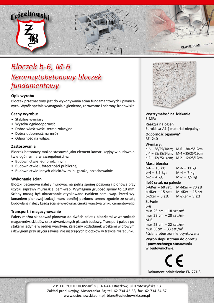 Bloczek b-6, M-6 Keramzytobetonowy bloczek fundamentowy Opis wyrobu Bloczek przeznaczony jest do wykonywania ścian fundamentowych i piwnicznych. Wyrób spełnia wymagania higieniczne, zdrowotne i ochrony środowiska. Cechy wyrobu: • • • • • Stabilne wymiary Wysoka ognioodporność Dobre właściwości termoizolacyjne Dobra odporność na mróz Odporność na wilgoć Zastosowania Bloczek betonowy można stosować jako element konstrukcyjny w budownictwie ogólnym, a w szczególności w: • Budownictwie jednorodzinnym • Budownictwie użyteczności publicznej • Budownictwie innych obiektów m.in. garaże, przechowalnie Wykonanie ścian Bloczki betonowe należy murować na pełną spoinę poziomą i pionową przy użyciu zaprawy murarskiej cem-wap. Wymagana grubość spoiny to 10 mm. Ściany muszą być obustronnie otynkowane tynkiem cem- wap. Przed wykonaniem pionowej izolacji muru poniżej poziomu terenu zgodnie ze sztuką budowlaną należy każdą ścianę wyrównać cienką warstwą tynku cementowego. Transport i magazynowanie Palety można składować pionowo do dwóch palet z bloczkami w warunkach magazynów, składów oraz utwardzonych placach budowy. Transport palet z pustakami jedynie w jednej warstwie. Zalecany rozładunek wózkami widłowymi i dźwigiem przy użyciu zawiesi nie niszczących bloczków w trakcie rozładunku. Wytrzymałość na ściskanie 5 MPa Reakcja na ogień Euroklasa A1 ( materiał niepalny) Odporność ogniowa* REI 240 Wymiary: b-6 – 38/25/14cm; M-6 – 38/25/12cm b-4 – 25/25/14cm; M-4 – 25/25/12cm b-2 – 12/25/14cm; M-2 – 12/25/12cm Masa bloczka b-6 – 13 kg; M-6 – 11 kg b-4 – 8,5 kg; M-4 – 7 kg b-2 – 4 kg; M-2 – 3,5 kg Ilość sztuk na palecie b-6Ker – 60 szt; M-6Ker – 70 szt b-4Ker – 15 szt; M-4Ker – 15 szt b-2Ker – 5 szt; M-2Ker – 5 szt Zużycie b-6 mur 25 cm – 18 szt./m2 mur 38 cm – 28 szt./m2 M-6 mur 25 cm – 22 szt./m2 mur 38cm – 33 szt./m2 *ściana obustronnie otynkowana Wyrób dopuszczony do obrotu i powszechnego stosowania w budownictwie. Dokument odniesienia: EN 771-3 Z.P.H.U. ”UCIECHOWSKI” s.j. 63-440 Raszków, ul. Krotoszyńska 13 Zakład produkcyjny, Moszczanka 2a; tel. 62 734 42 68, fax. 62 734 34 57 www.uciechowski.com.pl, [email protected]