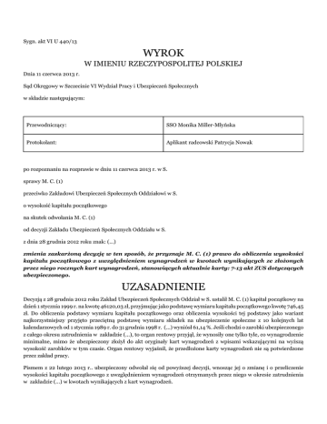 Sygn. akt VI U 440/13 WYROK W IMIENIU RZECZYPOSPOLITEJ POLSKIEJ Dnia 11 czerwca 2013 r. Sąd Okręgowy w Szczecinie VI Wydział Pracy i Ubezpieczeń Społecznych w składzie następującym: Przewodniczący: SSO Monika Miller-Młyńska Protokolant: Aplikant radcowski Patrycja Nowak po rozpoznaniu na rozprawie w dniu 11 czerwca 2013 r. w S. sprawy M. C. (1) przeciwko Zakładowi Ubezpieczeń Społecznych Oddziałowi w S. o wysokość kapitału początkowego na skutek odwołania M. C. (1) od decyzji Zakładu Ubezpieczeń Społecznych Oddziału w S. z dnia 28 grudnia 2012 roku znak: (...) zmienia zaskarżoną decyzję w ten sposób, że przyznaje M. C. (1) prawo do obliczenia wysokości kapitału początkowego z uwzględnieniem wynagrodzeń w kwotach wynikających ze złożonych przez niego rocznych kart wynagrodzeń, stanowiących aktualnie karty: 7-13 akt ZUS dotyczących ubezpieczonego. UZASADNIENIE Decyzją z 28 grudnia 2012 roku Zakład Ubezpieczeń Społecznych Oddział w S. ustalił M. C. (1) kapitał początkowy na dzień 1 stycznia 1999 r. na kwotę 46120,03 zł, przyjmując jako podstawę wymiaru kapitału początkowego kwotę 746,45 zł. Do obliczenia podstawy wymiaru kapitału początkowego oraz obliczenia wysokości tej podstawy jako wariant najkorzystniejszy przyjęto przeciętną podstawę wymiaru składek na ubezpieczenie społeczne z 10 kolejnych lat kalendarzowych od 1 stycznia 1989 r. do 31 grudnia 1998 r. (...) wyniósł 61,14 %. Jeśli chodzi o zarobki ubezpieczonego z całego okresu zatrudnienia w zakładzie (...), to organ rentowy przyjął, że wynosiły one tylko tyle, co wynagrodzenie minimalne, mimo że ubezpieczony złożył do akt oryginały kart wynagrodzeń z wpisami wskazującymi na wyższą wysokość zarobków w tym czasie. Organ rentowy wyjaśnił, że przedłożone karty wynagrodzeń nie są potwierdzone przez zakład pracy. Pismem z 22 lutego 2013 r.. ubezpieczony odwołał się od powyższej decyzji, wnosząc jej o zmianę i o przeliczenie wysokości kapitału początkowego z uwzględnieniem wynagrodzeń otrzymanych przez niego w okresie zatrudnienia w zakładzie (...) w kwotach wynikających z kart wynagrodzeń. W odpowiedzi na odwołanie organ rentowy wniósł o jego oddalenie w całości, podtrzymując argumentację wyrażoną w uzasadnieniu zaskarżonej decyzji. Sąd ustalił następujący stan faktyczny: M. C. (1), urodzony (...), w dniu 12 lipca 2011 roku złożył w Zakładzie Ubezpieczeń Społecznych Oddziale w S. wniosek o ustalenie kapitału początkowego. Decyzją z 28 grudnia 2012 roku organ rentowy ustalił M. C. kapitał początkowy na dzień 1 stycznia 1999 r. na kwotę 46120,03 zł, przyjmując jako podstawę wymiaru kapitału początkowego kwotę 746,45 zł. Do obliczenia podstawy wymiaru kapitału początkowego oraz obliczenia wysokości tej podstawy jako wariant najkorzystniejszy przyjęto przeciętną podstawę wymiaru składek na ubezpieczenie społeczne z 10 kolejnych lat kalendarzowych od 1 stycznia 1989 r. do 31 grudnia 1998 r. (...) wyniósł 61,14 %. Za okres zatrudnienia w zakładzie (...) przyjęto wynagrodzenia minimalne. Niesporne, a nadto dowody: - wniosek - k. 1 plik KPU; - obliczenie wwpw - k. 24 plik KPU. W okresie od 1 września 1987 r. do 1 października 1996 r. M. C. był zatrudniony w pełnym wymiarze czasu pracy w (...) Zakładach (...) na stanowisku ślusarza. W celu udokumentowania otrzymywanych podczas przedmiotowego zatrudnienia zarobków ubezpieczony złożył w ZUS oryginalne karty wynagrodzeń z lat 1987 – 1995, które otrzymał od pracownicy kadr swojego pracodawcy. Karty te zawierają dane przepisane z poszczególnych list płac i – w głównych rubrykach – obejmują wyłącznie dane o należnościach, które stanowiły podstawę wymiaru składek na ubezpieczenie społeczne. Karty wynagrodzeń z okresu od 1987 r. do 1992 r. zostały sporządzone przez Z. W. (1), który zatrudniony był w zakładach (...) na stanowisku samodzielnego księgowego i do którego obowiązków należała m.in. rachuba płac i sprawy związane z ubezpieczeniami społecznymi pracowników. Karty z kolejnych lat zostały sporządzone przez pracownicę, którą przeszkolił Z. W.. Karty te zostały przekazane bezpośrednio pracownikom z uwagi na fakt przejęcia zakładu przez prywatnego pracodawcę i problemy z przechowywaniem dokumentacji pracowniczej. Obecnie dokumentacja dotycząca pracowników znajduje się w piwnicy prywatnego domu, a dostęp do niej jest wysoce utrudniony. Dowody: - świadectwo pracy - k. 5 plik KPU; - karty wynagrodzeń - k. 7 - 13 plik KPU; - dokumentacja osobowa z okresu zatrudnienia: umowy o pracę - k. 12-14, angaże - k. 15-21; - zeznania świadka Z. W. (1) - k. 41-42 akt sądowych; - artykuł prasowy – k. akt sądowych. Sąd zważył, co następuje: Odwołanie zasługiwało na uwzględnienie. Zgodnie z treścią przepisu artykułu 174 ust. 1 i 3 ustawy z dnia 17 grudnia 1998 roku o emeryturach i rentach z Funduszu Ubezpieczeń Społecznych, kapitał początkowy ustala się na zasadach określonych w art. 53, z uwzględnieniem ust. 2-12. Przy czym, podstawę wymiaru kapitału początkowego ustala się na zasadach określonych w art. 15, 16, 17 ust. 1 i 3 oraz art. 18, z tym że okres kolejnych 10 lat kalendarzowych ustala się z okresu od dnia 1 stycznia 1980 r. do dnia 31 grudnia 1998 r. Przepis artykułu 15 ust.1 ustawy o emeryturach i rentach z FUS stanowi zaś, że podstawę wymiaru emerytury i renty stanowi ustalona w sposób określony w ust. 4 i 5 przeciętna podstawa wymiaru składki na ubezpieczenia emerytalne i rentowe lub na ubezpieczenie społeczne na podstawie przepisów prawa polskiego w okresie kolejnych 10 lat kalendarzowych, wybranych przez zainteresowanego z ostatnich 20 lat kalendarzowych poprzedzających bezpośrednio rok, w którym zgłoszono wniosek o emeryturę lub rentę, z uwzględnieniem ust. 6 i art. 176. Przy czym, w celu ustalenia podstawy wymiaru emerytury lub renty obl