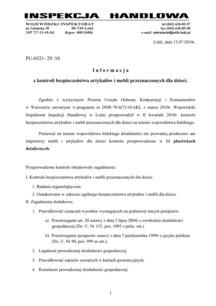 --------------------------------------------------------------------------------------------------------------------------WOJEWÓDZKI INSPEKTORAT ul. Gdańska 38 90-730 Łódź NIP 727-11-49-261 Regon 000136886 tel (042) 636-03-57 fax (042) 636-85-50 e-mail: [email protected] Łódź, dnia 13.07.2010r. PU-0321- 29 /10 Informacja z kontroli bezpieczeństwa artykułów i mebli przeznaczonych dla dzieci. Zgodnie z wytycznymi Prezesa Urzędu Ochrony Konkurencji i Konsumentów w Warszawie zawartymi w programie nr DNR-70-6(7)/10/AKL z marca 2010r. Wojewódzki Inspektorat Inspekcji Handlowej w Łodzi przeprowadził w II kwartale 2010r. kontrole bezpieczeństwa artykułów i mebli przeznaczonych dla dzieci na terenie województwa łódzkiego. Ponieważ na terenie województwa łódzkiego działalności nie prowadzą producenci ani importerzy mebli i artykułów dla dzieci kontrole przeprowadzono w 11 placówkach detalicznych. Przeprowadzone kontrole obejmowały zagadnienia: I. Kontrola bezpieczeństwa artykułów i mebli przeznaczonych dla dzieci. 1. Badania organoleptyczne. 2. Oznakowanie w zakresie ogólnego bezpieczeństwa artykułów i mebli dla dzieci. II. Zagadnienia dodatkowe. 1. Prawidłowość oznaczeń wyrobów wymaganych na podstawie innych przepisów. a) Przestrzeganie art. 20 ustawy z dnia 2 lipca 2004r o swobodzie działalności gospodarczej (Dz. U. Nr 155, poz. 1095 z późn. zm.) b) Przestrzeganie przepisów ustawy z dnia 7 października 1999r o języku polskim (Dz. U. Nr 90, poz. 999 ze zm.). 2. Legalność prowadzonej działalności gospodarczej. 3. Prawidłowość zapisów zawartych w kartach gwarancyjnych. 4. Rzetelność prowadzonej działalności gospodarczej. 1 Ogółem w 11 jednostkach skontrolowano 54 partie wyrobów dla dzieci o łącznej wartości 52.267 zł w tym: - 33 partie o wartości 22.991 zł produkcji krajowej, - 18 partii o wartości 29.191 zł z importu, - 3 partie o wartości 85 zł z krajów UE. Kontrolą objęto: - 24 partie wózków dziecięcych o wartości 41.818 zł, - 9 partii wysokich krzesełek do karmienia o wartości 4.813 zł, - 8 partii smoczków uspokajających o wartości 168 zł, - 4 partie łóżeczek o wartości 1.837 zł, - 4 partie kojców mieszkaniowych o wartości 2.293 zł, - 2 partie chodzików dziecięcych o wartości 1.256 zł, - 2 partie wyrobów do mocowania smoczków o wartości 31 zł, - 1 partię szelek do wózka o wartości 51 zł. W wyniku przeprowadzonych kontroli zakwestionowano w 10 placówkach 20 partii wyrobów o łącznej wartości 20.092 zł w tym: - 11 partii wózków o wartości 17.009 zł, - 3 partie krzesełek wysokich o wartości 1.062zł, - 2 partie chodzików o wartości 1.256 zł, - 1 partia łóżeczek o wartości 648 zł, - 1 partia szelek o wartości 51 zł, - 1 partia wyrobów do mocowania smoczków o wartości 16 zł, - 1 partia smoczków do uspokajania o wartości 50 zł. Wyroby kwestionowano z uwagi na nieprawidłowe oznakowanie w zakresie bezpieczeństwa oraz niepełne określenie firmy przedsiębiorcy: - 19 partii wyrobów (wózki, krzesełka wysokie, chodziki dziecięce, łóżeczka, smoczki, szelki, wyroby do mocowania) o wartości 19.874 zł kwestionowano z uwagi na oznakowanie w zakresie bezpieczeństwa, - 9 partii wyrobów (wózki, krzesełka wysokie, chodziki dziecięce) o wartości 11.267 zł kwestionowano z uwagi na niepełne określenie firmy przedsiębiorcy. 2 Ponadto w kartach gwarancyjnych dołączonych do 5 partii wyrobów (4 partie wózków i 1 partia kojców) o łącznej wartości 6.794 zł brakowało zapisu: „Gwarancja na produkt nie wyłącza, nie ogranicza, ani nie zawiesza uprawnień kupującego wynikających z niezgodności towaru z umową”. I. Kontrola bezpieczeństwa artykułów i mebli przeznaczonych dla dzieci • Ocena organoleptyczna Przy ocenie organoleptycznej w zakresie bezpieczeństwa uwzględniono cechy wyrobów mogących stwarzać zagrożenie, oddziaływania na inne produkty, wygląd, zgodność z podstawowymi właściwościami użytkowymi, warunki bezpieczeństwa oraz kategorie konsumentów używających produkt – obejmując nią 54 partie o wartości 52.267 zł. Zbadane partie wyrobów dla dzieci nie posiadały cech mogących stwarzać zagrożenie dla użytkowników. Elementy ruchome były osłonięte i nie posiadały szczelin niebezpiecznych dla dzieci. Krawędzie, zakończenia i narożniki były zabezpieczone osłonami i zaokrąglone (nie było żadnych ostrych krawędzi). Wózki wyposażone były w hamulce postojowe oraz urządzenia blokujące zapobiegające złożeniu się wózków. Siedziska były wyposażone w systemy zabezpieczające. Kojce wyposażone były w rączki pomocne przy nauce wstawania. Brzegi górne, boki oraz dno były tapicerowane dla ochrony przed ewentualnymi uderzeniami. Każdy pasek ramieniowy w szelkach był regulowany i nie krzyżowały się ukośnie z przodu. Łańcuszki do mocowania smoczka miały na stałe zamocowane zapinacze. Poszczególne elementy były tak przymocowane że nie można było ich odłączyć. Badane smoczki posiadały tarczki. Doustna strona tarczki była gładka, smoczki nie posiadały żadnych odłączalnych elementów. Chodziki wyposażone były w paski krokowe, posiadały mechanizmy blokujące. Koła skrętne z łatwością się obracały. Drewno i materiały, z których wykonane były łóżeczka były czyste i nie posiadały śladów zgnilizny. Wysokie krzesełka dla dzieci wyposażone były w mechanizmy blokujące, zapobiegające niezamierzonemu złożeniu się krzesełka. Wyposażone były w podłokietniki. • Oznakowanie w zakresie ogólnego bezpieczeństwa artykułów i mebli dla dzieci. 3 Oceny prawidłowości oznakowania wyrobów dla dzieci dokonano zgodnie z wymaganiami określonymi w ustawie z dnia 12 grudnia 2003r o ogólnym bezpieczeństwie produktów (Dz. U. Nr 229, poz. 2275 ze zm.) w 11 jednostkach. Kontrolą w powyższym zakresie objęto 54 partie wyrobów o wartości 52.267 zł. Zakwestionowano 