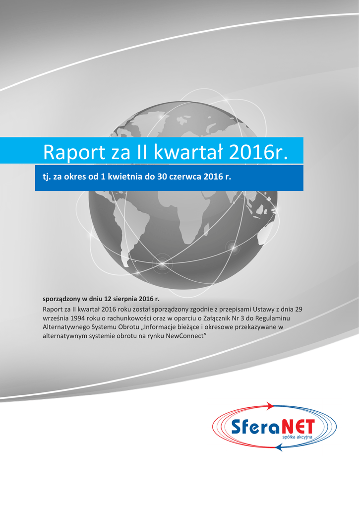 Raport za II kwartał 2016r. tj. za okres od 1 kwietnia do 30 czerwca 2016 r. sporządzony w dniu 12 sierpnia 2016 r. Raport za II kwartał 2016 roku został sporządzony zgodnie z przepisami Ustawy z dnia 29 września 1994 roku o rachunkowości oraz w oparciu o Załącznik Nr 3 do Regulaminu Alternatywnego Systemu Obrotu „Informacje bieżące i okresowe przekazywane w alternatywnym systemie obrotu na rynku NewConnect” Spis treści I. Podstawowe informacje o emitencie ............................................................................... 2 II. Informacje o zasadach przyjętych przy sporządzaniu raportu ......................................... 4 III. Skrócone sprawozdanie finansowe ...............................................................................10 IV. Charakterystyka dokonań i niepowodzeń wraz z opisem czynników ..............................14 i zdarzeń mających wpływ na osiągnięte wyniki...................................................................14 V. Prognozy finansowe ......................................................................................................21 VI. Opis organizacji grupy kapitałowej .................................................................................21 VII. Informacje na temat aktywności w obszarze rozwiązań innowacyjnych wprowadzanych w przedsiębiorstwie ..................................................................................................................21 VIII. Informacja dotycząca liczby osób zatrudnionych przez emitenta, w przeliczeniu na pełne etaty .....................................................................................................................................21 www.sferanet.pl 1 I. Podstawowe informacje o emitencie Dane teleadresowe nazwa firmy adres siedziby numer telefonu adres poczty elektronicznej adres strony internetowej sąd rejestrowy numer krs regon nip SferaNet Spółka Akcyjna ul. PCK 8, 43-300 Bielsko-Biała +48 33 498 44 55 +48 33 498 44 66 [email protected] www.sferanet.pl Sąd Rejonowy w Bielsku-Białej, VIII Wydział Krajowego Rejestru Sądowego 0000464462 072888096 9372408825 Organy Spółki Zarząd: Bogusław Sromek - Prezes Zarządu Rada Nadzorcza: Michał Damek Krzysztof Kotas Lesław Tlaga Jacek Cieciak Mirosław Hejosz - Przewodniczący Rady Nadzorczej - Członek Rady Nadzorczej - Członek Rady Nadzorczej - Członek Rady Nadzorczej - Członek Rady Nadzorczej Prokurenci: Anna Stanaszek www.sferanet.pl - Prokura samoistna 2 Akcjonariat Na dzień sporządzenia niniejszego raportu kapitał zakładowy Spółki wynosi 4 606 889,00 zł i dzieli się na 4 606 889 akcji zwykłych na okaziciela o wartości nominalnej 1,00 zł każda akcja, w tym: − 2 000 000 akcji serii A, − 500 000 akcji serii B, − 318 000 akcji serii C, − 600 000 akcji serii D, − 1.188.889 akcji serii E. Tabela 1 Wykaz akcjonariuszy posiadający przynajmniej 5% w głosach na walnym zgromadzeniu Spółki (według stanu na dzień 12 sierpnia 2016 roku) 1 770 146 1 480 365 369 841 Udział w kapitale zakładowym 38,42% 32,13% 8,03% Udział w liczbie głosów 38,42% 32,13% 8,03% 986 537 986 537 21,42% 21,42% 4 606 889 4 606 889 100% 100% Lp. Dane akcjonariusza Liczba akcji Liczba głosów 1. 2. 3. Piotr Londzin Henryk Wizner Michał Moruń 1 770 146 1 480 365 369 841 4. Pozostali suma Źródło: Spółka Struktura akcjonariatu SferaNET Pozostali 21,42% Piotr Londzin 38,42% Michał Moruń 8,03% Henryk Wizner 32,13% Wykres 1 Struktura akcjonariatu powyżej 5% udziału w głosach na walnym zgromadzeniu Źródło: Spółka www.sferanet.pl 3 II. Informacje o zasadach przyjętych przy sporządzaniu raportu Omówienie przyjętych zasad (polityki) rachunkowości, w tym metod wyceny aktywów i pasywów (także amortyzacji), pomiaru wyniku finansowego oraz sposobu sporządzania sprawozdania finansowego w zakresie, w jakim ustawa pozostawia jednostce prawo wyboru. Podstawy prawne: 1. Sprawozdanie finansowe zostało przygotowane zgodnie z wymogami Ustawy z dnia 29 września 1994 roku o rachunkowości obowiązującymi jednostki (tekst jednolity - Dz.U. z 2013 r. poz. 330 z późniejszymi zmianami). 2. W zakresie nie objętym ustawą o rachunkowości spółka stosuje Krajowe Standardy Rachunkowości. 3. W zakresie nieuregulowanym powyższymi aktami, spółka stosuje Międzynarodowe Standardy Rachunkowości. 4. W przypadku nieuregulowania istotnych zagadnień występujących w spółce powyższymi aktami, kierownik jednostki decyduje w formie pisemnej o zastosowanym rozwiązaniu, opisując to rozwiązanie w informacji dodatkowej przy sporządzaniu sprawozdania finansowego. • Sprawozdanie finansowe jest sporządzane na dzień zamknięcia ksiąg rachunkowych oraz na każdy inny dzień bilansowy. • Ewidencja kosztów prowadzona jest w układzie rodzajowym. • Sprawozdanie finansowe spółki obejmuje wprowadzenie do sprawozdania finansowego, bilans, rachunek zysków i strat, rachunek przepływów pieniężnych, zestawienie zmian w kapitale własnym i informację dodatkową. • Jednostka sporządza rachunek zysków i strat w układzie porównawczym. • Dane liczbowe w sprawozdaniu wykazuje się w złotych i groszach. • W sprawozdaniu finansowym Jednostka wykazuje zdarzenia gospodarcze zgodnie z ich treścią ekonomiczną. • Wynik finansowy jednostki za dany rok obrotowy obejmuje wszystkie osiągnięte i przypadające na jej rzecz przychody oraz związane z tymi przychodami koszty zgodnie z zasadami memoriału, współmierności przychodów i kosztów oraz ostrożnej wyceny. • Na koszty działalności operacyjnej składają się wartość zużycia materiałów i energii, amortyzacja, koszty usług obcych, podatki i opłaty, wynagrodzenia, ubezpieczenia społeczne i inne świadczenia oraz pozostałe koszty rodzajowe. www.sferanet.pl 4 Na wynik finansowy firmy wpływają ponadto: • pozostałe przychody i koszty operacyjne pośrednio związane z działalnością firmy w zakres