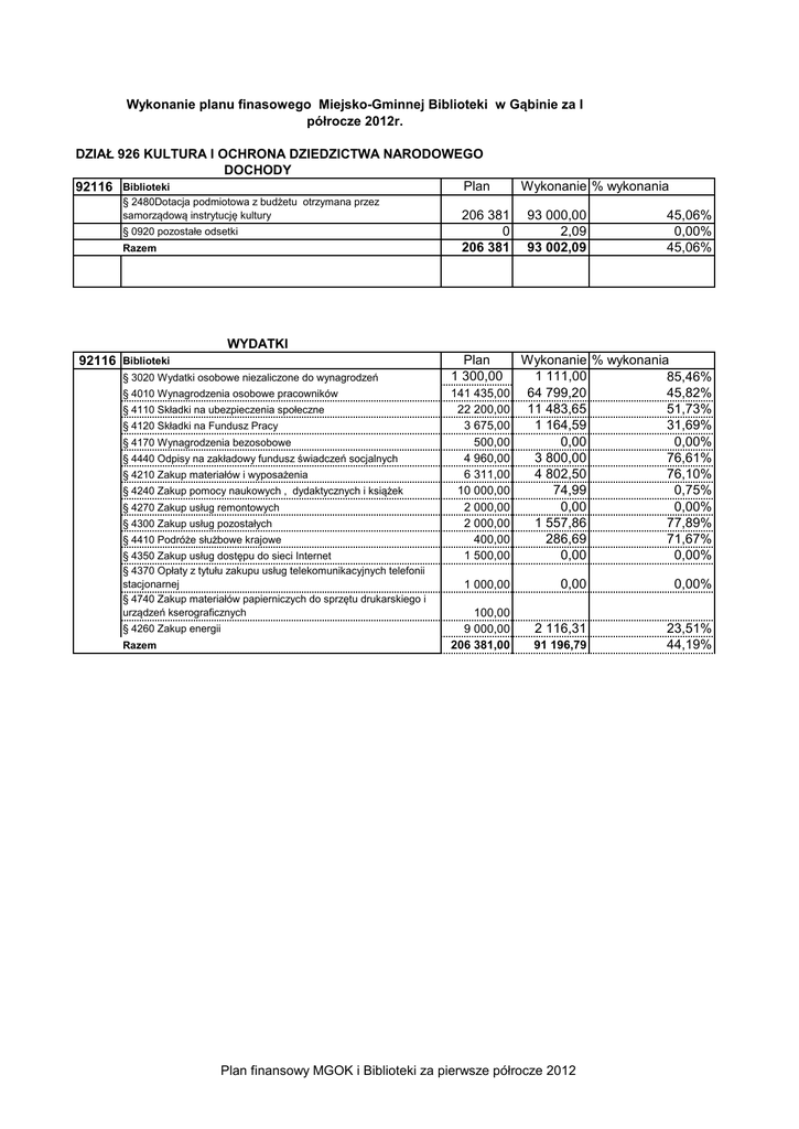 Wykonanie planu finasowego Miejsko-Gminnej Biblioteki w Gąbinie za I półrocze 2012r. DZIAŁ 926 KULTURA I OCHRONA DZIEDZICTWA NARODOWEGO DOCHODY Plan 92116 Biblioteki § 2480Dotacja podmiotowa z budżetu otrzymana przez samorządową instrytucję kultury § 0920 pozostałe odsetki Razem 206 381 0 206 381 Wykonanie % wykonania 93 000,00 2,09 93 002,09 45,06% 0,00% 45,06% WYDATKI 92116 Biblioteki § 3020 Wydatki osobowe niezaliczone do wynagrodzeń § 4010 Wynagrodzenia osobowe pracowników § 4110 Składki na ubezpieczenia społeczne § 4120 Składki na Fundusz Pracy § 4170 Wynagrodzenia bezosobowe § 4440 Odpisy na zakładowy fundusz świadczeń socjalnych § 4210 Zakup materiałów i wyposażenia § 4240 Zakup pomocy naukowych , dydaktycznych i książek § 4270 Zakup usług remontowych § 4300 Zakup usług pozostałych § 4410 Podróże służbowe krajowe § 4350 Zakup usług dostępu do sieci Internet § 4370 Opłaty z tytułu zakupu usług telekomunikacyjnych telefonii stacjonarnej § 4740 Zakup materiałów papierniczych do sprzętu drukarskiego i urządzeń kserograficznych § 4260 Zakup energii Razem Plan 1 300,00 141 435,00 22 200,00 3 675,00 500,00 4 960,00 6 311,00 10 000,00 2 000,00 2 000,00 400,00 1 500,00 Wykonanie % wykonania 1 111,00 85,46% 64 799,20 45,82% 11 483,65 51,73% 1 164,59 31,69% 0,00 0,00% 3 800,00 76,61% 4 802,50 76,10% 74,99 0,75% 0,00 0,00% 1 557,86 77,89% 286,69 71,67% 0,00 0,00% 1 000,00 0,00 0,00% 100,00 9 000,00 206 381,00 2 116,31 91 196,79 23,51% 44,19% Plan finansowy MGOK i Biblioteki za pierwsze półrocze 2012 Załącznik Nr 3 do Zarządzenia Burmistrza MiG /2012 z dnia 09 sierpnia 2012r. Nr 39 Informacja z wykonania planu finansowego Miejsko Gminnej Biblioteki Publicznej w Gąbinie i Filii Bibliotecznych w Topólnie , Dobrzykowie i w Borkach za pierwsze półrocze 2012r. Plan finansowy Miejsko Gminnej Biblioteki Publicznej w Gąbinie po wprowadzeniu zmian na dzień 30 czerwca 2012r. po stronie dochodów ustalony został na kwotę 206 381 zł zł Plan wydatków również po wprowadzeniu zmian na dzień 30 czerwca 2012r. ustalony został na kwotę 206 381 zł Dochody Plan dotacji Miejsko-Gminnej Biblioteki Publicznej w Gąbinie uchwalony przez Radę Miasta i Gminy Gąbin na kwotę 206 381zł wykonany został w kwocie 93 000,00 zł Od środków pieniężnych zgromadzonych na rachunku bankowym Biblioteki naliczono odsetki w kwocie 2,09 zł Ogółem planowane dochody w kwocie 206 381 zł , wykonane zostały w kwocie 93 002,09zł , tj.45,06%. Wydatki Plan wydatków Miejsko Gminnej Biblioteki Publicznej w Gąbinie ustalony na kwotę 381 zł wykonany został w kwocie 91 196,79zł .tj. 44,19% 206 Planowane na kwotę 1 300 zł wydatki w paragrafie dotyczącym wydatków osobowych niezaliczonych do wynagrodzeń w roku 2012 wykorzystane zostały na zakup i pranie odzieży ochronnej dla pracowników Biblioteki w kwocie: 1 111,00 zł tj. 85,46% Planowane na kwotę 141 435zł wydatki w paragrafie dotyczącym wynagrodzeń osobowych pracowników wykonane zostały w kwocie 64 799,20 zł tj. 45,82% Planowane na kwotę 500zł wydatki na wynagrodzenia bezosobowe wykonane zostały w kwocie: 0,00 zł tj. 0% Planowane na kwotę 22 200 zł składki na ubezpieczenia społeczne wykonane zostały w kwocie 11 483,65 zł tj. 51,73% Planowane na kwotę 3 675 zł wydatki na Fundusz Pracy wykonane zostały w kwocie 1 164,59 zł tj. 31,69% Planowane na kwotę 6 311 zł wydatki na zakup materiałów i wyposażenia wykonane zostały w kwocie 4 802,50 zł tj. 76,10% W/w wydatki przeznaczono na : zakup czasopism zakup środków czystości, ręczniki zakup węgla zakup materiałów biurowych zakup biurka, krzesła obrotowego, krzesła biurowego, kosza Zakup dla dzieci słodyczy, napojów itp.. na konkurs recytatorski , art. spoż. Na 65-lecie biblioteki Zakup nagród na konkursy, Razem: 842,61 zł 352,54 zł 820,00 zł 516,15 zł 957,50 zł 746,50 zł 567,20 zł 4 802,50 zł Plan wydatków w kwocie 9 000 zł na energię elektryczną i ogrzewanie wykonany został w kwocie: 2 116,31 tj. 23,51% Plan wydatków ustalony na kwotę 2 000 zł na zakup usług remontowych , wykonany został w kwocie: Plan wydatków ustalony na kwotę 2 000 zł na zakup usług, wykonany został w kwocie na następujące usługi: prowizja za prowadzenie rachunku zapłacona bankowi 439,27 zł usługa informatyczna 868,64 zł wypożyczenie kostiumów dla dzieci na 65-lecie Biblioteki 170,00 zł przegląd i konserwacja gaśnic , Razem: 0,00 zł tj. 0% 1 557,86 zł tj. 93,08% 79,95 zł 1 557,86 zł Plan wydatków opłaty za telefon stacjonarny ustalony na kwotę 1 000zł wykonany został w kwocie Plan wydatków ustalony na kwotę 400 zł z przeznaczeniem na podróże służbowe pracowników wykonany został w kwocie: Plan wydatków ustalony na kwotę 4960zł na zakładowy fundusz świadczeń socjalnych pracowników wykorzystany został w kwocie 0,00 zł tj. 0% 286,69 zł tj. 71,67% 3 800 zł tj. 76,61% Plan wydatków ustalony na kwotę 1 500zł na zakup usług dostępu do sieci Internet, wykonany został w kwocie 0 zł tj.0% Plan wydatków ustalony na kwotę 100zł na zakup materiałów papierniczych do sprzętu drukarskiego i urządzeń kserograficznych, wykonany został w kwocie 0 zł tj. 0% Plan wydatków ustalony na kwotę 10 000zł na zakup pomocy naukowych, dydaktycznych i książek, wykonany został w kwocie Razem wykonanie wydatków : 74,99 zł tj. 0,75% 91 196,79 tj. 44,19% MG Biblioteka Publiczna w Gąbinie na dzień 30.06.2012r. nie posiadała zobowiązań.Należności wynosiły 2 806,21zł - są to niewykorzystane środki dotacji na rachunku bankowym. Gąbin, sierpień 2012r. Wykonanie planu finansowego w Miejsko-Gminnym Ośrodku Kultury w Gąbinie za pierwsze półrocze 2012r. DZIAŁ 921 KULTURA I OCHRONA DZIEDZICTWA NARODOWEGO DOCHODY 92109 Domy i ośrodki kultury, świetlice i kluby § 2480 Dotacja podmiotowa z budżetu otrzymana przez samorządową instytucję kultury § 0920 pozostałe odsetki § 075