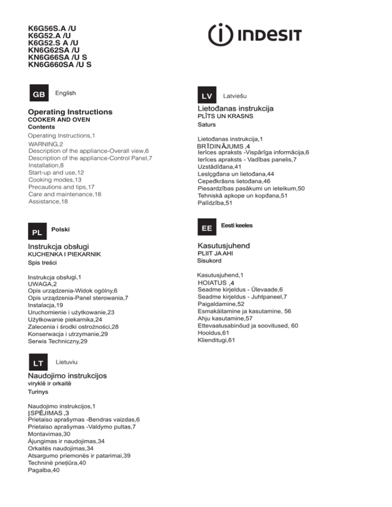K6G56S.A /U K6G52.A /U K6G52.S A /U KN6G62SA /U KN6G66SA /U S KN6G660SA /U S GB English Operating Instructions COOKER AND OVEN Contents Operating Instructions,1 W ARNING,2 Description of the appliance-Overall view,6 Description of the appliance-Control Panel,7 Installation,8 Start-up and use,12 Cooking modes,13 Precautions and tips,17 Care and maintenance,18 Assistance,18 PL Polski Instrukcja obsługi LV Latviešu Lietođanas instrukcija PLÎTS UN KRASNS Saturs Lietođanas instrukcija,1 ,4 BR ĪDIN Ī ĀJUMS Ā Ierîces apraksts -Vispârîga informâcija,6 Ierîces apraksts - Vadîbas panelis,7 Uzstâdîđana,41 Leslçgđana un lietođana,44 Cepeđkrâsns lietođana,46 Piesardzîbas pasâkumi un ieteikum,50 Tehniskâ apkope un kopđana,51 Palîdzîba,51 EE Eesti keeles Kasutusjuhend KUCHENKA I PIEKARNIK Spis treści PLIIT JA AHI Sisukord Instrukcja obsługi,1 UWAGA,2 Opis urządzenia-Widok ogólny,6 Opis urządzenia-Panel sterowania,7 Instalacja,19 Uruchomienie i użytkowanie,23 Użytkowanie piekarnika,24 Zalecenia i środki ostrożności,28 Konserwacja i utrzymanie,29 Serwis Techniczny,29 Kasutusjuhend,1 LT Lietuviu Naudojimo instrukcijos viryklë ir orkaitë Turinys Naudojimo instrukcijos,1 ,3 ĮĮSPĖJIMAS Ė Prietaiso aprašymas -Bendras vaizdas,6 Prietaiso aprašymas -Valdymo pultas,7 Montavimas,30 Ájungimas ir naudojimas,34 Orkaitës naudojimas,34 Atsargumo priemonës ir patarimai,39 Techninë prieţiűra,40 Pagalba,40 HOIATUS ,4 Seadme kirjeldus - Ülevaade,6 Seadme kirjeldus - Juhtpaneel,7 Paigaldamine,52 Esmakäitamine ja kasutamine, 56 Ahju kasutamine,57 Ettevaatusabinőud ja soovitused, 60 Hooldus,61 Klienditugi,61 GB WARNING WARNING: The appliance and its accessible parts become hot during use. Care should be taken to avoid touching heating elements. Children less than 8 years of age shall be kept away unless continuously supervised. This appliance can be used by children aged from 8 years and above and persons with reduced physical, sensory or mental capabilities or lack of experience and knowledge if they have been given supervision or instruction concerning use of the appliance in a safe way and understand the hazards involved. Children shall not play with the appliance. Cleaning and user maintenance shall not be made by children without supervision. WARNING: Unattended cooking on a hob with fat or oil can be dangerous and may result in fire. NEVER try to extinguish a fire with water, but switch off the appliance and then cover flame e.g. with a lid or a fire blanket. Do not use harsh abrasive cleaners or sharp metal scrapers to clean the oven door glass since they can scratch the surface, which may result in shattering of the glass. The internal surfaces of the compartment (where present) may become hot. Never use steam cleaners or pressure cleaners on the appliance. Remove any liquid from the lid before opening it. 2 Do not close the glass cover (if present) when the gas burners or electric hotplates are still hot. WARNING: Ensure that the appliance is switched off before replacing the lamp to avoid the possibility of electric shock. CAUTION: the use of inappropriate hob guards can cause accidents. PL UWAGA UWAGA: To urządzenie oraz jego dostępne części silnie się rozgrzewają podczas użytkowania. Należy uważać, aby nie dotknąć elementów grzejnych. Nie pozwalać, aby dzieci poniżej 8 roku życia zbliżały się do urządzenia, jeśli nie są pod stałym nadzorem dorosłych. Z niniejszego urządzenia mogą korzystać dzieci powyżej 8 roku życia i osoby o ograniczonych zdolnościach fizycznych, zmysłowych bądź umysłowych, jak również osoby nieposiadające doświadczenia lub znajomości urządzenia, jeśli znajdują się one pod nadzorem innych osób lub jeśli zostały pouczone na temat bezpiecznego sposobu użycia urządzenia oraz zdają sobie sprawę ze związanych z nim zagrożeń. Dzieci nie powinny bawić się urządzeniem. Prace związane z czyszczeniem i konserwacją nie mogą być wykonywane przez dzieci, jeśli nie są one nadzorowane. UWAGA: Pozostawienie bez nadzoru na kuchence tłuszczów i olejów może być niebezpieczne i może spowodować pożar. Nie należy NIGDY próbować ugasić płomieni/pożaru wodą; należy wyłączyć urządzenie i przykryć płomień np. pokrywką lub ognioodpornym kocem. Nie stosować środków ściernych ani ostrych łopatek metalowych do czyszczenia szklanych drzwiczek piekarnika, ponieważ mogłyby porysować powierzchnię i spowodować pęknięcie szyby. Vyresni nei 8 metų vaikai ir asmenys, turintys fizinių, jutimo ar psichinių sutrikimų arba nepakankamai žinių ar patirties, šiuo prietaisu gali naudotis tik tuo atveju, jei jie yra prižiūrimi arba instruktuojami, kaip saugiai naudoti prietaisą, taip pat supranta kylančias grėsmes. Vaikams turi būti draudžiama žaisti su prietaisu. Neprižiūrimi vaikai taip pat negali valyti prietaiso ar atlikti jo priežiūros darbų. Wewnętrzne powierzchnie szuflady (jeśli jest w danym modelu) mogą się nagrzewać. ĮSPĖJIMAS! Ant įjungtos viryklės palikti indai su riebalais ar aliejumi gali sukelti gaisrą. Nie stosować nigdy oczyszczaczy parowych lub ciśnieniowych do czyszczenia urządzenia. NIEKADA nebandykite liepsnos gesinti vandeniu – išjunkite prietaisą ir kuo nors uždenkite liepsną, pavyzdžiui, dangčiu arba priešgaisriniu apklotu. Usunąć ewentualne płyny na pokrywie przed jej otwarciem. Nie zamykać szklanej pokrywy (jeśli jest częścią wyposażenia), jeśli palniki gazowe lub płyta elektryczna są jeszcze rozgrzane. UWAGA: Przed wymianą żarówki, należy się upewnić, że urządzenie jest wyłączone, aby uniknąć ryzyka porażenia prądem. UWAGA: użycie niewłaściwych zabezpieczeń płyty może być przyczyną wypadków. LT ĮSPĖJIMAS ĮSPĖJIMAS! Naudojamo prietaiso paviršiai ir pasiekiamos dalys įkaista. Būkite atsargūs ir neprisilieskite prie įkaitusių prietaiso dalių. Jaunesni nei 8 metų vaikai gali bū