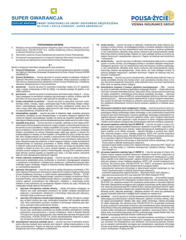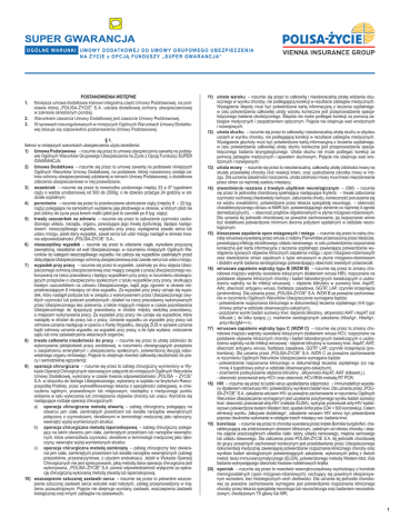 SUPER GWARANCJA O G Ó L N E WA R U N K I U M O W Y D O DAT KO W E J D O U M O W Y G R U P O W E G O U B E Z P I E C Z E N I A N A Ż YC I E z O P C JĄ F U N D U S Z Y „ S U P E R G WA R A N C JA” POSTANOWIENIA WSTĘPNE 1. Niniejsza umowa dodatkowa stanowi integralną część Umowy Podstawowej, na podstawie której „POLISA-ŻYCIE” S.A. udziela dodatkowej ochrony ubezpieczeniowej w zakresie określonym poniżej. 2. Warunkiem zawarcia Umowy Dodatkowej jest zawarcie Umowy Podstawowej. 3. W sprawach nieuregulowanych w niniejszych Ogólnych Warunkach Umowy Dodatkowej stosuje się odpowiednio postanowienia Umowy Podstawowej. § 1. Ilekroć w niniejszych warunkach ubezpieczenia użyto określenia: 1) Umowa Podstawowa – rozumie się przez to umowę ubezpieczenia zawartą na podstawie Ogólnych Warunków Grupowego Ubezpieczenia na Życie z Opcją Funduszy SUPER GWARANCJA; 2) Umowa Dodatkowa – rozumie się przez to umowę zawartą na podstawie niniejszych Ogólnych Warunków Umowy Dodatkowej, na podstawie, której rozszerzony zostaje zakres ochrony ubezpieczeniowej udzielanej w ramach Umowy Podstawowej, o dodatkowe zdarzenia ubezpieczeniowe w niej przewidziane; 3) wcześniak – rozumie się przez to noworodka urodzonego między 23 a 37 tygodniem ciąży o wadze urodzeniowej od 500 do 2500g, o ile dziecko przeżyje 24 godziny w oddziale szpitalnym; 4) poronienie – rozumie się przez to przedwczesne ukończenie ciąży (między 8 – 22 tyg. ciąży) polegające na samoistnym wydaleniu jaja płodowego w okresie, w którym płód nie jest zdolny do życia poza łonem matki (płód jest to zarodek po 8 tyg. ciąży); 5) trwały uszczerbek na zdrowiu – rozumie się przez to zaburzenie czynności uszkodzonego układu, narządu, organu, powodujące jego trwałą dysfunkcję, będące następstwem: nieszczęśliwego wypadku, wypadku przy pracy, wystąpienia zawału serca lub udaru mózgu, jeżeli dany wypadek, zawał serca lub udar mózgu nastąpił w okresie trwania odpowiedzialności „POLISA-ŻYCIE” S.A.; 6) nieszczęśliwy wypadek – rozumie się przez to zdarzenie nagłe, wywołane przyczyną zewnętrzną, niezależne od woli Ubezpieczonego. w rozumieniu niniejszych Ogólnych Warunków do kategorii nieszczęśliwego wypadku nie zalicza się wypadków zaistniałych przed datą objęcia Ubezpieczonego ochroną ubezpieczeniową oraz zawału serca lub udaru mózgu; 7) wypadek przy pracy – rozumie się przez to wypadek, zaistniały po dniu objęcia Ubezpieczonego ochroną ubezpieczeniową oraz mający związek z pracą Ubezpieczonego wykonywaną na rzecz pracodawcy i będący wypadkiem przy pracy w rozumieniu obowiązujących przepisów o ubezpieczeniu społecznym z tytułu wypadków przy pracy, skutkujący trwałym uszczerbkiem na zdrowiu Ubezpieczonego, bądź jego zgonem w okresie nieprzekraczającym 6 miesięcy od dnia wypadku. Za wypadek przy pracy uznaje się wypadek, który nastąpił podczas lub w związku z wykonywaniem przez Ubezpieczonego zwykłych czynności lub poleceń przełożonych, działań na rzecz pracodawcy wykonywanych przez Ubezpieczonego bez polecenia, a także mających miejsce w czasie pozostawania Ubezpieczonego do dyspozycji pracodawcy w drodze między siedzibą pracodawcy, a miejscem wykonywania pracy. Za wypadek przy pracy nie uznaje się wypadków, które nastąpiły w drodze do pracy lub z pracy. Uznanie wypadku za wypadek przy pracy lub odmowa uznania następuje w oparciu o Kartę Wypadku, decyzję ZUS w sprawie uznania bądź odmowy uznania wypadku za wypadek przy pracy, o ile była wydana, orzeczenie sądu lub inne zaświadczenia właściwych organów; 8) trwała całkowita niezdolność do pracy – rozumie się przez to utratę zdolności do wykonywania jakiejkolwiek pracy zarobkowej, w rozumieniu obowiązujących przepisów o zaopatrzeniu emerytalnym i ubezpieczeniu społecznym, potwierdzoną decyzją odpowiedniego organu rentowego. Pojęcie to obejmuje również całkowitą niezdolność do pracy i samodzielnej egzystencji; 9) operacja chirurgiczna – rozumie się przez to zabieg chirurgiczny wymieniony w Wykazie Operacji Chirurgicznych stanowiącym załącznik do niniejszych Ogólnych Warunków Umowy Dodatkowej, wykonany w czasie trwania odpowiedzialności „POLISA – ŻYCIE” S.A. w stosunku do danego Ubezpieczonego, wykonany w szpitalu na terytorium Rzeczpospolitej Polskiej, przez wykwalifikowanego lekarza o specjalności zabiegowej, w znieczuleniu ogólnym, przewodowym lub miejscowym, niezbędny z medycznego punktu widzenia w celu wyleczenia lub zmniejszenia objawów choroby lub urazu; Wyróżnia się następujące rodzaje operacji chirurgicznych: a) operacja chirurgiczna metodą otwartą – zabieg chirurgiczny polegający na otwarciu jam ciała, zamkniętych przestrzeni lub światła narządów wewnętrznych połączony z czynnościami, określonymi w terminologii medycznej jako rękoczyny, wewnątrz wyżej wymienionych struktur, b) operacja chirurgiczna metodą laparoskopową – zabieg chirurgiczny polegający na takim otwarciu jam ciała, zamkniętych przestrzeni lub narządów wewnętrznych, które uniemożliwia czynności, określone w terminologii medycznej jako rękoczyny, wewnątrz wyżej wymienionych struktur, c) operacja chirurgiczna metodą zamkniętą – zabieg chirurgiczny bez otwierania jam ciała, zamkniętych przestrzeni lub światła narządów wewnętrznych (zabiegi przezskórne, przeznaczyniowe, z użyciem endoskopu). Jeżeli w Wykazie Operacji Chirurgicznych nie jest sprecyzowane, jaką metodą dana operacja chirurgiczna jest wykonywana, „POLISA–ŻYCIE” S.A. ponosi odpowiedzialność wyłącznie za operację chirurgiczną wykonaną metodą otwartą lub laparoskopową; 10) wszczepienie sztucznej zastawki serca – rozumie się przez to pierwotne wszczepienie sztucznej zastawki serca wskutek wad nabytych, zabieg przeprowadzony w krążeniu pozaustrojowym. Pojęcie nie obejmuje wymiany zastawki, wszczepienia 
