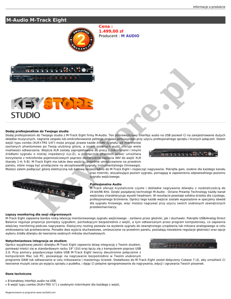 Informacje o produkcie M-Audio M-Track Eight Cena : 1.499,00 zł or e. pl Producent : M AUDIO K ey St Dodaj profesjonalizm do Twojego studia Dodaj profesjonalizm do Twojego studia z M-Track Eight firmy M-Audio. Ten ośmiowejściowy interfejs audio na USB pozwoli Ci na zarejestrowanie dużych składów muzycznych, nagranie zespołu lub omikrofonowanie pełnego zestawu perkusyjnego przy użyciu profesjonalnego sprzętu i licznych połączeń. Osiem wejść typu combo (XLR+TRS 1/4") może przyjąć prawie każde źródło sygnału, od mikrofonów zasilanych phantomowo po Twoją ulubioną gitarę, a osiem osobnych wyjść oferuje wiele możliwości odtwarzania. Wejścia XLR zostały zaprojektowane do pracy z mikrofonami i innymi źródłami sygnału o niskiej impedancji (Lo-Z), a przełącznik phantom power umożliwia korzystanie z mikrofonów pojemnościowych poprzez dostarczenie napięcia 48V do wejść XLR (kanały 1-4; 5-8). M-Track Eight ma także dwa wejścia, dogodnie umiejscowione na przednim panelu, które mogą być przełączone na akceptowanie sygnału instrumentalnego (liniowego). Możesz zatem podłączyć gitarę elektryczną lub basową bezpośrednio do M-Track Eight i rozpocząć nagrywanie. Pokrętła gain, osobne dla każdego kanału oraz mierniki, wizualizujące poziom sygnału, pomagają w zapewnieniu odpowiedniego poziomu sygnału wejściowego. Profesjonalne Audio M-Track oferuje krystalicznie czyste i dokładne nagrywanie dźwięku z rozdzielczością do 24-bit/96 KHz. Dzięki pożądanej technologii M-Audio - Octane Preamp Technology każdy kanał wejściowy charakteryzuje wysoki headroom. W rezultacie powstaje solidna ścieżka dla czystego, profesjonalnego brzmienia. Oprócz tego każde wejście zostało wyposażone w specjalny obwód dla sygnału liniowego, więc możesz nagrywać przy użyciu swoich ulubionych zewnętrznych przedwzmacniaczy. Lepszy monitoring dla sesji nagraniowych M-Track Eight zapewnia bardzo niską latencję monitorowanego sygnału wejściowego - zarówno przez głośniki, jak i słuchawki. Pokrętło USB/Analog Direct Balance reguluje proporcje pomiędzy sygnałem, pochodzącym bezpośrednio z wejść, a tym odtwarzanym przez program komputerowy, co zapewnia właściwy monitoring podczas nagrywania. Elastyczny routing pozwala na wysłanie sygnału do zewnętrznego urządzenia lub miksera analogowego w celu zmiksowania lub przetworzenia. Ponadto dwa wyjścia słuchawkowe, umieszczone na przednim panelu, posiadają niezależne regulacje głośności oraz opcje wyboru źródła dźwięku do tworzenia osobnych miksów słuchawkowych. Natychmiastowa integracja ze studiem Oprócz wyjątkowej jakości dźwięku M-Track Eight zapewnia łatwą integrację z Twoim studiem, ponieważ mieści się w standardowym racku 19" (1U) oraz łączy się z komputerem poprzez USB 2.0. Przy pomocy pojedynczego kabla USB M-Track Eight tworzy dwustronne połączenie z komputerem Mac lub PC, pozwalając na nagrywanie bezpośrednio w Twoim ulubionym programie DAW lub odtwarzanie w celu miksowania i masteringu ścieżek. Dodatkowo do M-Track Eight został dołączony Cubase 7 LE, aby umożliwić Ci tworzenie muzyki zaraz po wyjęciu sprzętu z pudełka, i dając Ci potężne oprogramowanie do nagrywania, edycji i zgrywania Twoich piosenek. Dane techniczne ● ● 8-kanałowy interfejs audio na USB, 8 wejść typu combo (XLR+TRS ¼”) z osobnymi miernikami dla każdego z wejść, Wygenerowano w programie www.oscGold.com ● ● ● ● ● ● ● ● ● ● Krystalicznie czyste i dokładne nagrywanie dźwięku z rozdzielczością do 24-bit/96 KHz, Wejścia o dużym headroomie z Octane Preamp Technology, Indywidualny obwód wejścia liniowego, zapewniający czyste, profesjonalne nagrania, 2 wejścia instrumentalne, umieszczone na przednim panelu, ułatwiające dostęp, Włącznik zasilania phantom (kanały 1-4;5-8) dla mikrofonów pojemnościowych, Podwójne wyjście słuchawkowe z możliwością wyboru źródła dźwięku do osobnych miksów i monitorowania, 8 symetrycznych wyjść TRS ¼” i osobne wyjście Control Room, Monitorowanie sygnalu bez latencji z USB/Analog Direct Balance, Standardowy rozmiar rack 19”, wys. 1U, wytrzymała metalowa konstrukcja, Zawiera Cubase 7LE, dzięki czemu można tworzyć muzykę od razu po wyjęciu urządzenia z pudełka. K ey St or e. pl Zawartość opakowania • M-Track Eight • Kabel USB • Zasilacz • Karta do pobrania oprogramowania • Podręcznik użytkownika • Instrukcja, dotycząca bezpieczeństwa i zasad gwarancji