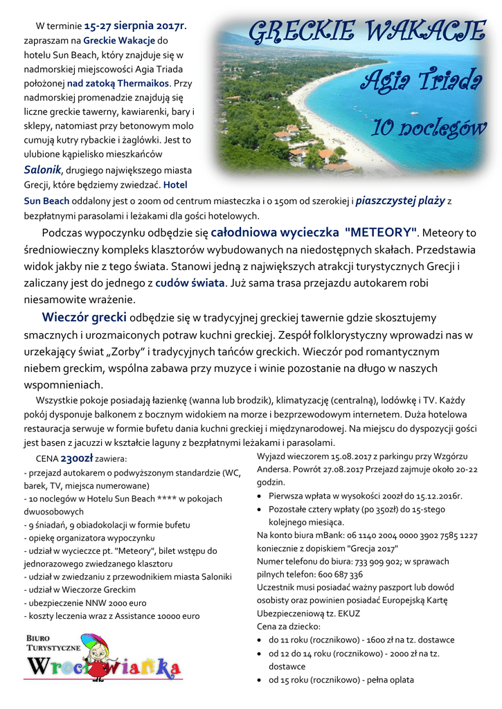 W terminie 15-27 sierpnia 2017r. zapraszam na Greckie Wakacje do hotelu Sun Beach, który znajduje się w nadmorskiej miejscowości Agia Triada położonej nad zatoką Thermaikos. Przy nadmorskiej promenadzie znajdują się liczne greckie tawerny, kawiarenki, bary i sklepy, natomiast przy betonowym molo cumują kutry rybackie i żaglówki. Jest to ulubione kąpielisko mieszkańców GRECKIE WAKACJE Agia Triada 10 noclegów Salonik, drugiego największego miasta Grecji, które będziemy zwiedzać. Hotel Sun Beach oddalony jest o 200m od centrum miasteczka i o 150m od szerokiej i piaszczystej plaży z bezpłatnymi parasolami i leżakami dla gości hotelowych. Podczas wypoczynku odbędzie się całodniowa wycieczka "METEORY". Meteory to średniowieczny kompleks klasztorów wybudowanych na niedostępnych skałach. Przedstawia widok jakby nie z tego świata. Stanowi jedną z największych atrakcji turystycznych Grecji i zaliczany jest do jednego z cudów świata. Już sama trasa przejazdu autokarem robi niesamowite wrażenie. Wieczór grecki odbędzie się w tradycyjnej greckiej tawernie gdzie skosztujemy smacznych i urozmaiconych potraw kuchni greckiej. Zespół folklorystyczny wprowadzi nas w urzekający świat „Zorby” i tradycyjnych tańców greckich. Wieczór pod romantycznym niebem greckim, wspólna zabawa przy muzyce i winie pozostanie na długo w naszych wspomnieniach. Wszystkie pokoje posiadają łazienkę (wanna lub brodzik), klimatyzację (centralną), lodówkę i TV. Każdy pokój dysponuje balkonem z bocznym widokiem na morze i bezprzewodowym internetem. Duża hotelowa restauracja serwuje w formie bufetu dania kuchni greckiej i międzynarodowej. Na miejscu do dyspozycji gości jest basen z jacuzzi w kształcie laguny z bezpłatnymi leżakami i parasolami. CENA 2300zł zawiera: - przejazd autokarem o podwyższonym standardzie (WC, barek, TV, miejsca numerowane) - 10 noclegów w Hotelu Sun Beach **** w pokojach dwuosobowych - 9 śniadań, 9 obiadokolacji w formie bufetu - opiekę organizatora wypoczynku - udział w wycieczce pt. "Meteory", bilet wstępu do jednorazowego zwiedzanego klasztoru - udział w zwiedzaniu z przewodnikiem miasta Saloniki - udział w Wieczorze Greckim - ubezpieczenie NNW 2000 euro - koszty leczenia wraz z Assistance 10000 euro Wyjazd wieczorem 15.08.2017 z parkingu przy Wzgórzu Andersa. Powrót 27.08.2017 Przejazd zajmuje około 20-22 godzin. Pierwsza wpłata w wysokości 200zł do 15.12.2016r. Pozostałe cztery wpłaty (po 350zł) do 15-stego kolejnego miesiąca. Na konto biura mBank: 06 1140 2004 0000 3902 7585 1227 koniecznie z dopiskiem "Grecja 2017" Numer telefonu do biura: 733 909 902; w sprawach pilnych telefon: 600 687 336 Uczestnik musi posiadać ważny paszport lub dowód osobisty oraz powinien posiadać Europejską Kartę Ubezpieczeniową tz. EKUZ Cena za dziecko: do 11 roku (rocznikowo) - 1600 zł na tz. dostawce od 12 do 14 roku (rocznikowo) - 2000 zł na tz. dostawce od 15 roku (rocznikowo) - pełna oplata