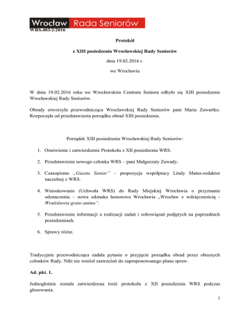 WRS.403/2/2016 Protokół z XIII posiedzenia Wrocławskiej Rady Seniorów dnia 19.02.2016 r. we Wrocławiu W dniu 19.02.2016 roku we Wrocławskim Centrum Seniora odbyło się XIII posiedzenie Wrocławskiej Rady Seniorów. Obrady otworzyła przewodnicząca Wrocławskiej Rady Seniorów pani Maria Zawartko. Rozpoczęła od przedstawienia porządku obrad XIII posiedzenia. Porządek XIII posiedzenia Wrocławskiej Rady Seniorów: 1. Omówienie i zatwierdzenie Protokołu z XII posiedzenia WRS. 2. Przedstawienie nowego członka WRS – pani Małgorzaty Zawady. 3. Czasopismo „Gazeta Senior” – propozycja współpracy Lindy Matus-redaktor naczelnej z WRS. 4. Wnioskowanie (Uchwała WRS) do Rady Miejskiej Wrocławia o przyznanie odznaczenia – nowa odznaka honorowa Wrocławia „Wrocław z wdzięcznością Wratislawia grato animo”. 5. Przedstawienie informacji o realizacji zadań i zobowiązań podjętych na poprzednich posiedzeniach. 6. Sprawy różne. Tradycyjnie przewodnicząca zadała pytanie o przyjęcie porządku obrad przez obecnych członków Rady. Nikt nie wniósł zastrzeżeń do zaproponowanego planu spraw. Ad. pkt. 1. Jednogłośnie została zatwierdzona treść protokołu z XII posiedzenia WRS podczas głosowania. 1 Ad. pkt. 2. Serdecznie została przywitana nowa członkini WRS – pani dr Małgorzata Zawada. Jest radną Rady Miejskiej Wrocławia i przyjęła zaproszenie do współpracy. Dalej głos zabrała pani Zawada informując, że ze środowiskiem senioralnym ma do czynienia od kilku lat. Przede wszystkim jako instruktor Nodic walking. Zaprosiła zgromadzonych do uczestnictwa w tych zajęciach. Ponadto angażuje się w sprawy osób starszych w sposób towarzysko-kulturalny. Określiła zakres swoich kompetencji w Radzie - doradztwo w zakresie kultury, komunikacji społecznej, rekreacji, edukacji samorządowej. Przewodnicząca następnie stwierdziła, że cieszy się, że Rada jest znów w komplecie. Ad. pkt. 3. Do zabrania głosu została poproszona pani Linda Matus – redaktor naczelna czasopisma „Gazeta Senior”. Gość rozszerzył informacje na temat swojej aktywności dotyczącej pracy na rzecz osób starszych wskazując jeszcze na portal internetowy www.gazetasenior.pl Podziękowała za możliwość udziału w tym posiedzeniu i kolejnych, bo tak członkowie Rady zdecydowali na posiedzeniu w styczniu. Przedstawiła dwoje członków zespołu Gazety także obecnych: Monikę Uszycką, która zajmuje się wieloma tematami, a ostatnio programem „Otwarcie 50 +”, oraz Jerzego Dudzika, fotoreportera, współpracuje z Gazetą już długo i owocnie, jest seniorem. Pan Dudzik będzie przychodził na te spotkania i wykonywał dokumentację fotograficzną. Wszystkich, dalej pani L. Matus, zaprosiła do odwiedzenia redakcji. Zaznaczyła, że nie zawsze będzie mogła osobiście uczestniczyć więc ktoś z tych dwojga osób ją będzie zastępował. Wszystkich, dalej pani L. Matus, zaprosiła do odwiedzenia redakcji. Ogólnie o czasopiśmie powiedziała, że Gazeta wydawana jest regularnie od 2011 r. i kolportowana w wersjach: Gazeta Senior Kraj, GS Wrocław/Dolny Śląsk i GS Poznań/Wielkopolska. Rozszerzenie działalności było następstwem wielkiego zapotrzebowania ze strony seniorów wydawnictwem dedykowanym dla nich. W tej chwili „Gazeta Senior” trafia do ponad 440 organizacji senioralnych (30 000 egz.). W tym dociera do ok. 200 uniwersytetów trzeciego wieku w całym kraju. Coraz większym zainteresowaniem cieszy się też portal internetowy. Pani Matus zaznaczyła, że jest tu po to żeby zaprezentować te media, ale nie tylko. Chce oddać te łamy członkom WRS. Poinformowała, że warto byłoby informować wrocławskich seniorów o ważnych sprawach, które tu na posiedzeniach są poruszane. Wyraziła nadzieję, że być może dzięki współpracy, 2 czyli zamieszczaniu tekstów o ważnych sprawach dotyczących ludzi starszych, uda się przynajmniej niektóre załatwić. Następnie odesłała członków Rady do materiałów przygotowanych dla wszystkich w pakietach, które wszyscy otrzymali. Oczywiście Gazeta jest znana prawdopodobnie wszystkim, ale w materiałach można znaleźć trochę więcej informacji. W pakiecie są 3 ostatnie numery: wydanie wrocławskie, krajowe i poznańskie. Tam można zobaczyć jaki jest klimat czasopisma, jakie tematy są poruszane. Jak podchodzimy my, w redakcji, do percepcji osób starszych. Jest też dla Państwa przygotowana książeczka „Niezbędnik wrocławskiego seniora”, wydany w zeszłym roku. Dalej po krótce wypunktowała czego oczekuje od Wrocławskiej Rady Seniorów: 1) Podsuwania tematów, o których warto napisać, bo członkowie Rady pochodzą z różnych środowisk, 2) Sugerowania ciekawych osób, które mogłyby zaprezentować się, albo problemów odnoszący się do osób późnej dorosłości, 3) W piśmie, które przekazała, wraz ze swoją wizytówką, pokazała spektrum spraw możliwych do omawiania na łamach Gazety, 4) Zaangażowania członków WRS, bo dzięki temu wrocławscy seniorzy będą lepiej poinformowani, czasem docenieni. W następnej kolejności, jak zaznaczyła już wcześniej, chce powiedzieć o „najmłodszym dziecku” czyli programie „Otwarci 50+”. Tytułem wprowadzenia do tego programu pani Linda Matus powiedziała o specyfice pracy w Redakcji. Dziennikarze pracują z dwiema grupami odbiorców: 1) z jednej strony Gazeta jest dla seniorów, 2) z drugiej – pokazuje się biznes, organizacje różne, w tym, samorządowe spojrzenie, rządowe „posunięcia” w polityce senioralnej (dopowiedziała, że tylko dzięki tym organizacjom Gazeta może się ukazywać). Jednocześnie dalej przekonywała zgromadzonych o tytanicznej pracy jaką zespół ludzi w „Seniorze” wykonał od 2011 roku. To jest edukacyjny trud, w szczególności właśnie związany z dotarciem do środowisk biznesu, organizacji pozarządowych. Oczywiście równolegle, drugą grupą są seniorzy, do których chce Ga