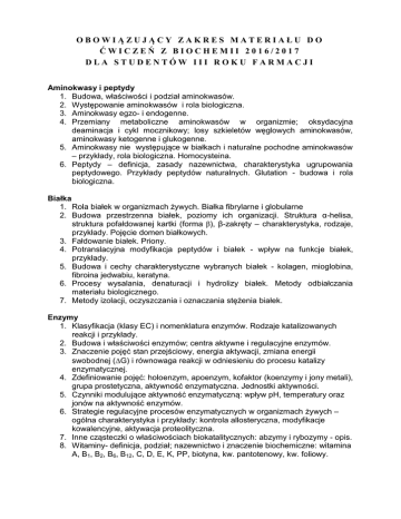 OBOWIĄZUJĄCY ZAKRES MATERIAŁU DO ĆWICZEŃ Z BIOCHEMII 2016/2017 DLA STUDENTÓW III ROKU FARMACJI Aminokwasy i peptydy 1. Budowa, właściwości i podział aminokwasów. 2. Występowanie aminokwasów i rola biologiczna. 3. Aminokwasy egzo- i endogenne. 4. Przemiany metaboliczne aminokwasów w organizmie; oksydacyjna deaminacja i cykl mocznikowy; losy szkieletów węglowych aminokwasów, aminokwasy ketogenne i glukogenne. 5. Aminokwasy nie występujące w białkach i naturalne pochodne aminokwasów – przykłady, rola biologiczna. Homocysteina. 6. Peptydy – definicja, zasady nazewnictwa, charakterystyka ugrupowania peptydowego. Przykłady peptydów naturalnych. Glutation - budowa i rola biologiczna. Białka 1. Rola białek w organizmach żywych. Białka fibrylarne i globularne 2. Budowa przestrzenna białek, poziomy ich organizacji. Struktura α-helisa, struktura pofałdowanej kartki (forma β), β-zakręty – charakterystyka, rodzaje, przykłady. Pojęcie domen białkowych. 3. Fałdowanie białek. Priony. 4. Potranslacyjna modyfikacja peptydów i białek - wpływ na funkcje białek, przykłady. 5. Budowa i cechy charakterystyczne wybranych białek - kolagen, mioglobina, fibroina jedwabiu, keratyna. 6. Procesy wysalania, denaturacji i hydrolizy białek. Metody odbiałczania materiału biologicznego. 7. Metody izolacji, oczyszczania i oznaczania stężenia białek. Enzymy 1. Klasyfikacja (klasy EC) i nomenklatura enzymów. Rodzaje katalizowanych reakcji i przykłady. 2. Budowa i właściwości enzymów; centra aktywne i regulacyjne enzymów. 3. Znaczenie pojęć stan przejściowy, energia aktywacji, zmiana energii swobodnej (G) i równowaga reakcji w odniesieniu do procesu katalizy enzymatycznej. 4. Zdefiniowanie pojęć: holoenzym, apoenzym, kofaktor (koenzymy i jony metali), grupa prostetyczna, aktywność enzymatyczna. Jednostki aktywności. 5. Czynniki modulujące aktywność enzymatyczną: wpływ pH, temperatury oraz jonów na aktywność enzymów. 6. Strategie regulacyjne procesów enzymatycznych w organizmach żywych – ogólna charakterystyka i przykłady: kontrola allosteryczna, modyfikacje kowalencyjne, aktywacja proteolityczna. 7. Inne cząsteczki o właściwościach biokatalitycznych: abzymy i rybozymy - opis. 8. Witaminy- definicja, podział; nazewnictwo i znaczenie biochemiczne: witamina A, B1, B2, B6, B12, C, D, E, K, PP, biotyna, kw. pantotenowy, kw. foliowy. Kinetyka reakcji enzymatycznej 1. Model kinetyki Michaelisa-Menten. Pojęcie stałej Michaelisa (KM) i szybkości maksymalnej (Vmax). 2. Zjawisko inhibicji enzymów – rodzaje inhibitorów i ich wpływ na parametry kinetyczne reakcji enzymatycznej; znaczenie inhibitorów enzymatycznych w farmakoterapii. 3. Równanie Michaelisa-Menten oraz Lineweavera-Burka oraz ich wykresy – znaczenie w wyznaczeniu podstawowych parametrów kinetycznych reakcji enzymatycznej oraz w identyfikacji typu inhibicji enzymatycznej. 4. Enzymy allosteryczne – charakterystyka. Węglowodany 1. Budowa i podział węglowodanów oraz ich rola biologiczna. Charakterystyka wiązania glikozydowe. 2. Cukry proste w procesach metabolicznych: glikoliza, glukoneogeneza, glikogenoliza, glikogenogeneza, szlak pentozo fosforanowy i szlak kwasów uronowych - rola i kluczowe metabolity. 3. Polisacharydy – homoglikany, heteroglikany. Funkcje w organizmach żywych, budowa i występowanie (dekstran, skrobia, celuloza, glikogen). Glikozaminoglikany i ich rola. 4. Przykłady zastosowań farmakologicznych węglowodanów i pochodnych (np. siarczan glukozoaminy, siarczan chondroityny, heparyna kwas hialuronowy, kwas alginowy). Kwasy nukleinowe 1. DNA i RNA – struktura i właściwości fizykochemiczne. Temp. topnienia DNA. 2. DNA jądrowy i mitochondrialny. Topologia (organizacja) DNA jądrowego. Topoizomerazy. Inhibitory gyraz bakteryjnych w farmakoterapii. 3. Metabolizm (synteza i degradacja) nukleotydów – kluczowe metabolity i szlaki przemian. Różnice między metabolizmem puryn i pirymidyn i ich konsekwencje. 4. RNA – rodzaje i funkcje biologiczne. Modyfikacje potranskrypcyjne/Dojrzewanie RNA. 5. Podstawy replikacji i naprawy DNA oraz transkrypcji. 6. Charakterystyka kodu genetycznego 7. Rodzaje mutacji. Czynniki mutagenne. Test Amesa. Lipidy 1. Podział, budowa chemiczna i funkcje biologiczne lipidów prostych i złożonych. 2. Właściwości fizykochemiczne lipidów. Zachowanie tłuszczy hydrofobowych i amfifilowych w roztworach wodnych. Micele i liposomy. 3. Budowa chemiczna kwasów jedno- i wielonienasyconych i możliwości ich syntezy w organizmie. Liczba Ω. Niezbędne nienasycone kwasy tłuszczowe. 4. Przemiany metaboliczne lipidów: synteza kwasów tłuszczowych (substraty, lokalizacja wewnątrzkomórkowa, główne etapy, kompleks syntazy KT), oksydacja (lokalizacja wewnątrzkomórkowa, główne etapy, rola karnityny). 5. Synteza izoprenu i poliizoprenoidów. Koenzym Q. Kluczowe etapy syntezy cholesterolu. Cholesterol jako substrat do syntezy kwasów żółciowych i hormonów sterydowych. 6. Interpretacja norm laboratoryjnych dla stężenia triacylogliceroli i cholesterolu (całkowitego, HDL, LDL) w krwi. RFT 1. Budowa i funkcja błon komórkowych. 2. Powstawanie, rodzaje i działanie biologiczne reaktywnych form tlenu. 3. System obrony antyoksydacyjnej ustroju. Antyoksydanty nieenzymatyczne i enzymatyczne. 4. Peroksydacja lipidów błonowych, białek i kwasów nukleinowych (mechanizm i skutki). 5. Erytrocyty – powiązanie przemian glukozy z mechanizmami obrony przeciw RFT. 6. Terapia fotodynamiczna (definicja i zastosowanie). Frakcjonowanie elementów subkomórkowych 1. Chromatografia powinowactwa – zasada metody, zastosowanie 2. S-transferazy glutationowe (GST) – lokalizacja w komórce i narządach, rola i izoenzymy, reakcje specyficzne. Enzymy metabolizujące ksenobiotyki – I i II faza 1. Charakterystyka reakcji I i II fazy metabolizmu. 2. Cytochromy CYP450 – ich występowanie, rola i reakcje metaboliczne, które przeprowad