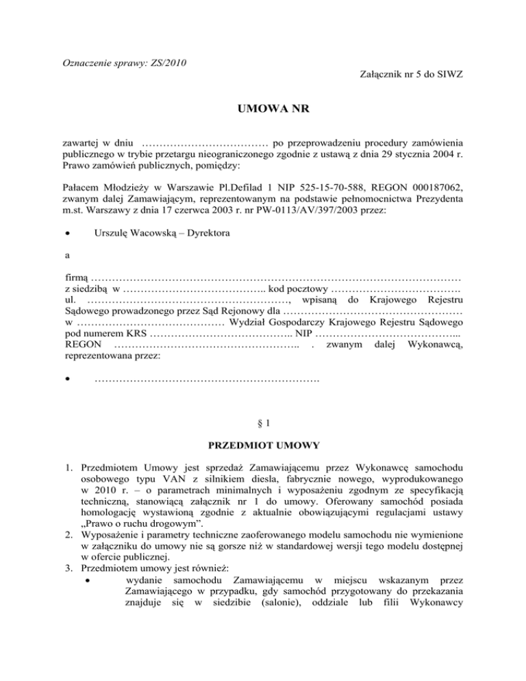Oznaczenie sprawy: ZS/2010 Załącznik nr 5 do SIWZ UMOWA NR zawartej w dniu ……………………………… po przeprowadzeniu procedury zamówienia publicznego w trybie przetargu nieograniczonego zgodnie z ustawą z dnia 29 stycznia 2004 r. Prawo zamówień publicznych, pomiędzy: Pałacem Młodzieży w Warszawie Pl.Defilad 1 NIP 525-15-70-588, REGON 000187062, zwanym dalej Zamawiającym, reprezentowanym na podstawie pełnomocnictwa Prezydenta m.st. Warszawy z dnia 17 czerwca 2003 r. nr PW-0113/AV/397/2003 przez: • Urszulę Wacowską – Dyrektora a firmą …………………………………………………………………………………………… z siedzibą w ………………………………….. kod pocztowy ………………………………. ul. …………………………………………………, wpisaną do Krajowego Rejestru Sądowego prowadzonego przez Sąd Rejonowy dla …………………………………………… w …………………………………… Wydział Gospodarczy Krajowego Rejestru Sądowego pod numerem KRS ………………………………….. NIP …………………………………... REGON …………………………………………….. . zwanym dalej Wykonawcą, reprezentowana przez: • ………………………………………………………. §1 PRZEDMIOT UMOWY 1. Przedmiotem Umowy jest sprzedaż Zamawiającemu przez Wykonawcę samochodu osobowego typu VAN z silnikiem diesla, fabrycznie nowego, wyprodukowanego w 2010 r. – o parametrach minimalnych i wyposażeniu zgodnym ze specyfikacją techniczną, stanowiącą załącznik nr 1 do umowy. Oferowany samochód posiada homologację wystawioną zgodnie z aktualnie obowiązującymi regulacjami ustawy „Prawo o ruchu drogowym”. 2. Wyposażenie i parametry techniczne zaoferowanego modelu samochodu nie wymienione w załączniku do umowy nie są gorsze niż w standardowej wersji tego modelu dostępnej w ofercie publicznej. 3. Przedmiotem umowy jest również: • wydanie samochodu Zamawiającemu w miejscu wskazanym przez Zamawiającego w przypadku, gdy samochód przygotowany do przekazania znajduje się w siedzibie (salonie), oddziale lub filii Wykonawcy • • • zlokalizowanej poza granicami administracyjnymi m.st. Warszawy, w miejscowości nie przylegającej bezpośrednio do tych granic, objęcie samochodu serwisem gwarancyjnym świadczonym przez autoryzowaną stacje obsługi na terenie m.st. Warszawy. wykonanie przeglądu „zerowego” przed wydaniem samochodu Zamawiającemu. zatankowanie samochodu co najmniej 5 litrami paliwa. 4. W trakcie realizacji umowy dopuszczalne jest dostarczenie samochodu ulepszonego w stosunku do zaoferowanego, ale w cenie jednostkowej nie wyższej niż określonej w ofercie to jest netto ………………………………………………….. (słownie: ……………………………………………………………………………………..…..) zł. §2 WARTOŚĆ UMOWY Wartość przedmiotu umowy wyspecyfikowanego w załączniku nr 1 wynosi w PLN netto: ……………………. zł (słownie: ……………………………………………………………) zł, brutto w PLN ……………………………….. zł (słownie: ………………………………... …………………………………………………………………………………………...…..) zł §3 TERMIN REALIZACJI UMOWY I MIEJSCE DOSTAWY 1. 2. 3. 4. 5. Strony określają termin realizacji przedmiotu umowy od daty podpisania do dnia 10 grudnia 2010 roku . Nie są przewidywane dostawy częściowe. Za termin realizacji umowy rozumie się pisemną informację o gotowości Wykonawcy do postawienia do dyspozycji Zamawiającego nowego i wolnego od wad prawnych oraz fizycznych samochodu wraz z fakturą VAT i dokumentami wymaganymi do rejestracji. Pisemna informacja, o której mowa w powyższym zdaniu wraz z fakturą VAT stanowi podstawę do realizacji zapłaty za przedmiot niniejszej umowy. Samochód zostanie fizycznie wydany Zamawiającemu w ciągu 5 dni roboczych od zapłacenia faktur VAT. W przypadku opóźnienia dostawy stosuje się § 7 umowy. Miejscem dostawy i odbioru przedmiotu jest: 1) w przypadku, gdy siedziba i salon sprzedaży (oddział, filia) Wykonawcy znajdują się w obrębie administracyjnym m.st. Warszawy odbiór samochodu nastąpi z salonu sprzedaży przez osobę upoważnioną na piśmie przez Zamawiającego do przeprowadzania wszelkich formalności związanych z odbiorem i ubezpieczeniem samochodu. 2) w przypadku, gdy siedziba i salon sprzedaży (oddział, filia) Wykonawcy znajduje się poza obrębem administracyjnym m.st. warszawy, Wykonawca dostarczy samochód na koszt własny, na adres w m.st. warszawa wskazany przez Zamawiającego. 6. Realizacja dostawy wg ust. 5 pkt 1 i pkt 2 nastąpi po otrzymaniu od Wykonawcy zawiadomienia potwierdzającego postawienie samochodu do dyspozycji Zamawiającego, zgodnie z ust. 3 i 4. §4 WARUNKI PŁATNOŚCI 1. 2. 3. Zapłata łącznej ceny za przedmiot umowy, określonej w § 2, będzie zrealizowana przelewem bankowym na konto Wykonawcy podane na prawidłowo wystawionych fakturach VAT w terminie 14 dni, licząc od daty otrzymania prawidłowo wystawionych faktur VAT i pisemnego powiadomienia Zamawiającego o gotowości samochodu do odbioru zgodnie z § 3 ust. 3. Jako datę zapłaty faktury rozumie się datę obciążenia rachunku bankowego Zamawiającego. Wykonawca wyraża zgodę na pomniejszanie płatności z przedłożonych faktur o wysokość naliczanych zgodnie z § 7 kar umownych wynikających z not obciążeniowych wystawianych przez Zamawiającego (Prawo potrącenia). §5 ODBIÓR 1. 2. 3. Samochód określony w § 1 umowy zostanie odebrany przez Zamawiającego w miejscu określonym w § 3 ust.5. Z czynności odbioru samochodu zostanie sporządzony protokół odbioru, potwierdzający stan techniczny pojazdu oraz zgodność z warunkami umowy i podpisany 
